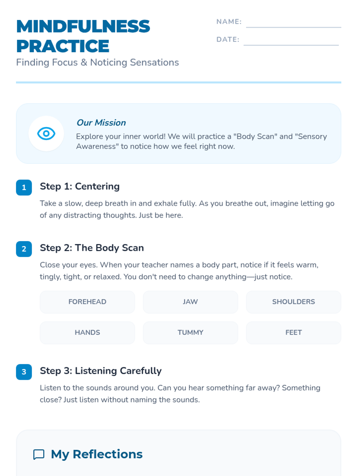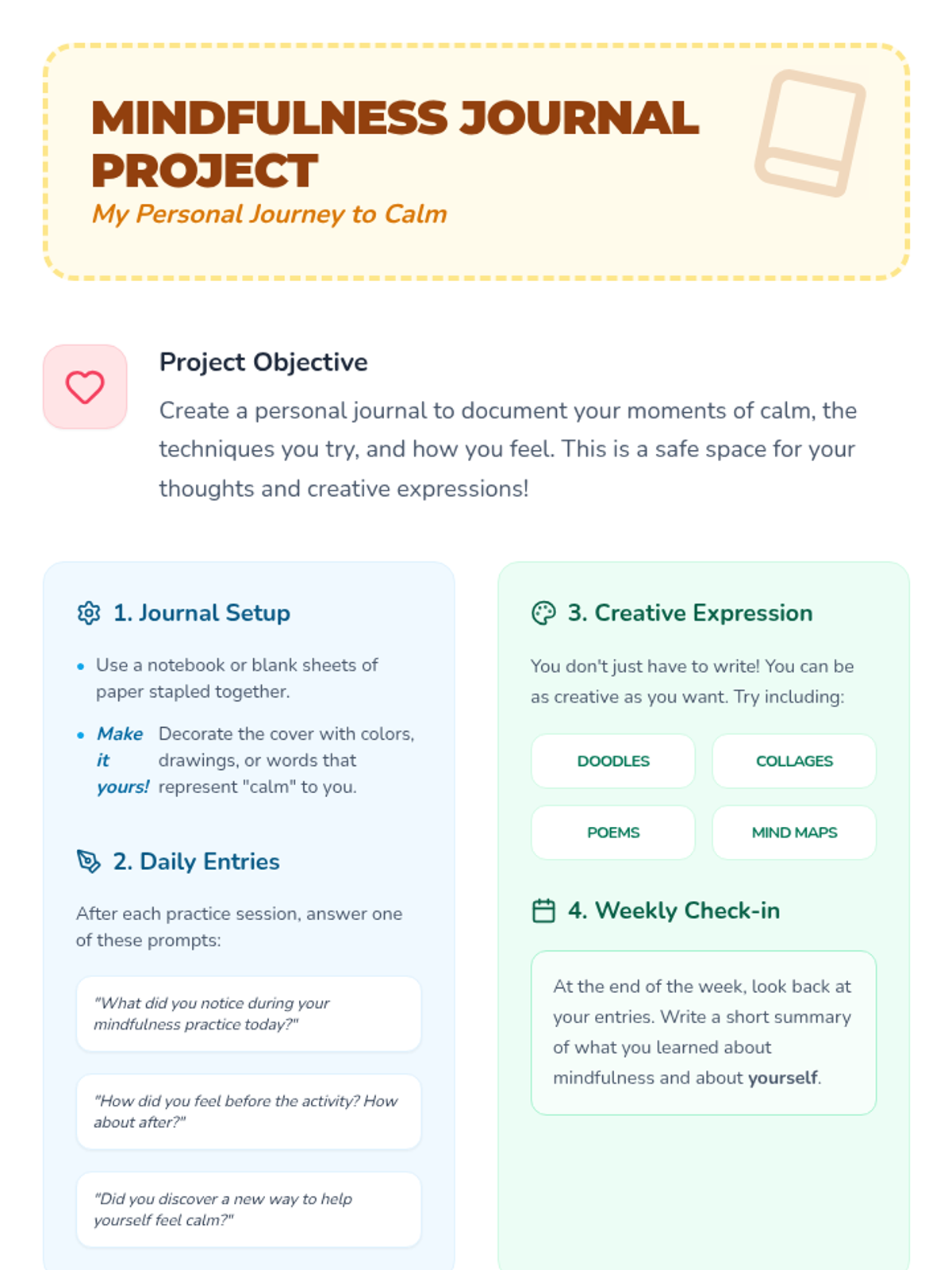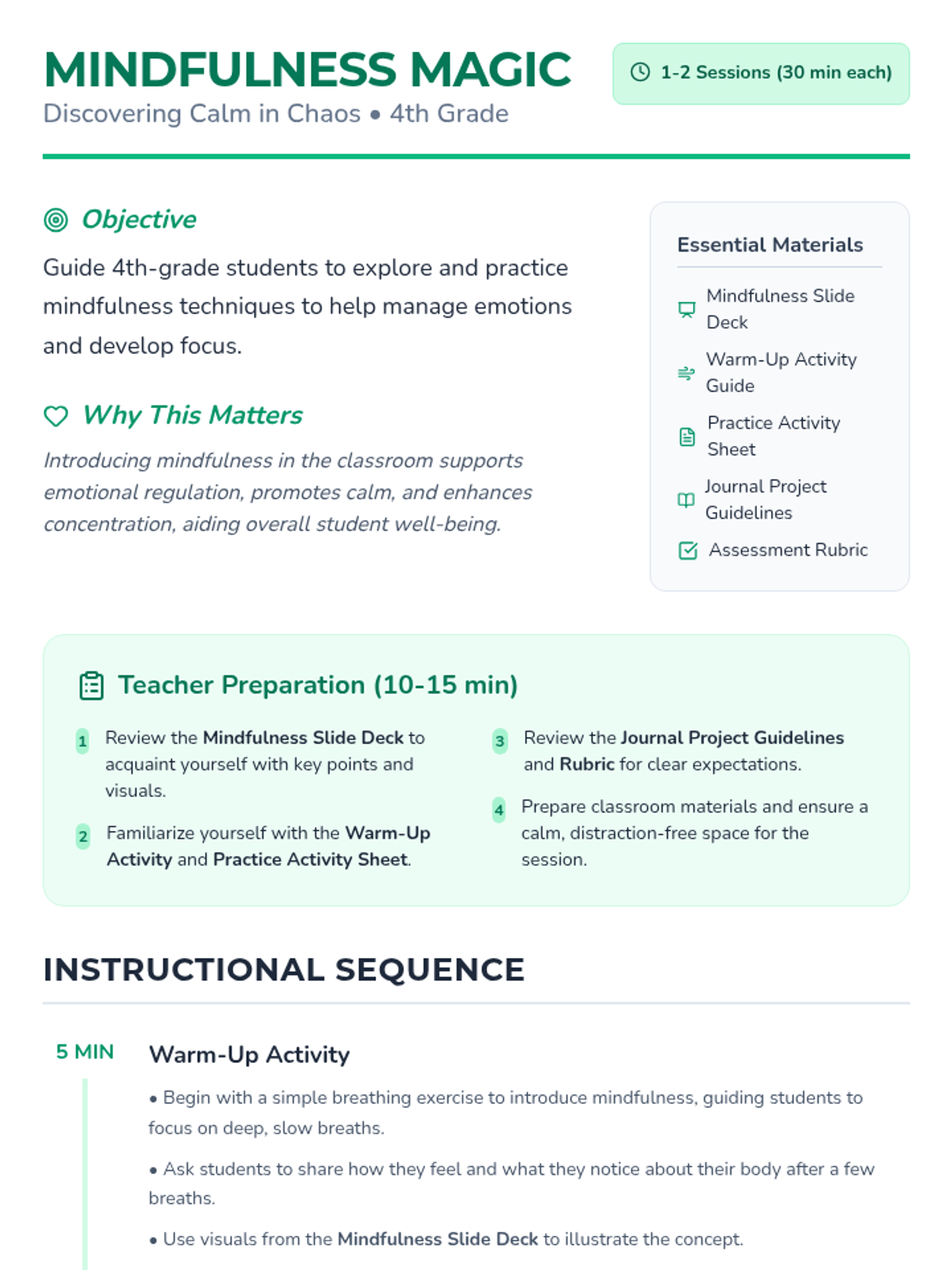 A calming, introductory lesson for 4th graders to explore mindfulness techniques, emotional regulation, and focus through guided practice, multimedia, and a creative journal project.