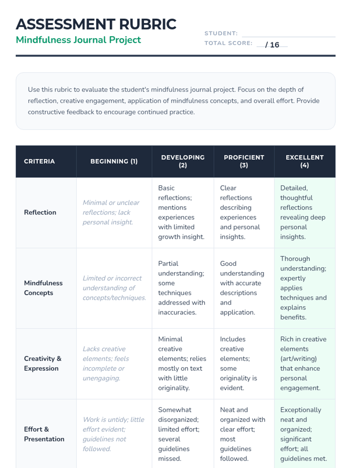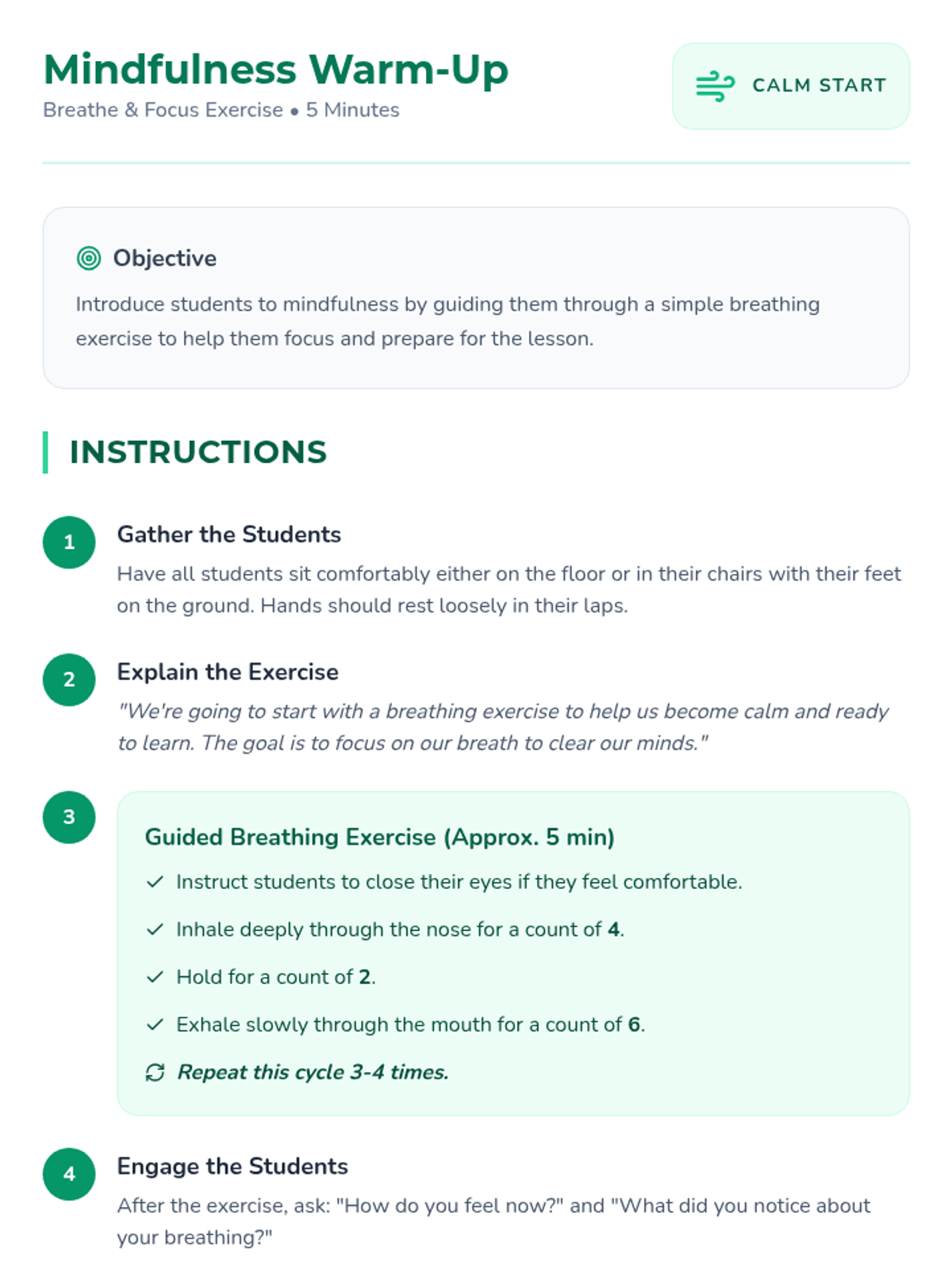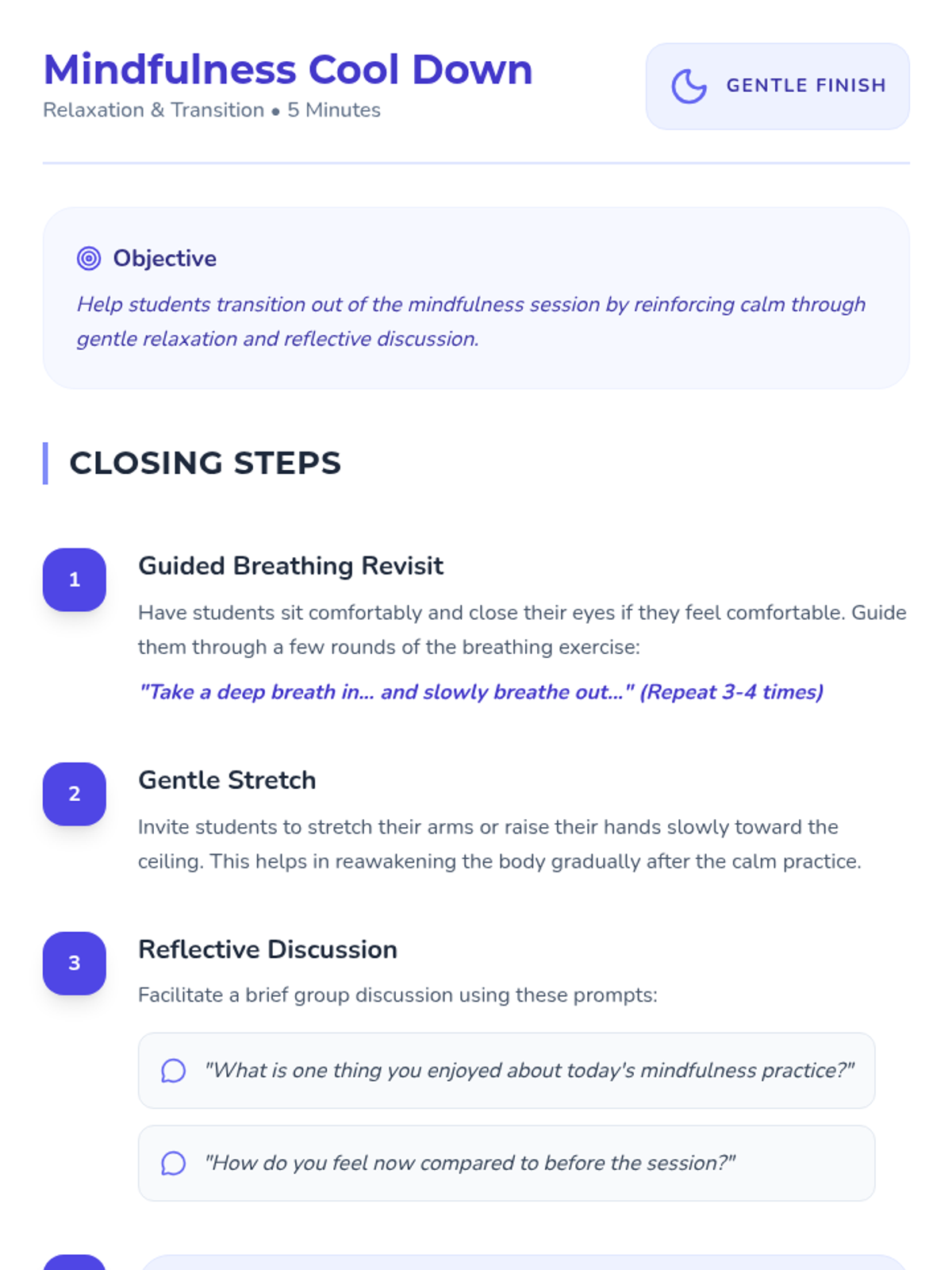 A calming, introductory lesson for 4th graders to explore mindfulness techniques, emotional regulation, and focus through guided practice, multimedia, and a creative journal project.