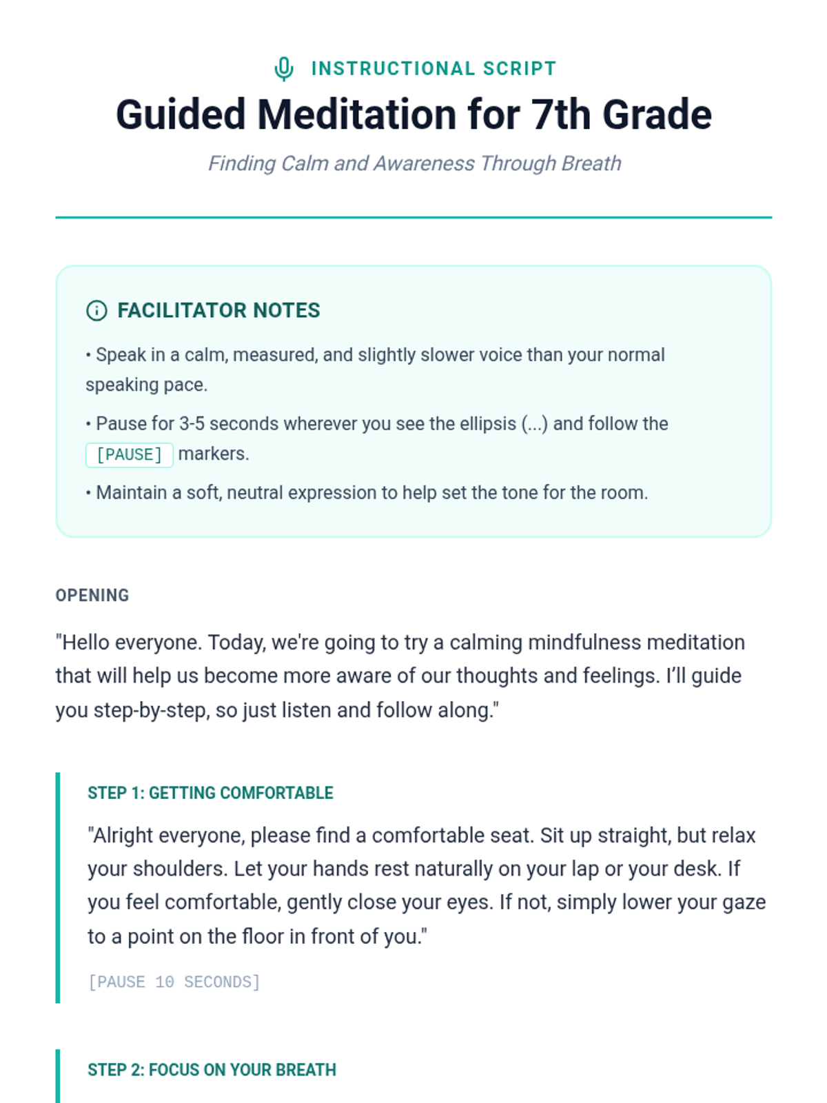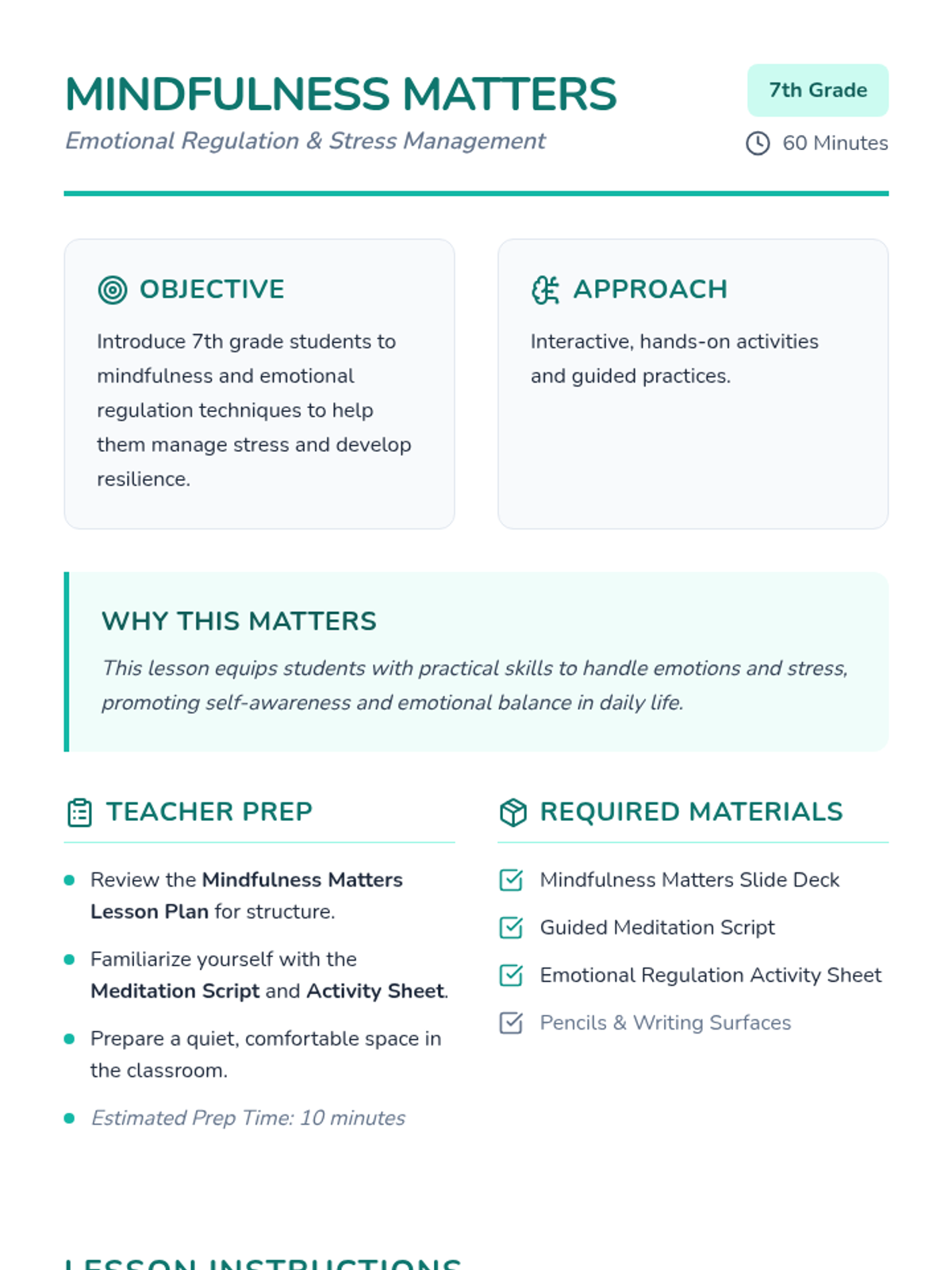 This lesson introduces 7th-grade students to mindfulness and emotional regulation techniques, helping them manage stress and emotions effectively. It's crucial for developing self-awareness and resilience, empowering students to handle everyday challenges with calmness and clarity.