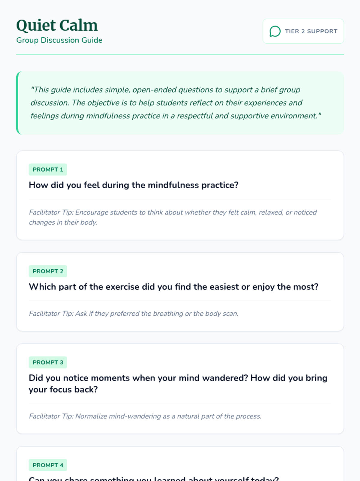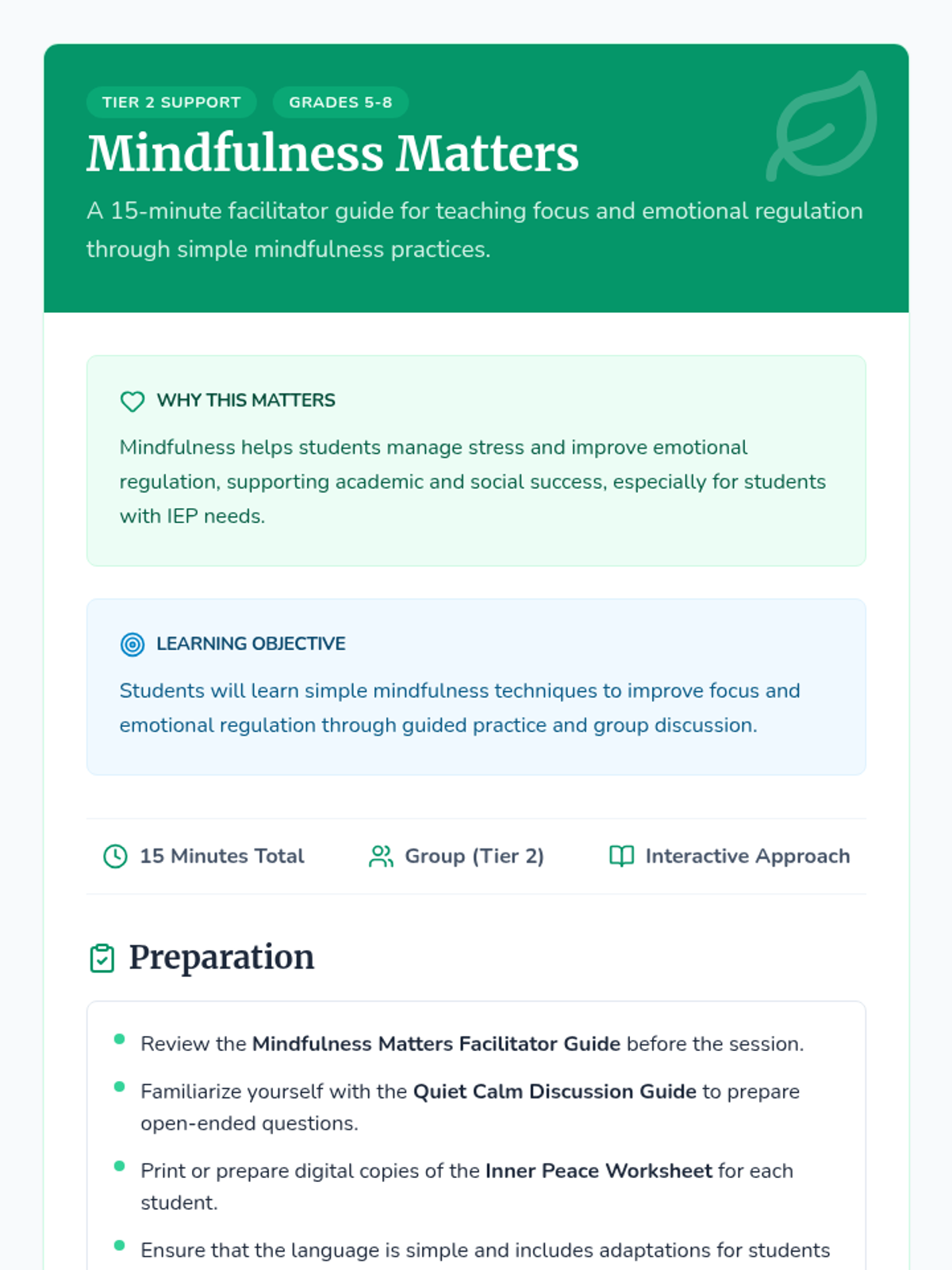 A 15-minute Tier 2 mindfulness lesson for middle schoolers, focusing on simple techniques for focus and emotional regulation with IEP-friendly language.