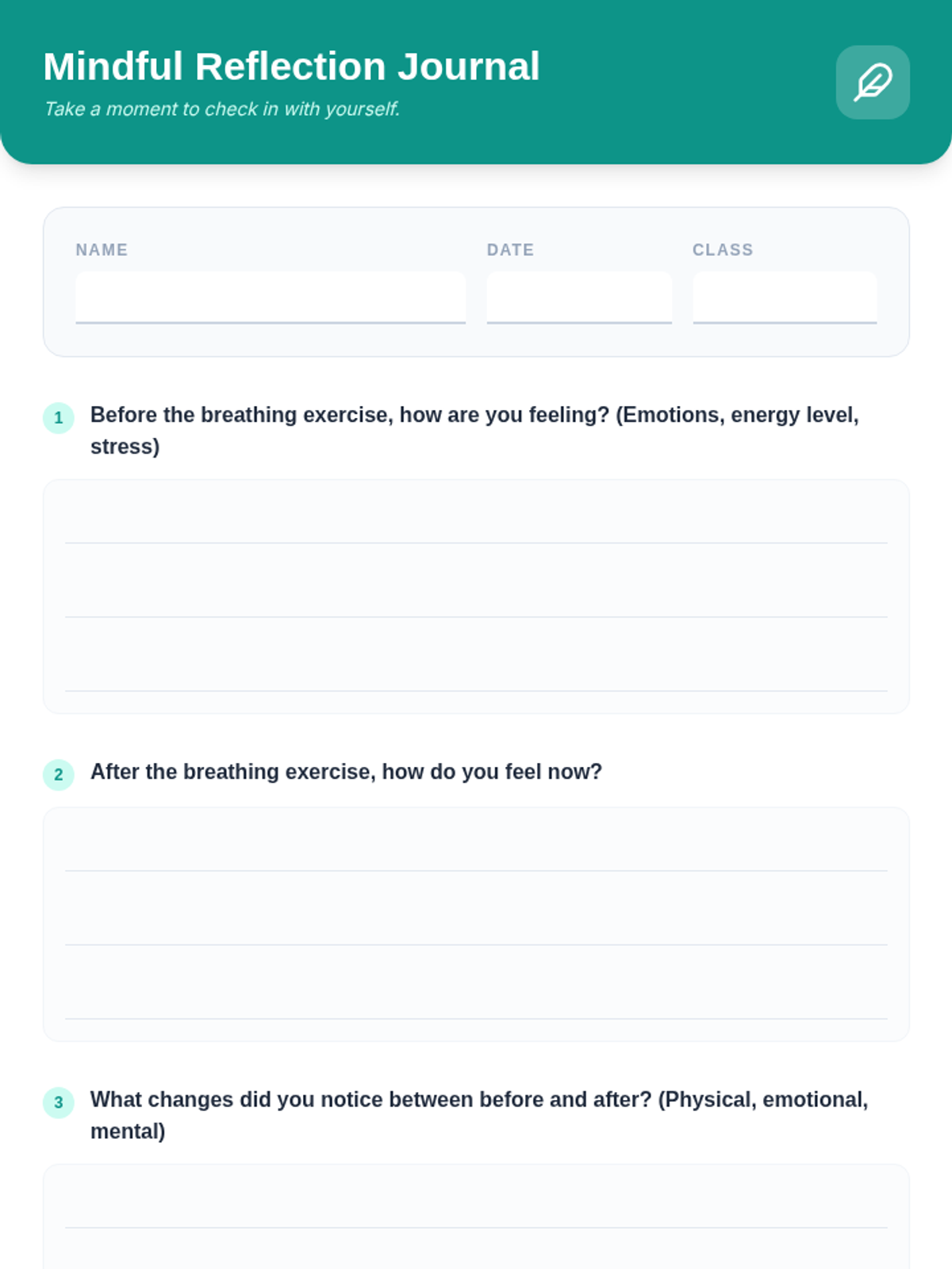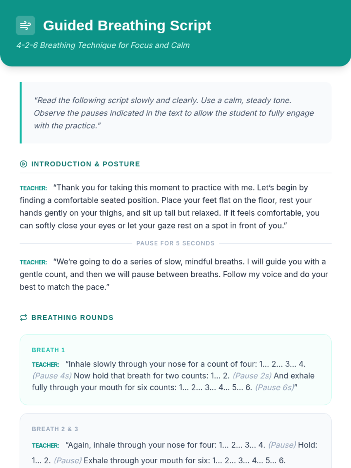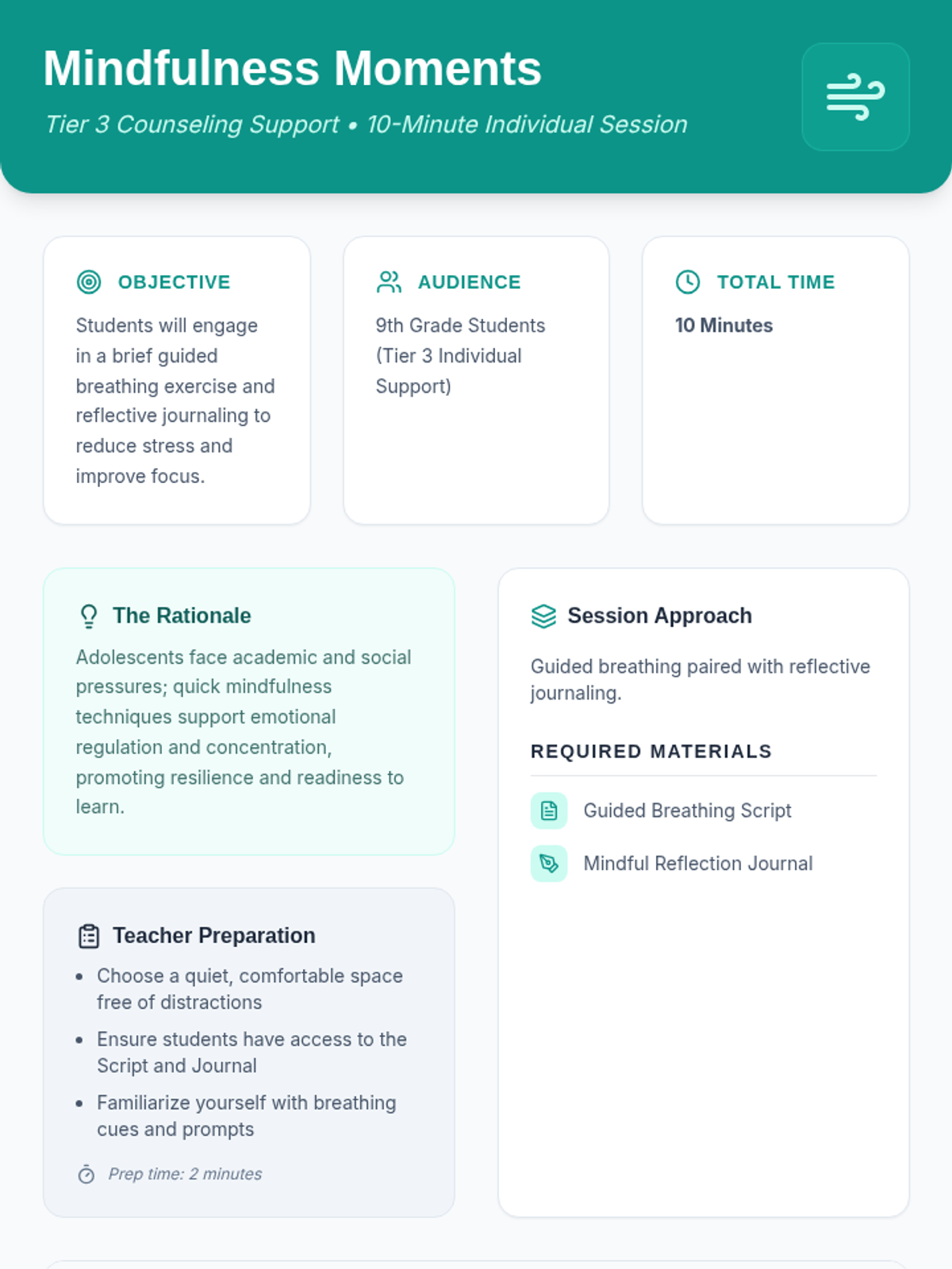 A 10-minute Tier 3 counseling session guide for 9th graders to practice quick mindfulness and breathing exercises for stress reduction and improved focus.