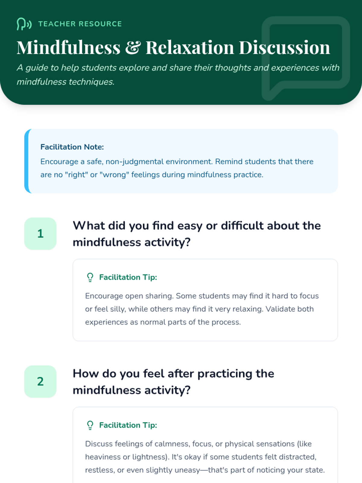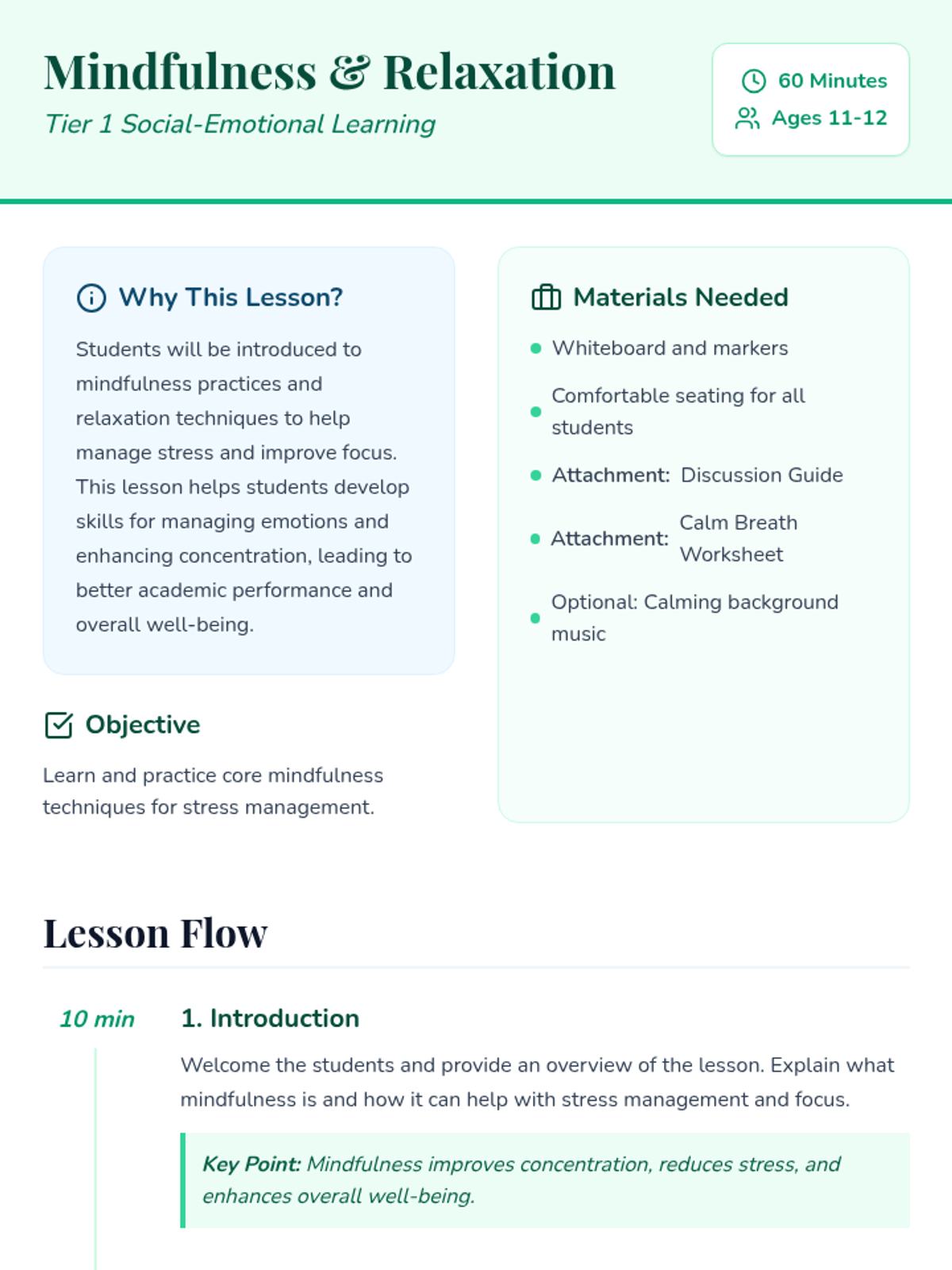 A Tier 1 lesson designed for preteens to explore mindfulness and relaxation techniques, aimed at reducing stress and improving focus through guided practice and discussion.
