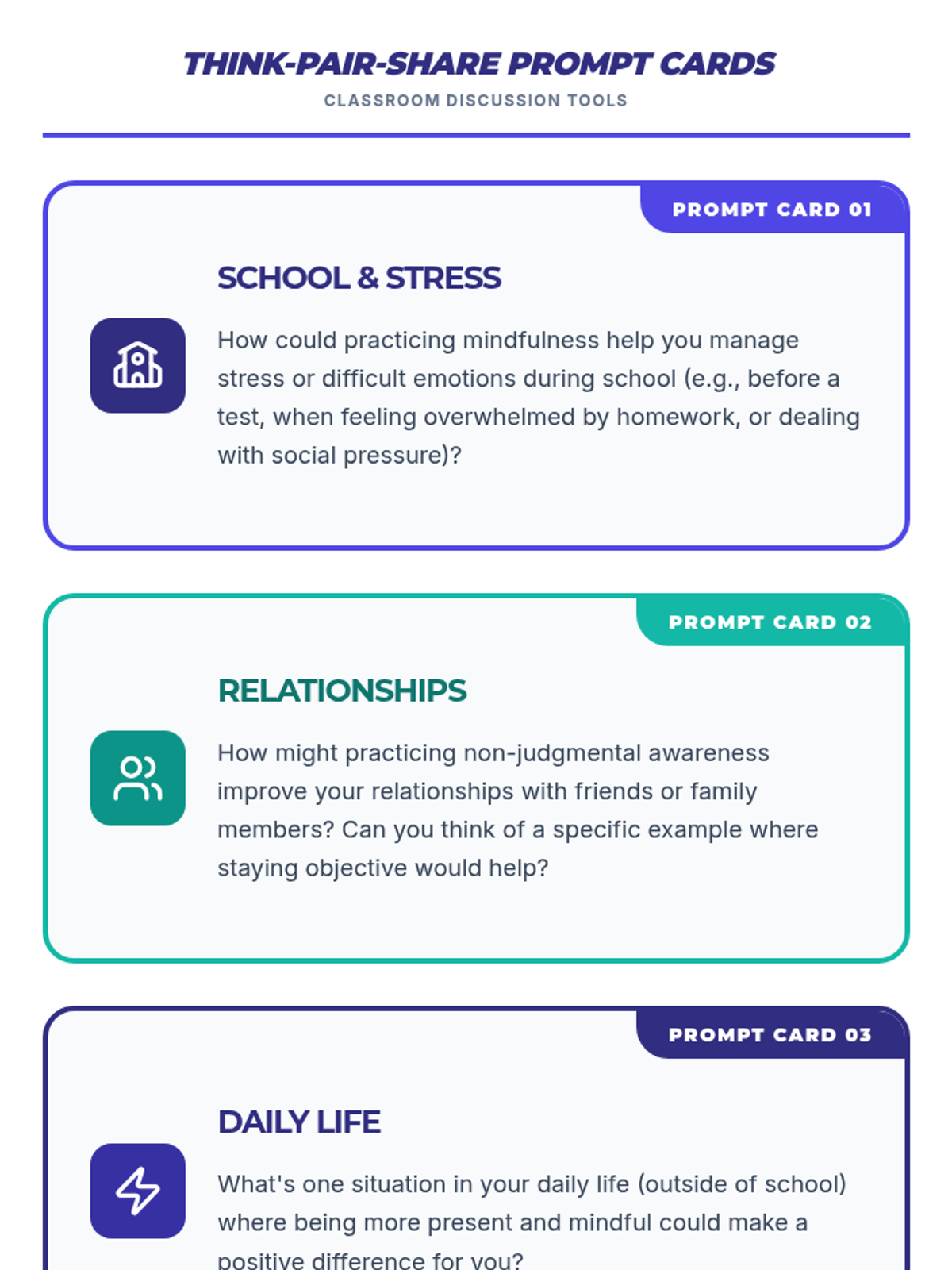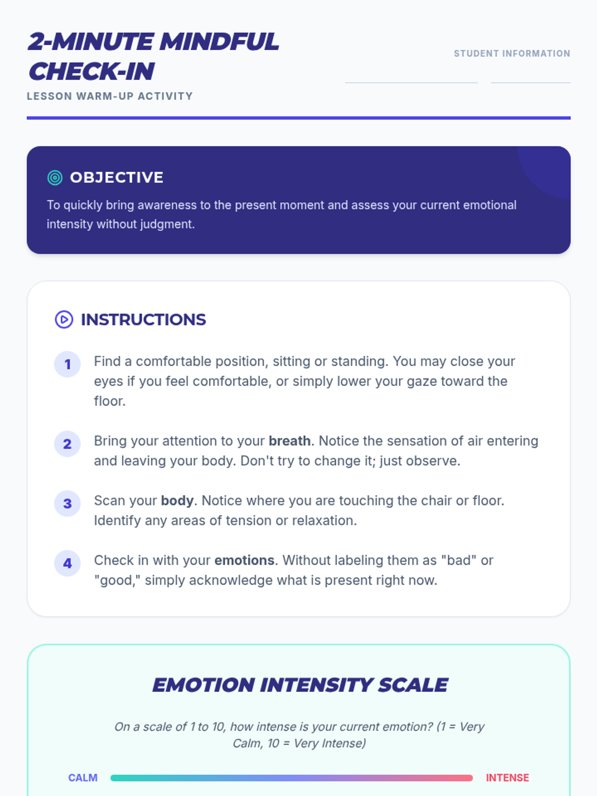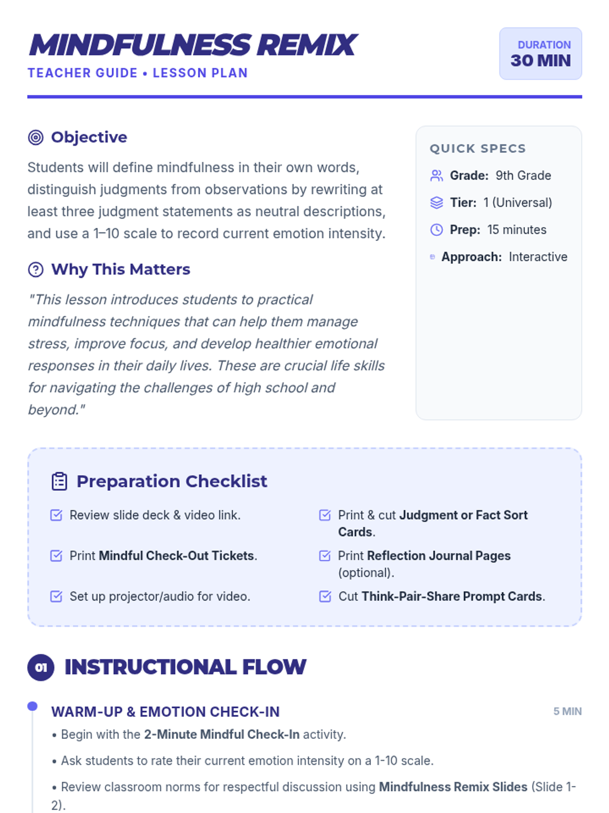 This lesson helps 9th-grade students define mindfulness, differentiate between judgments and observations, and check in with their emotions through interactive discussion and guided practice.