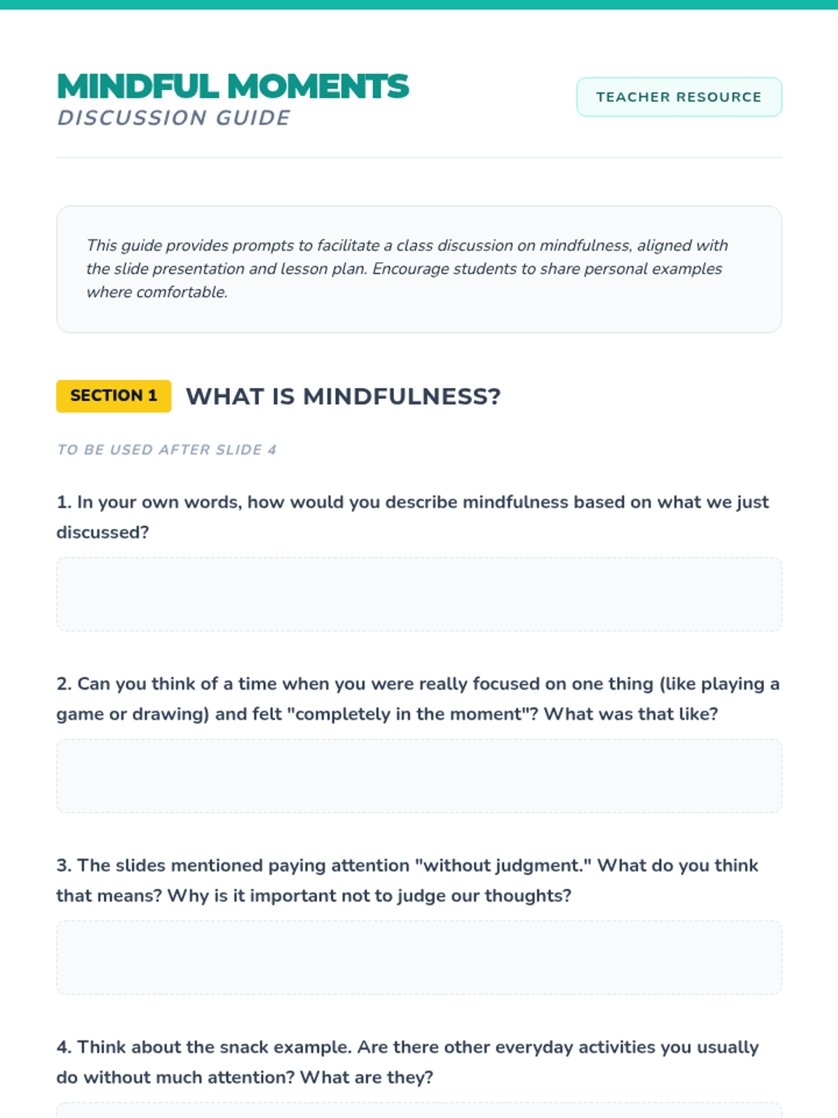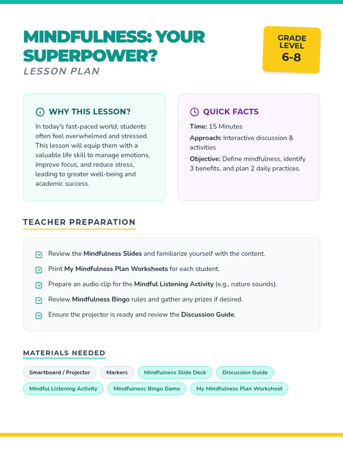 This 15-minute lesson introduces 6th-8th grade students to what mindfulness is, its incredible benefits, and practical ways to weave it into their daily lives. It uses a 'superpower' theme to engage students in developing emotional regulation and focus.