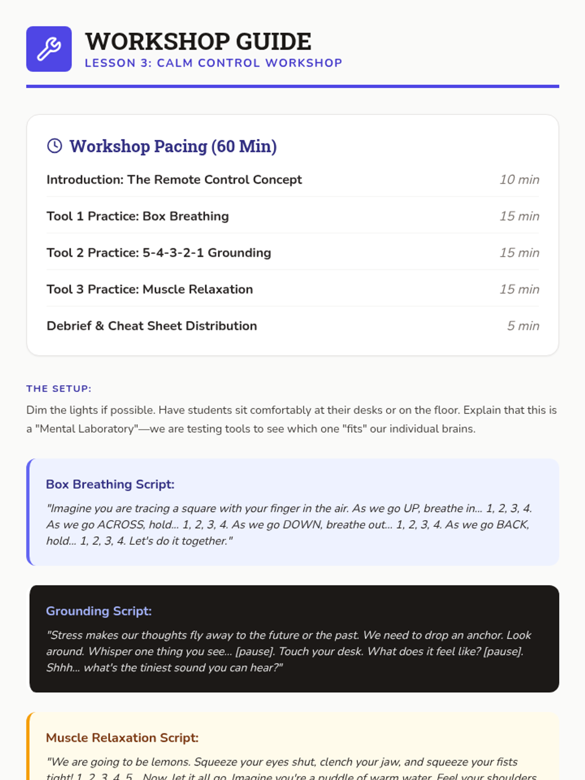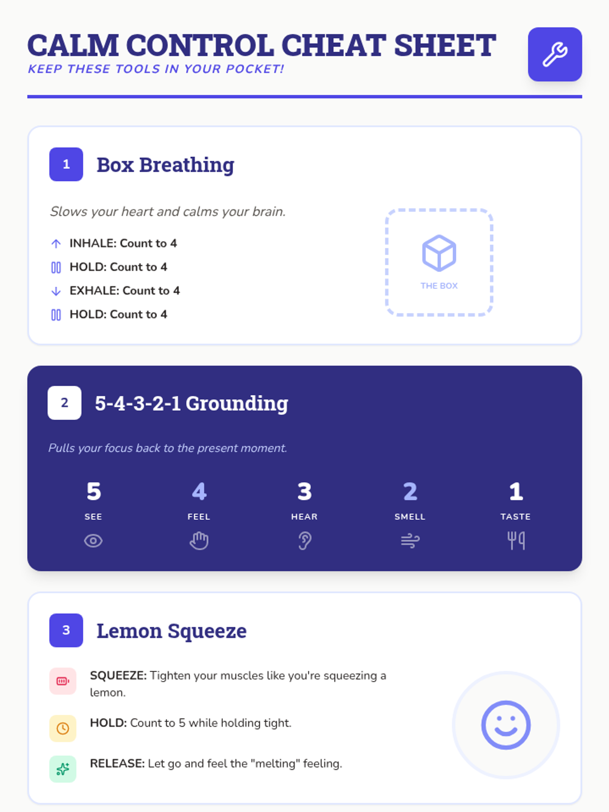 A practical workshop where students learn and practice Box Breathing, grounding techniques, and progressive muscle relaxation to build their emotional regulation skills.