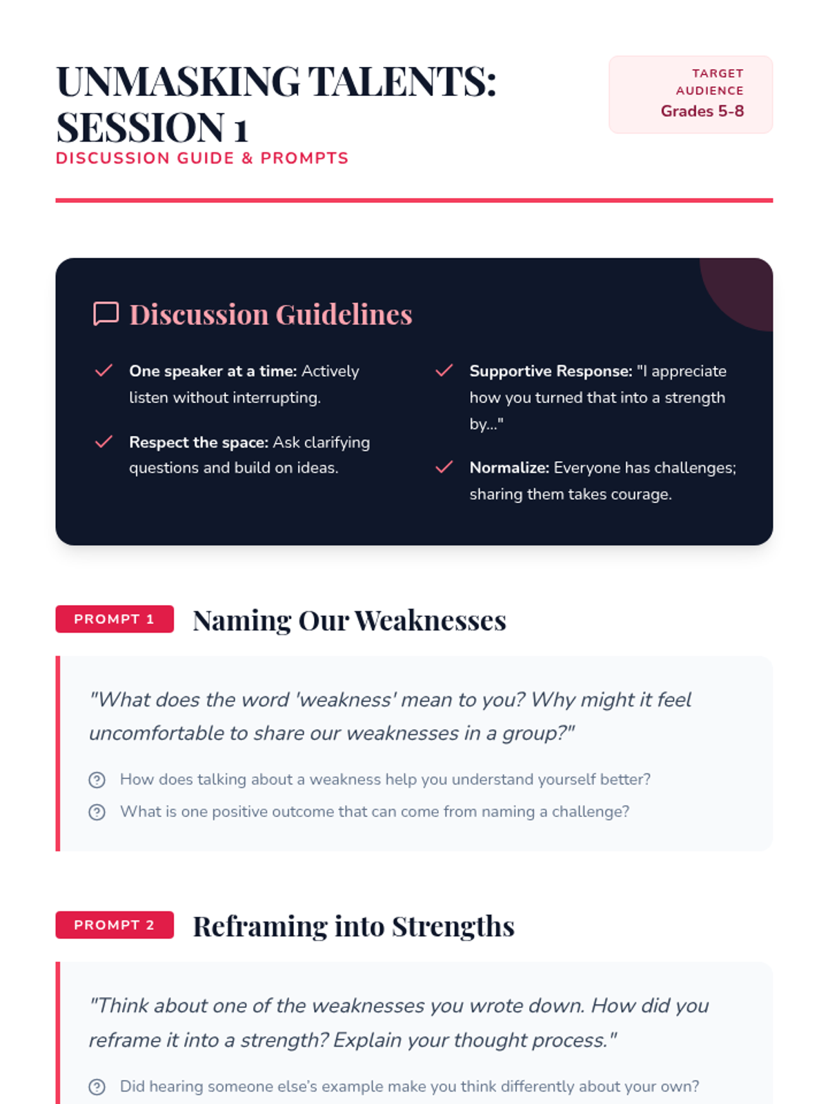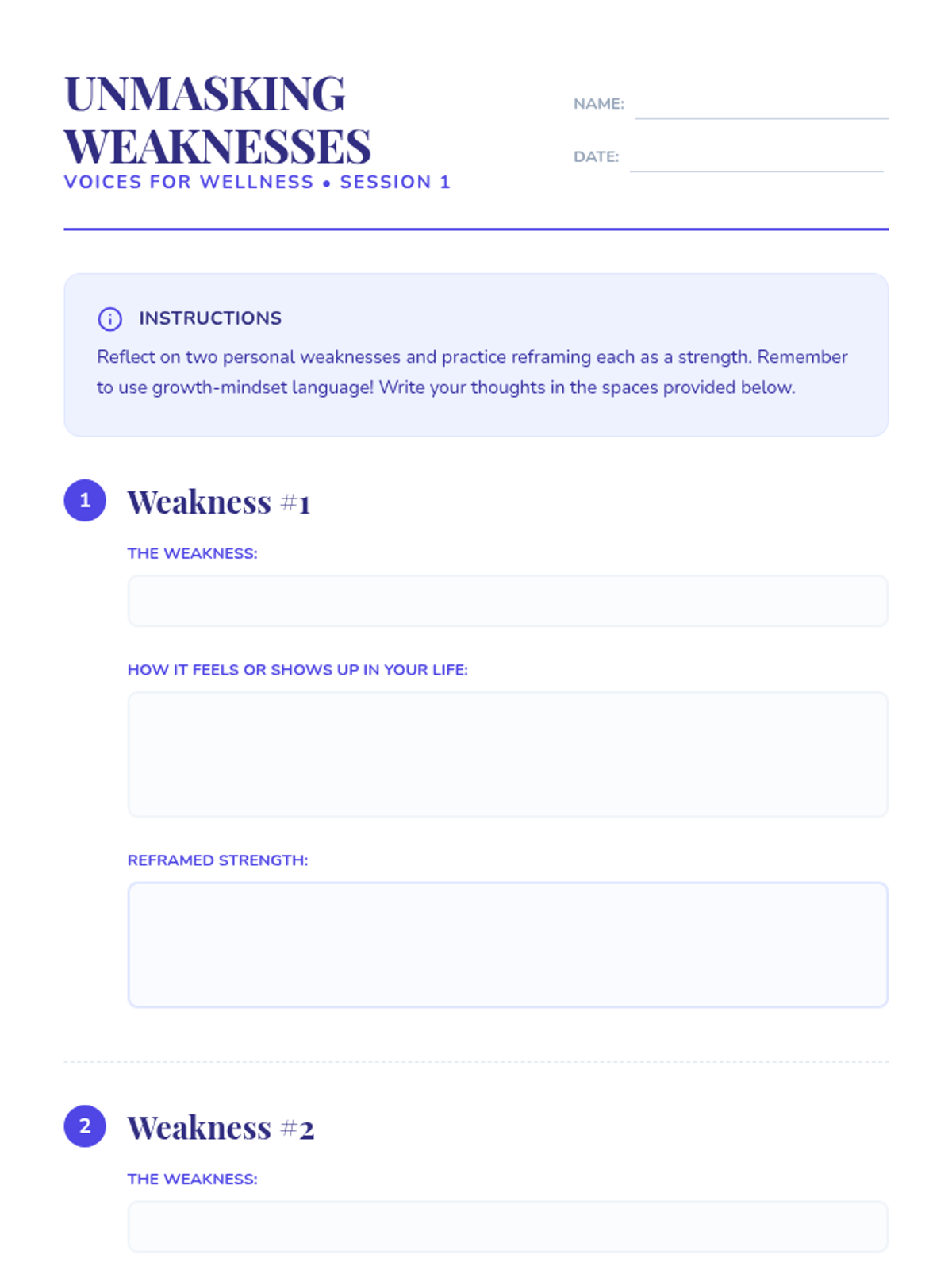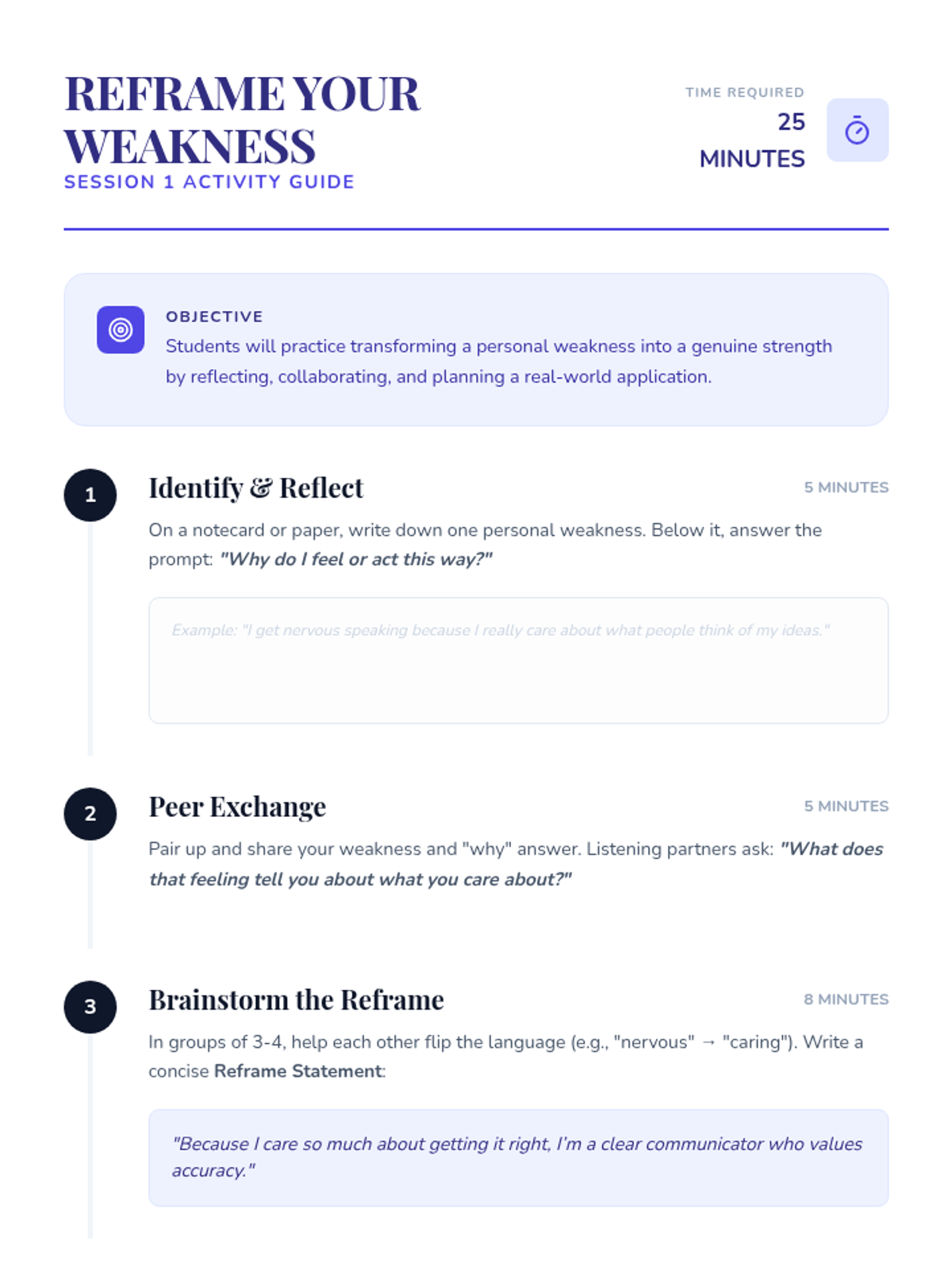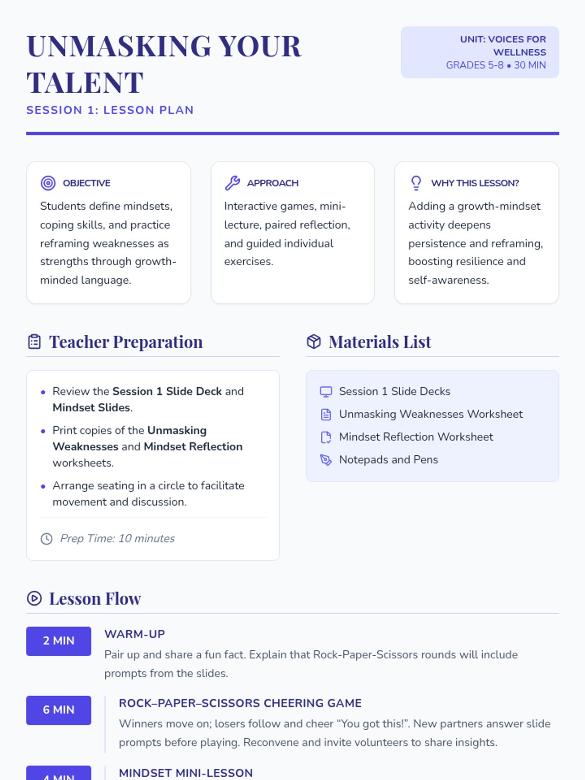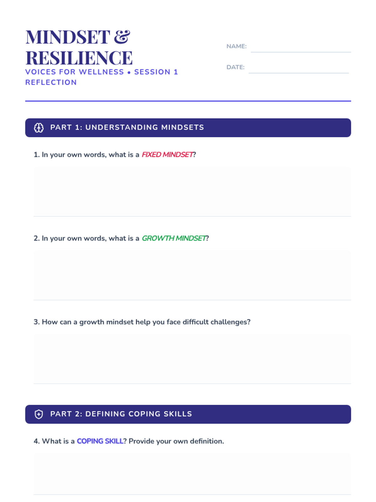 Students define fixed and growth mindsets, practice reframing personal weaknesses as strengths, and identify initial coping skills to build resilience.