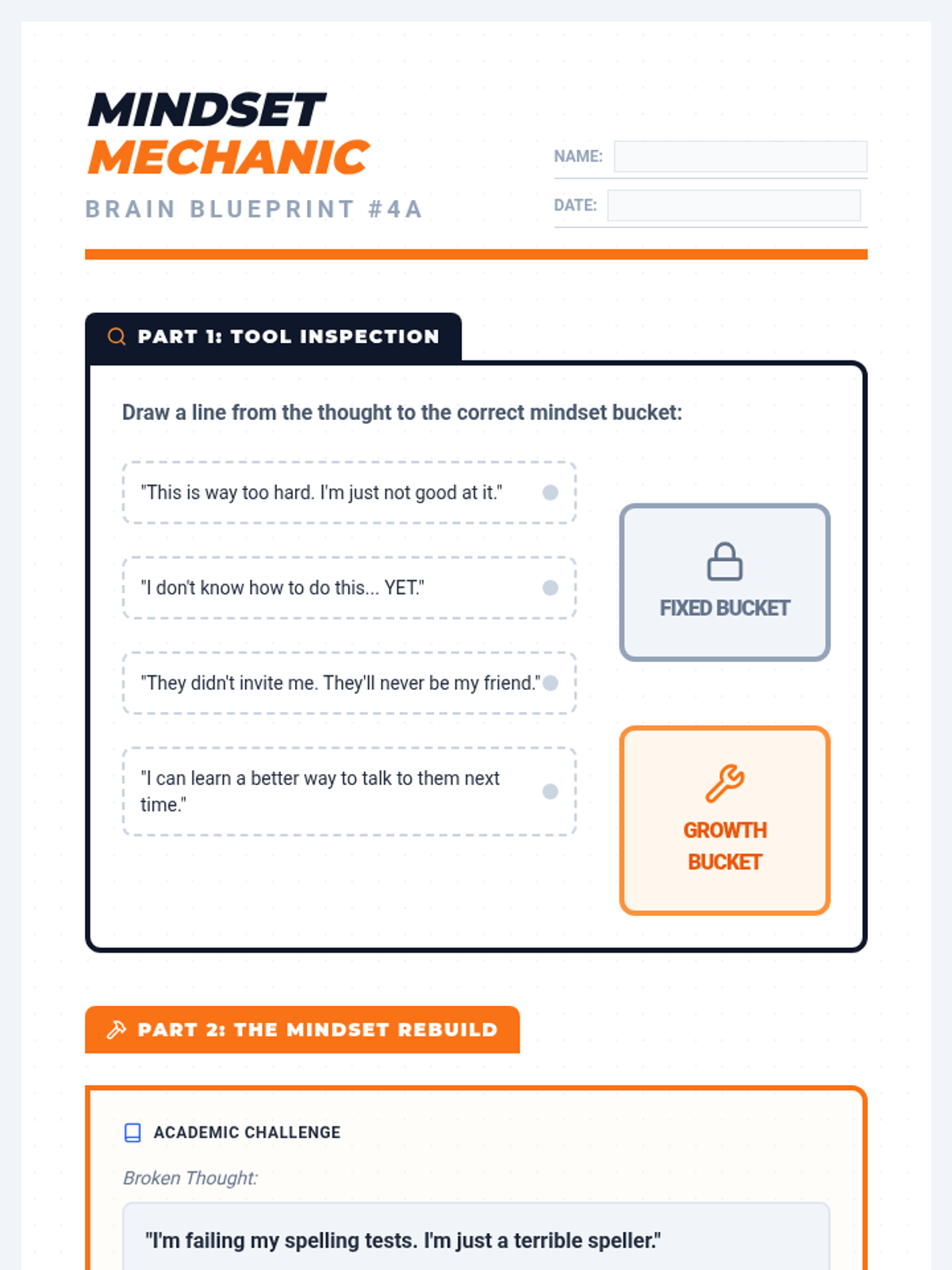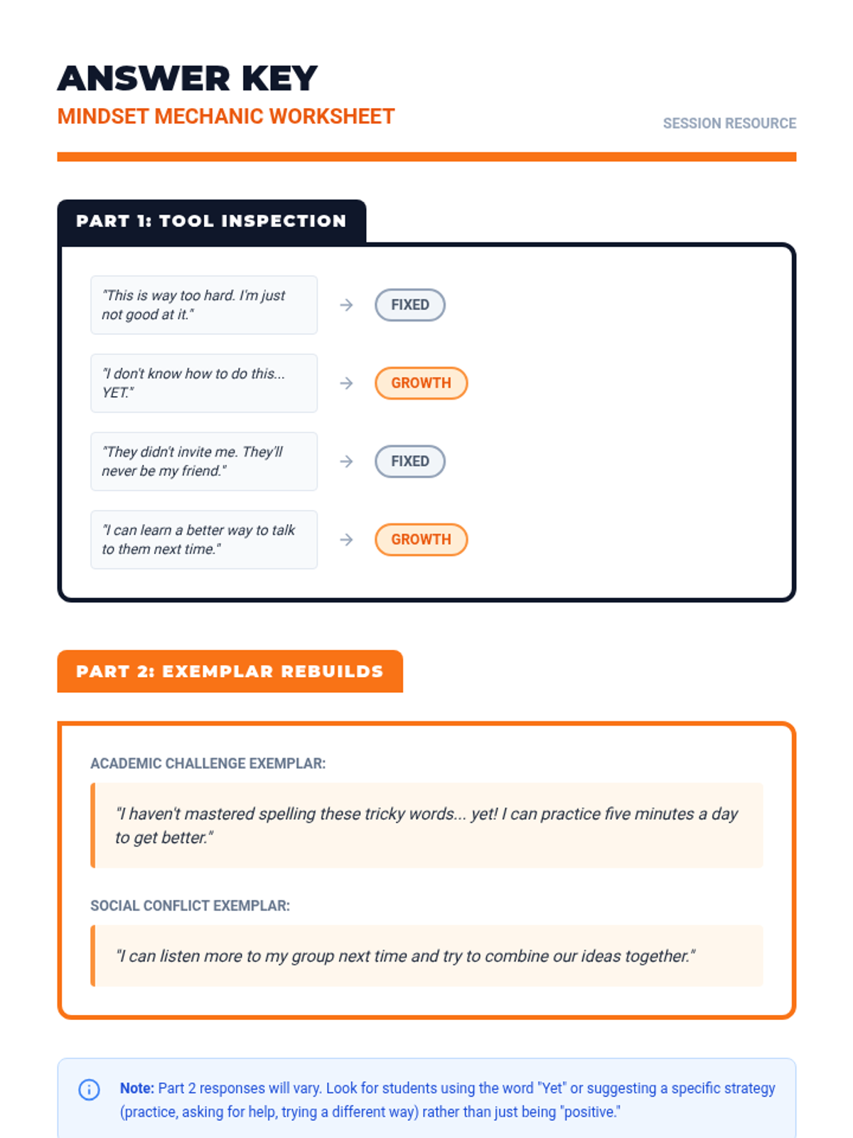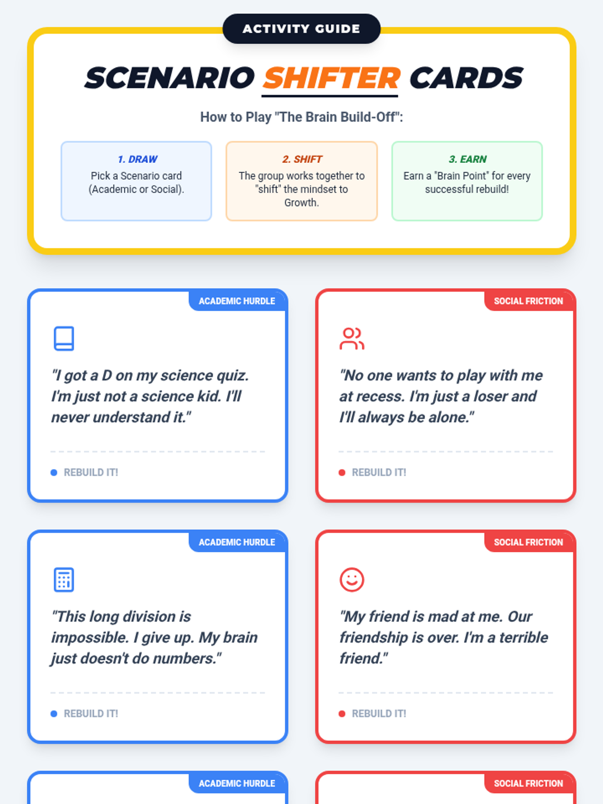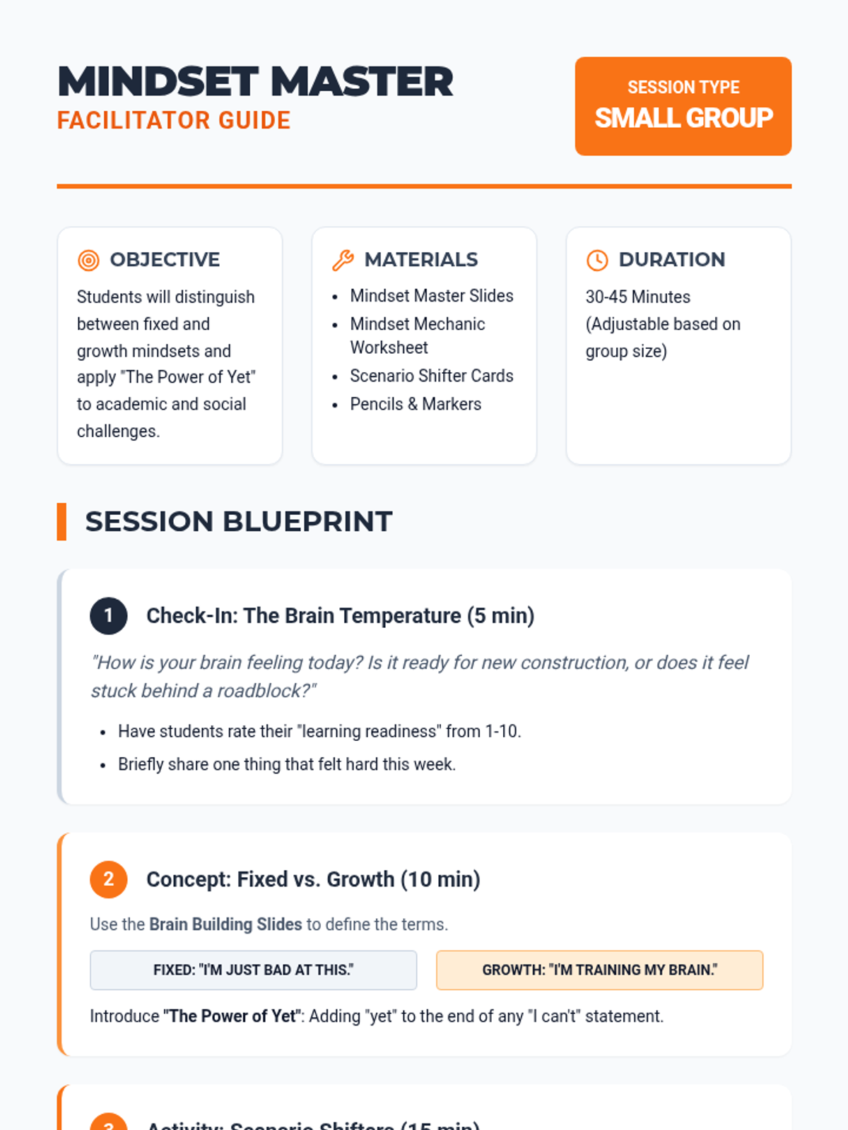 A single-session small group counseling lesson designed to help 4th graders transition from a fixed to a growth mindset, specifically focusing on academic hurdles and social disagreements. Students will learn to use 'The Power of Yet' and reframe challenges as opportunities for brain growth.