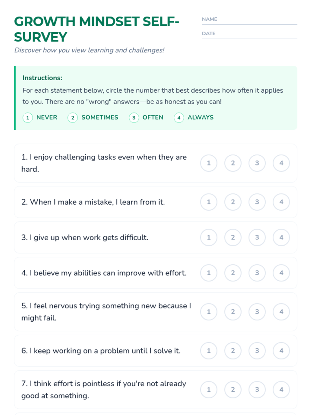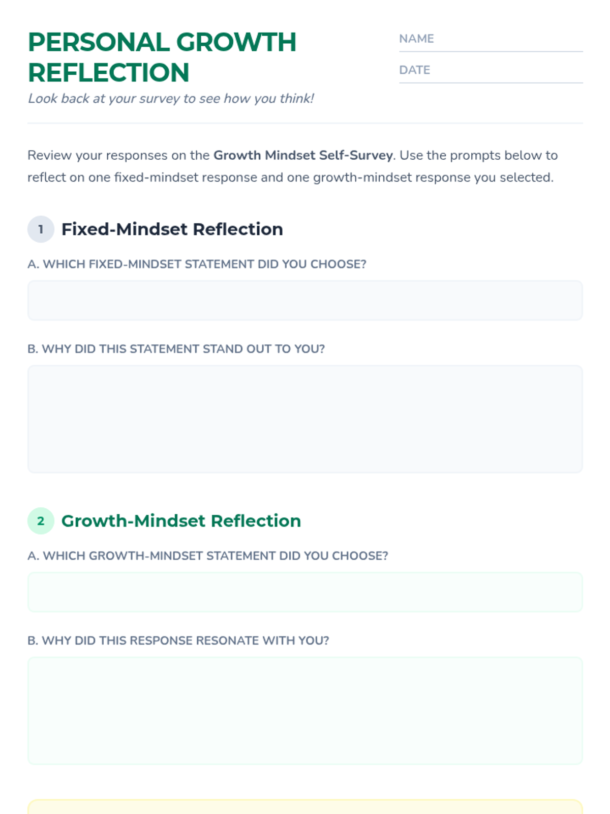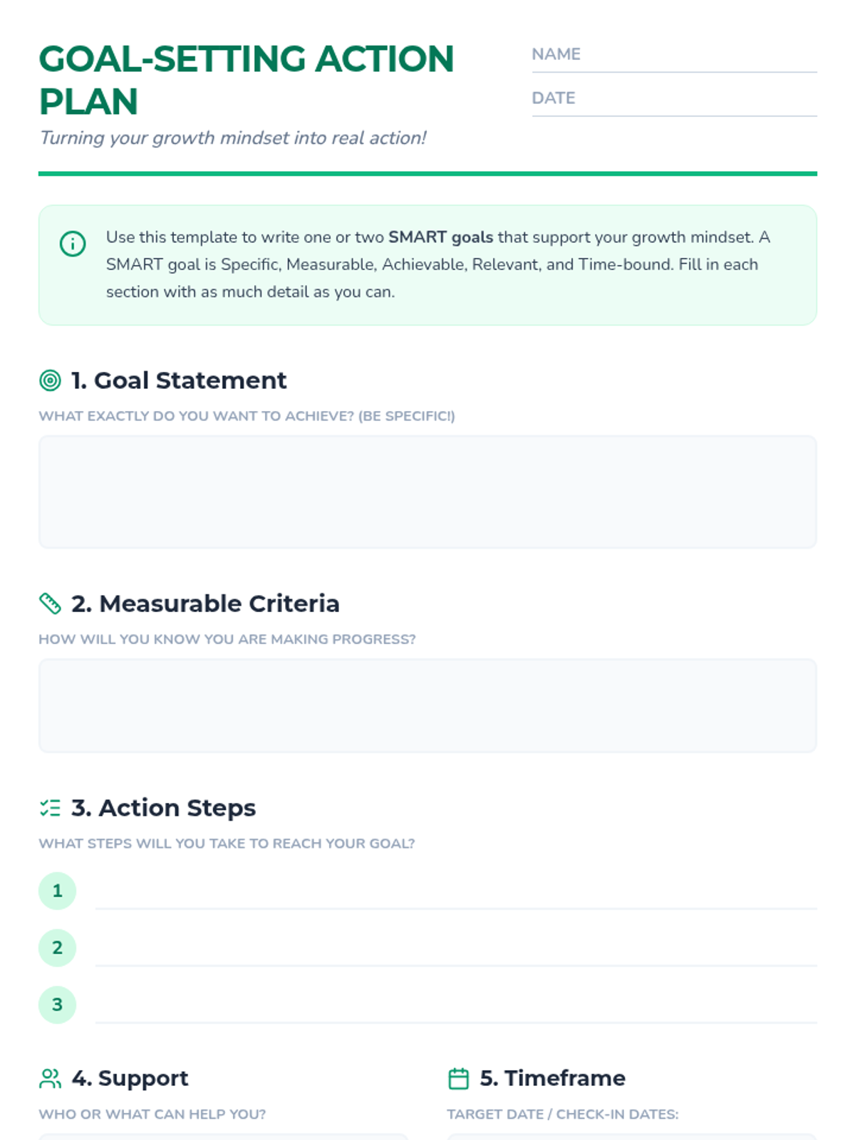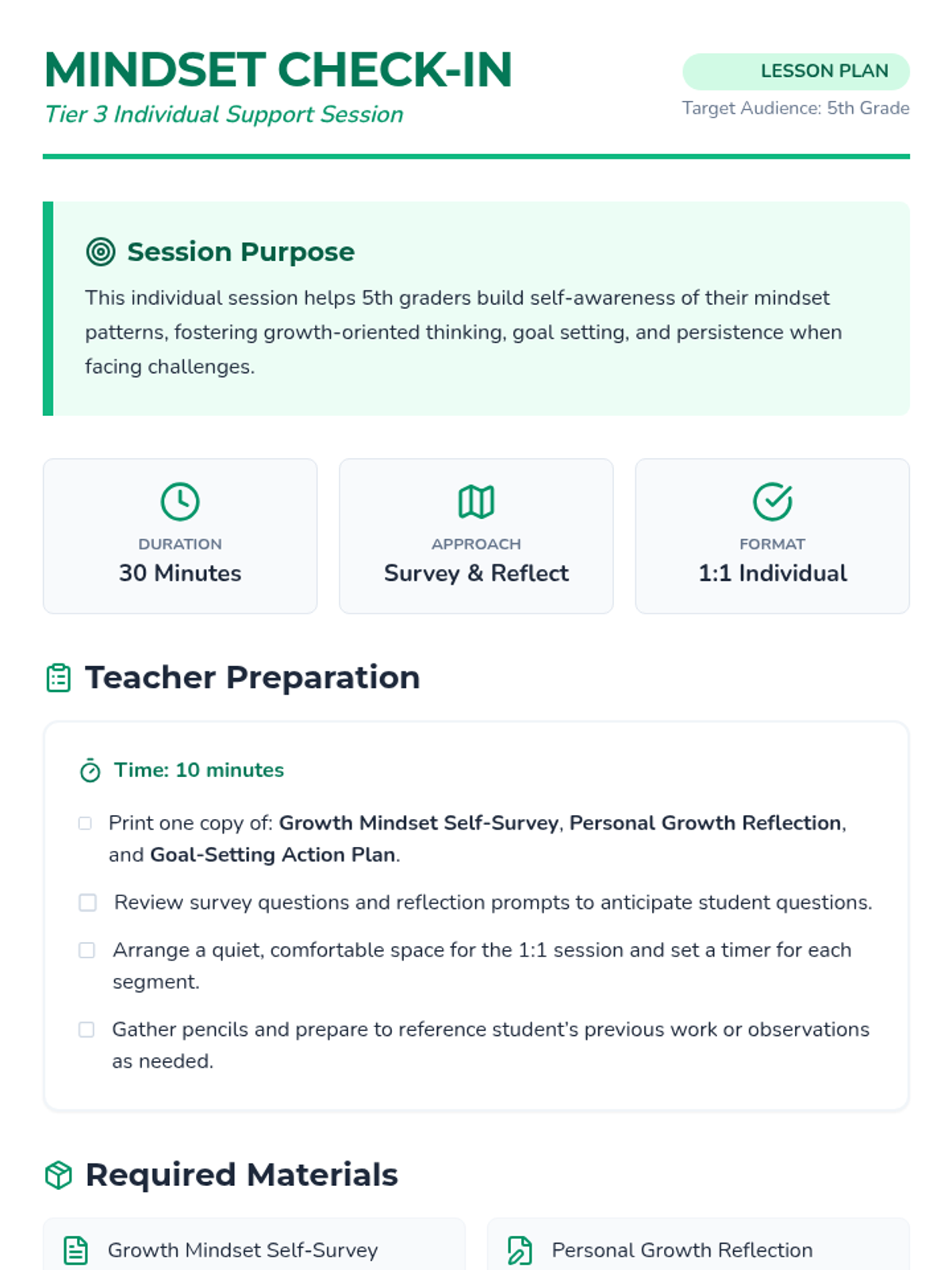 An individual Tier 3 session for 5th graders to identify mindset patterns, reflect on fixed vs. growth tendencies, and set SMART goals for resilience.