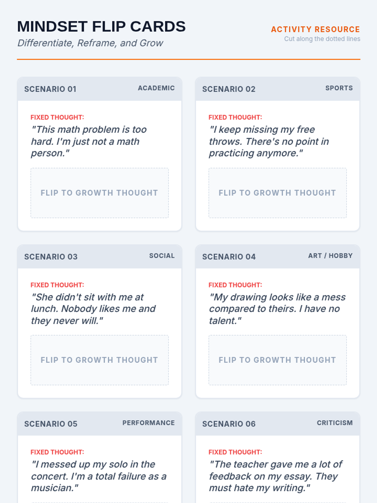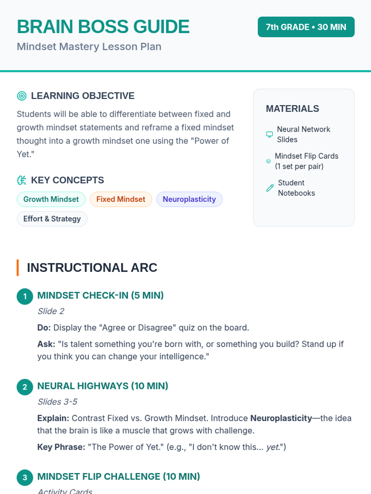 A 30-minute lesson for 7th graders to explore growth and fixed mindsets, learn about neuroplasticity, and practice reframing internal dialogue.