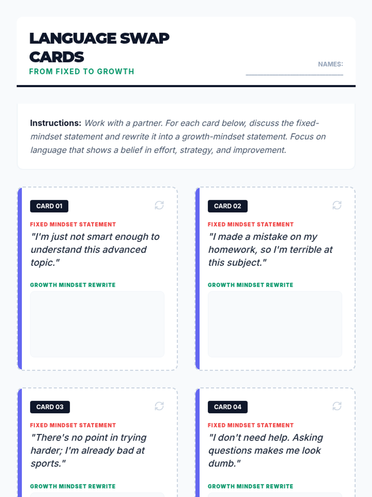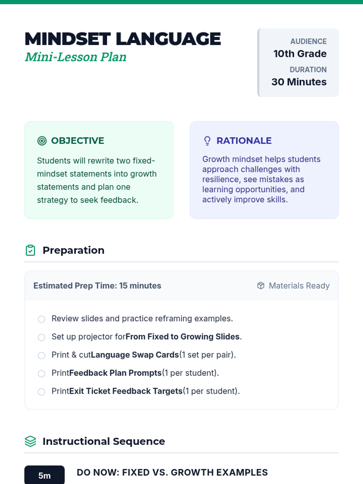 A 30-minute lesson for 10th-grade students to master the transition from a fixed to a growth mindset through language reframing and strategic feedback seeking.