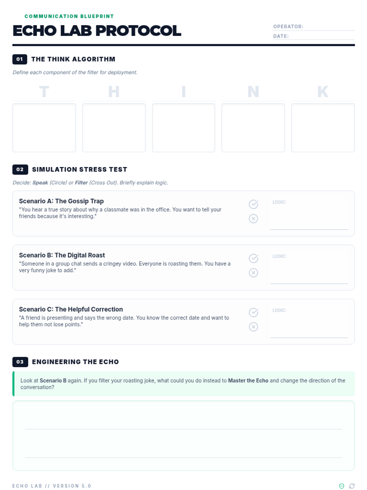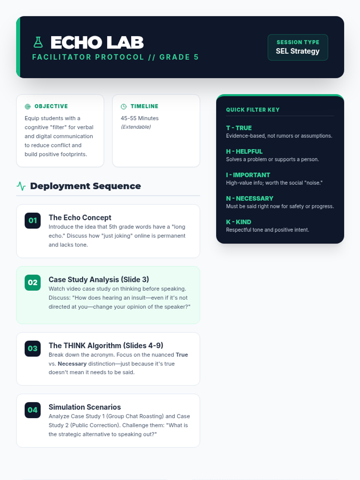 A communication strategy lesson for 5th graders centered on the THINK filter, focusing on digital citizenship, social dynamics, and the long-term impact of words.