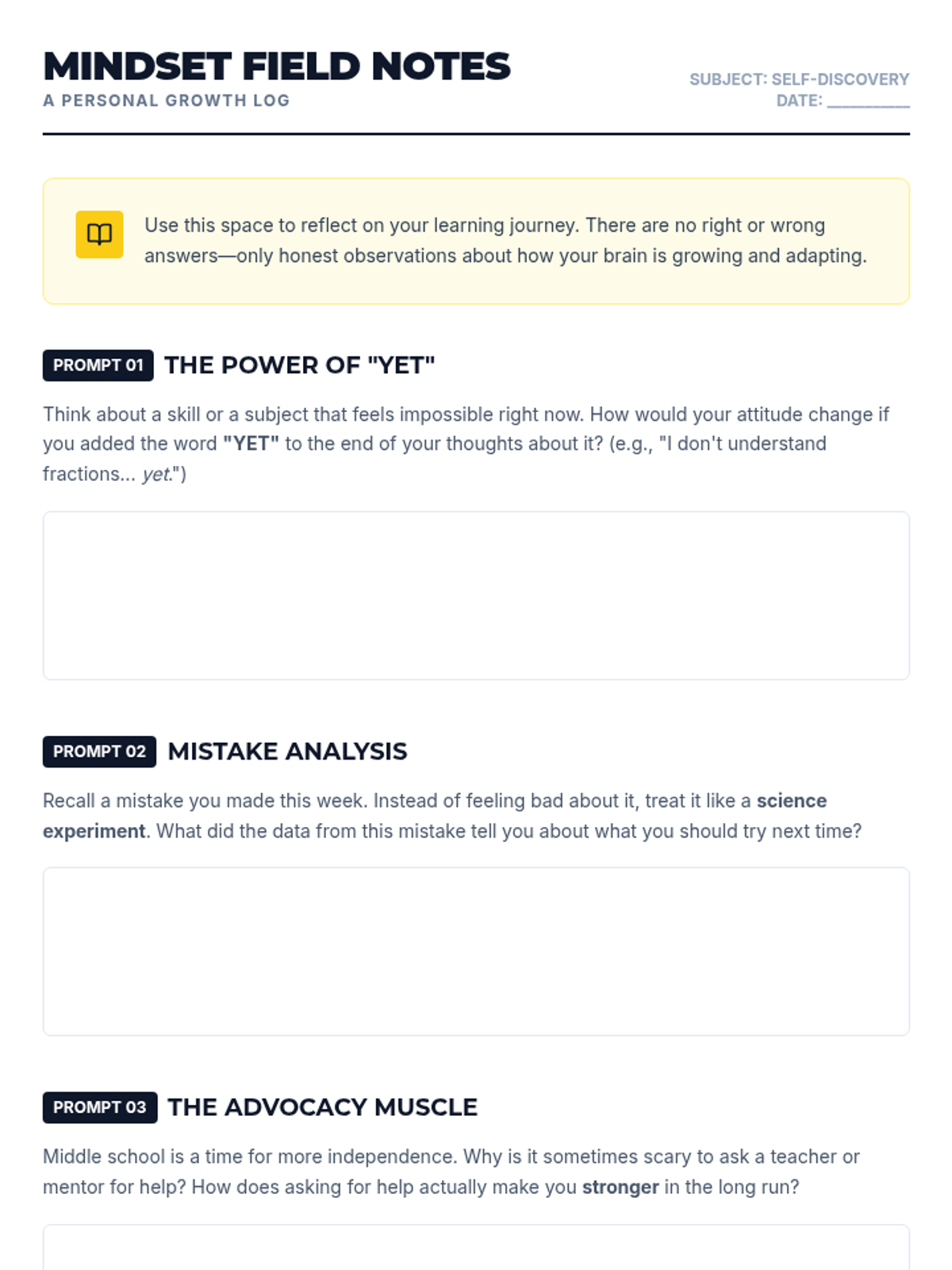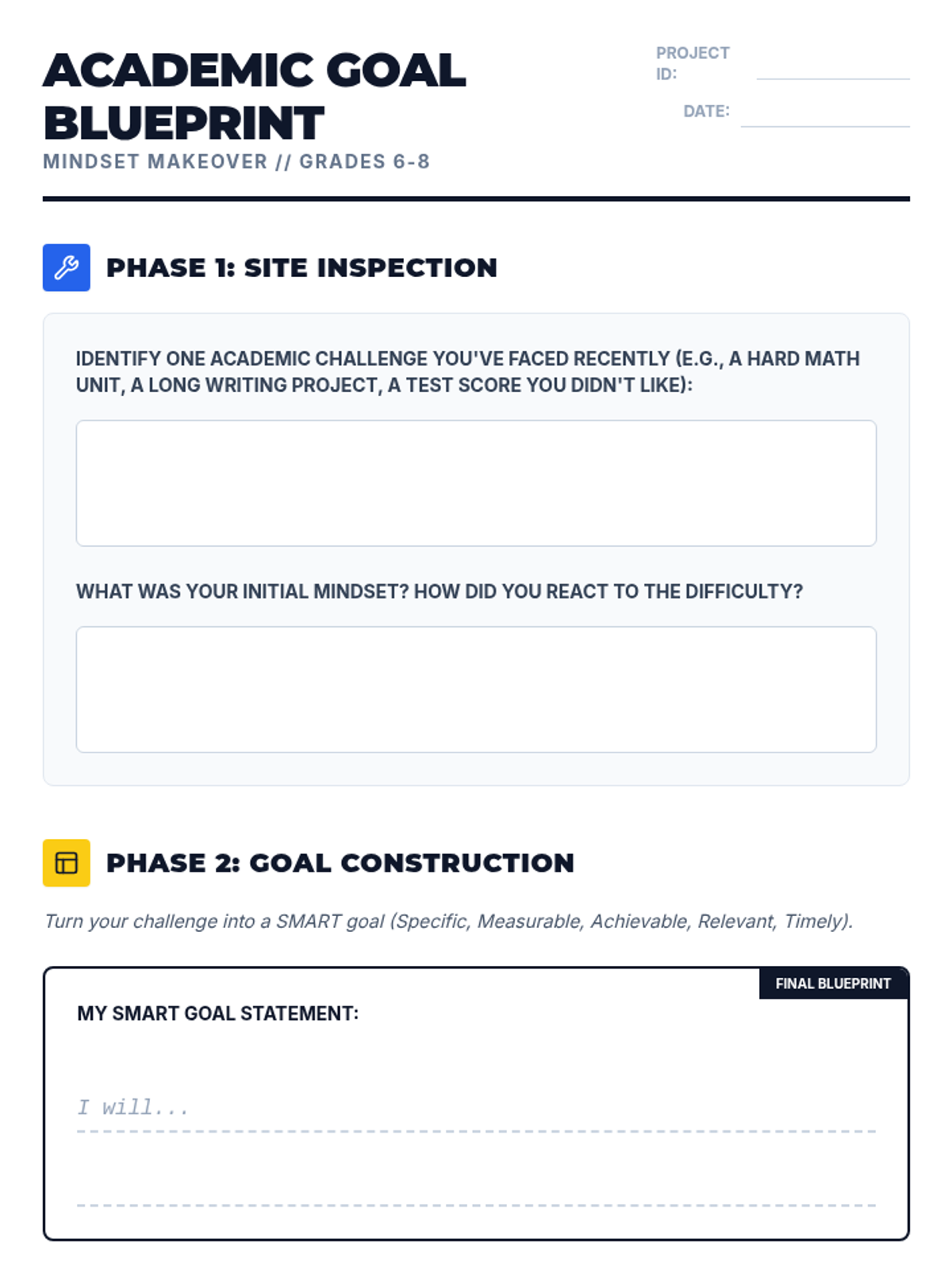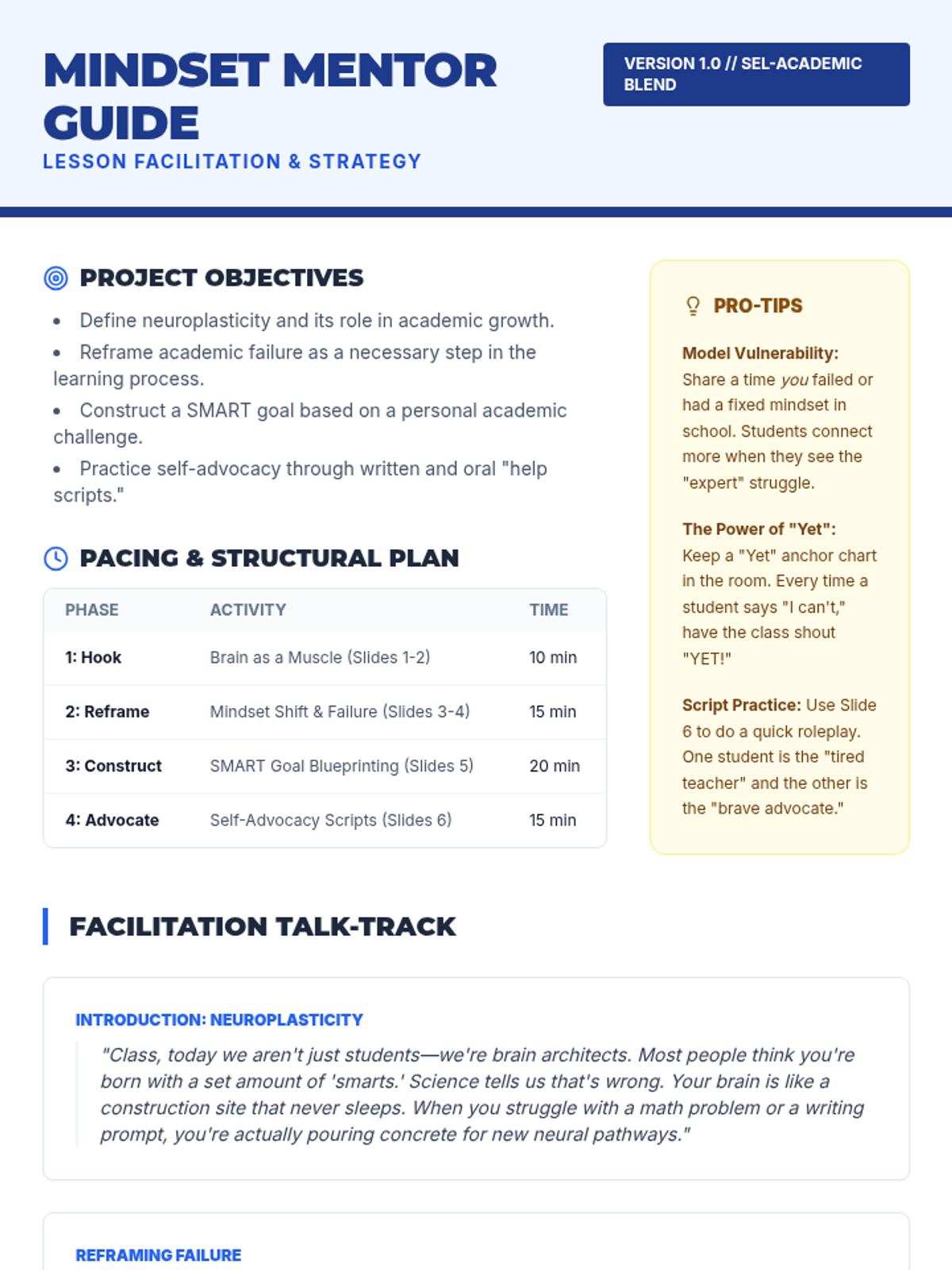 This lesson empowers middle school students to transform their approach to learning by reframing failure, setting SMART academic goals, and mastering self-advocacy. Students will explore the neuroplasticity of the brain and develop practical strategies for overcoming academic hurdles.