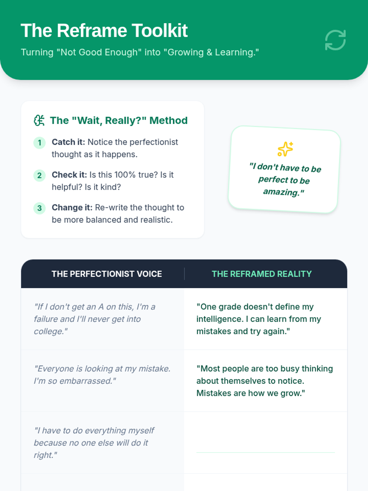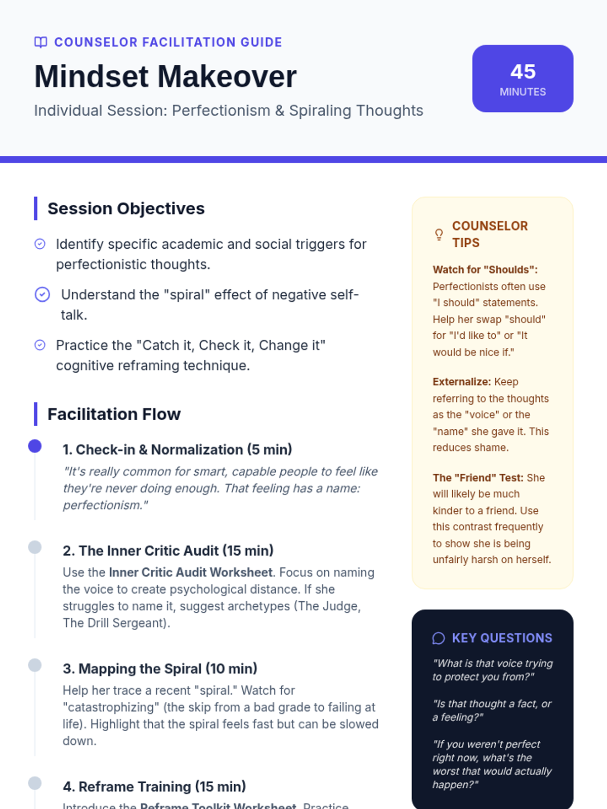 A comprehensive counseling session focused on helping a 15-year-old female identify perfectionist triggers, manage spiraling thoughts, and build a toolkit of positive self-talk reframes.