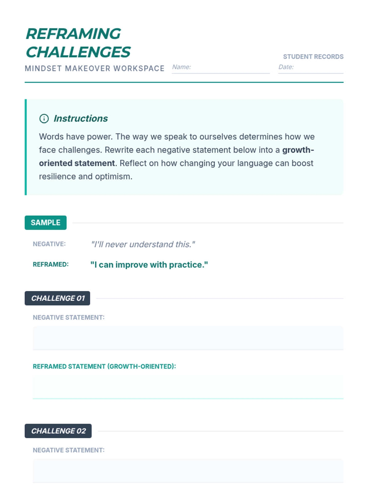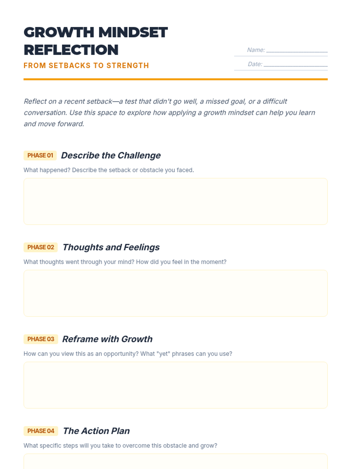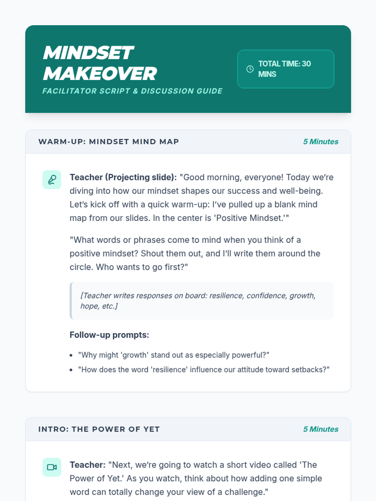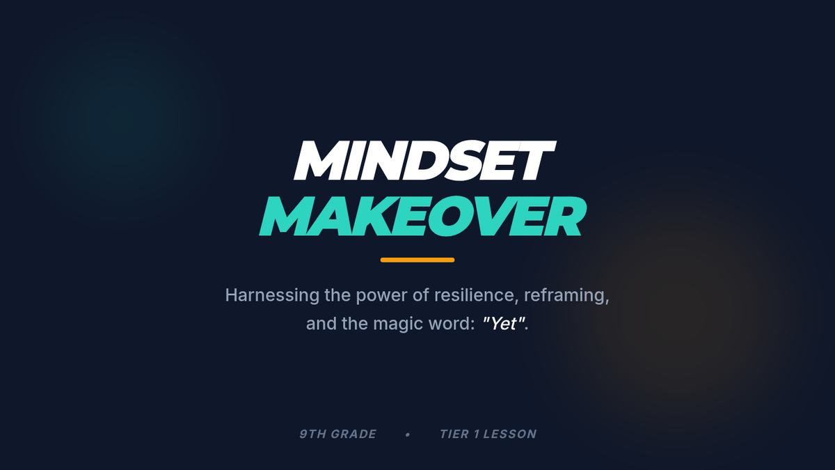 A 30-minute Tier 1 lesson for 9th graders that introduces the concept of growth mindset and provides practical strategies for reframing challenges. Students will learn the 'power of yet' and practice turning negative self-talk into opportunities for resilience.