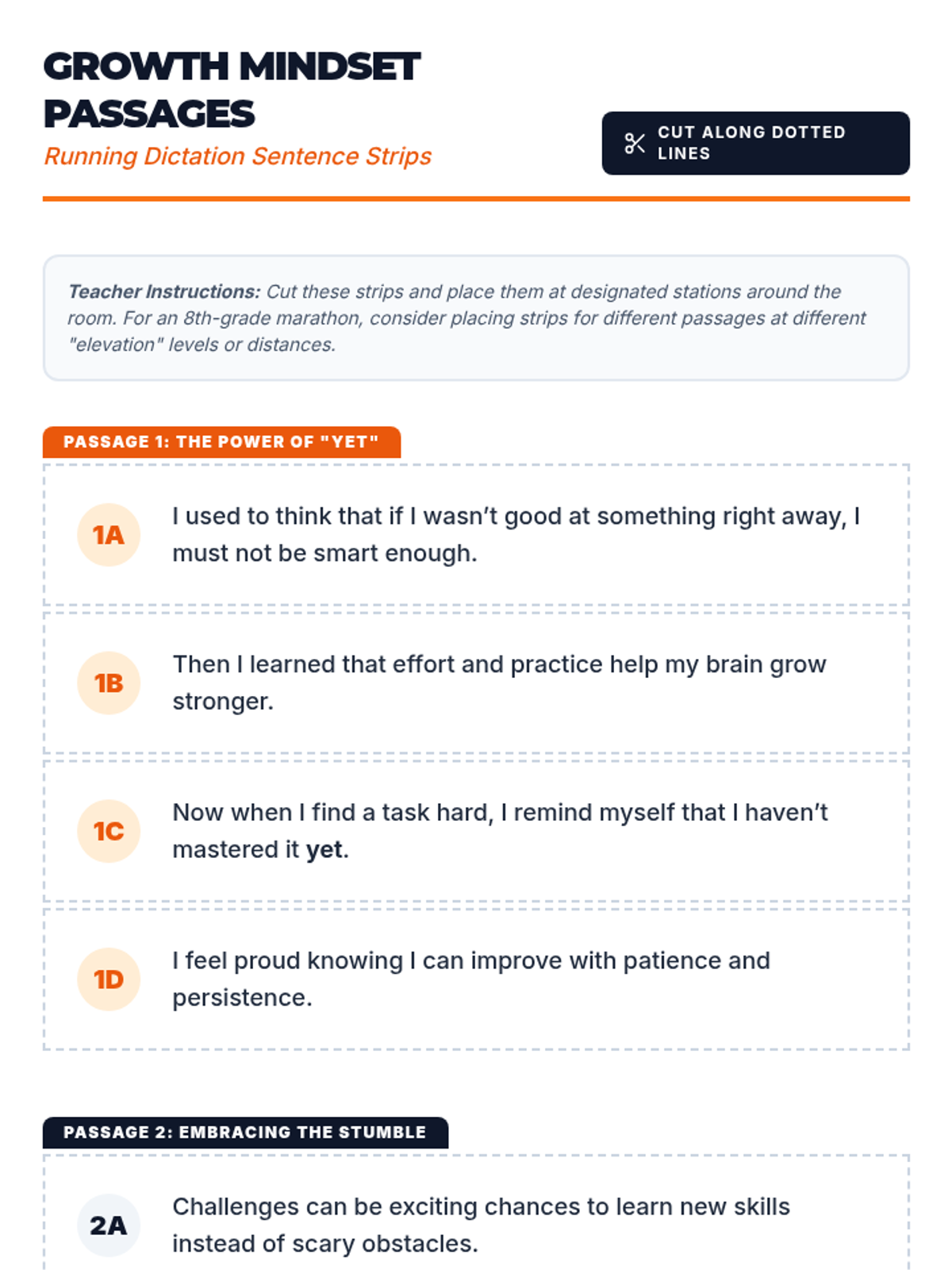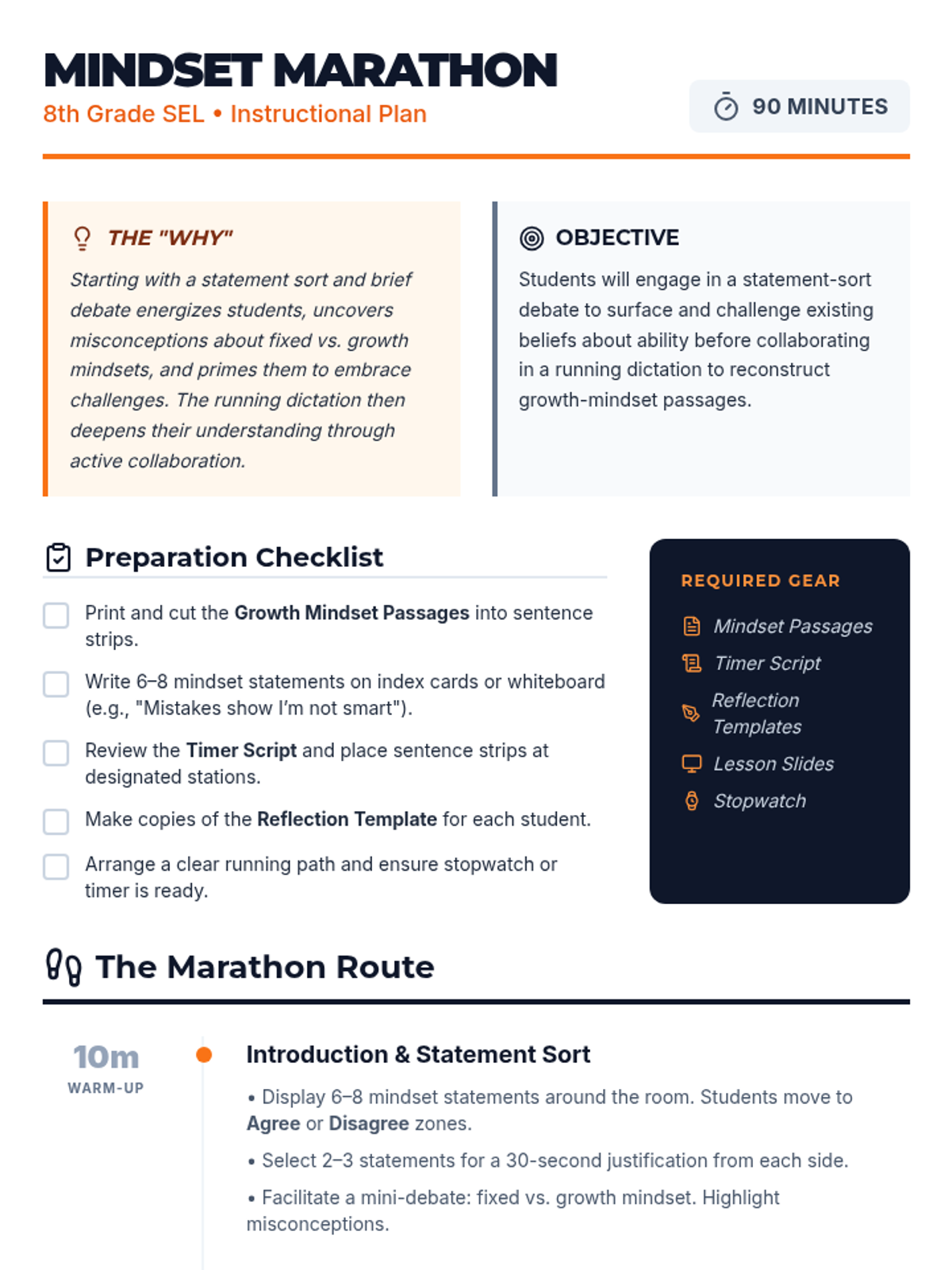 In this 90-minute 8th grade SEL lesson, students participate in a high-energy running dictation activity to internalize growth mindset concepts, building resilience and teamwork.