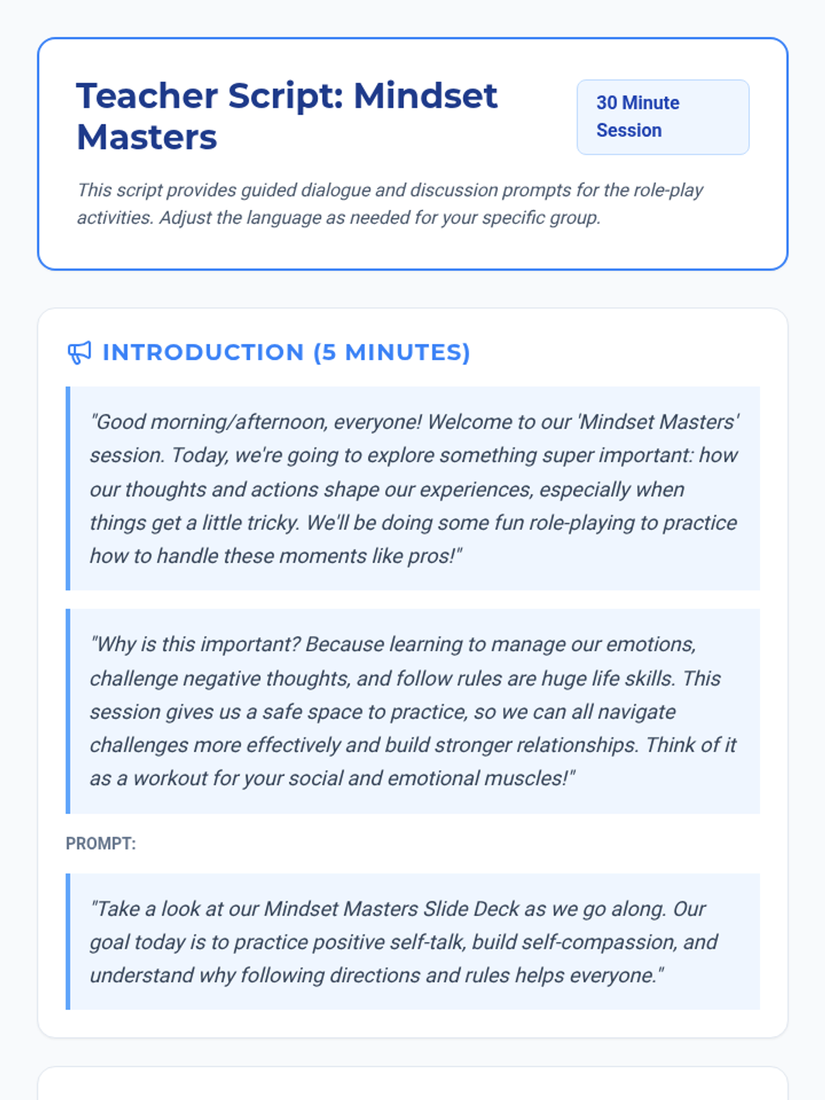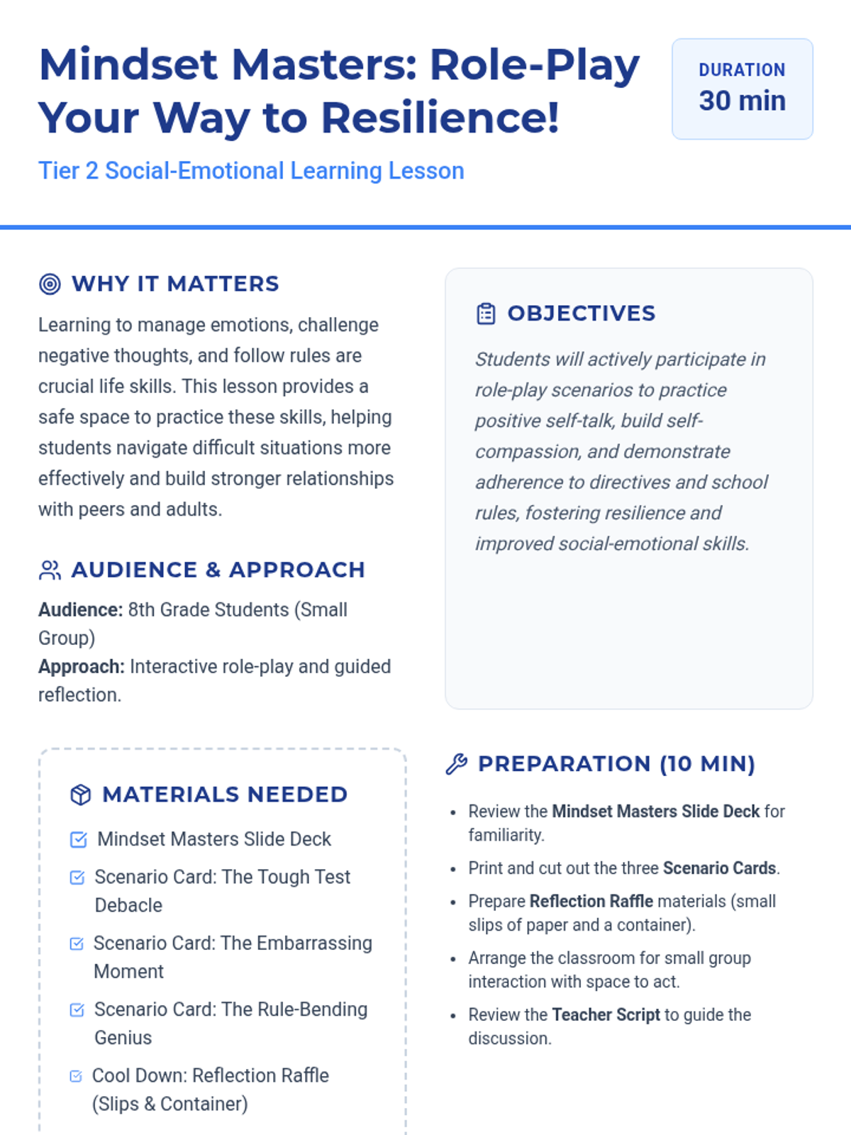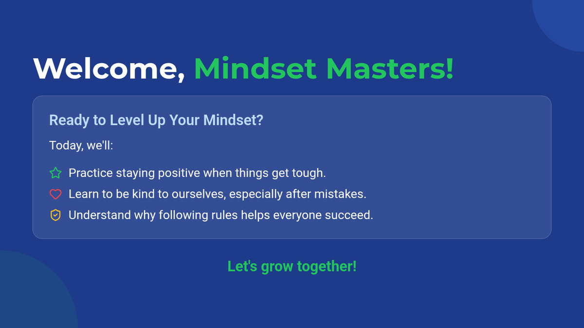 An interactive 30-minute small group session for 8th graders using role-play to practice positive mindset shifts, self-compassion, and following directives. Students engage in realistic scenarios to build resilience and improve social-emotional regulation.