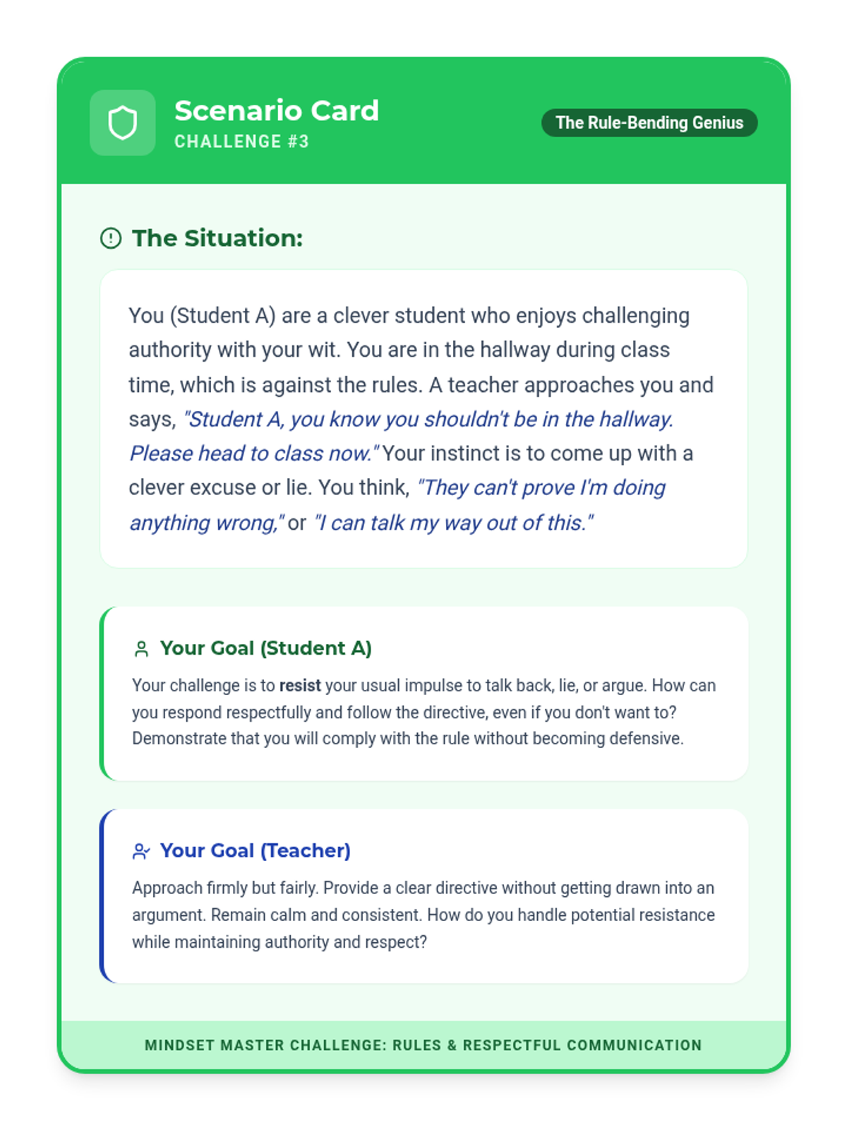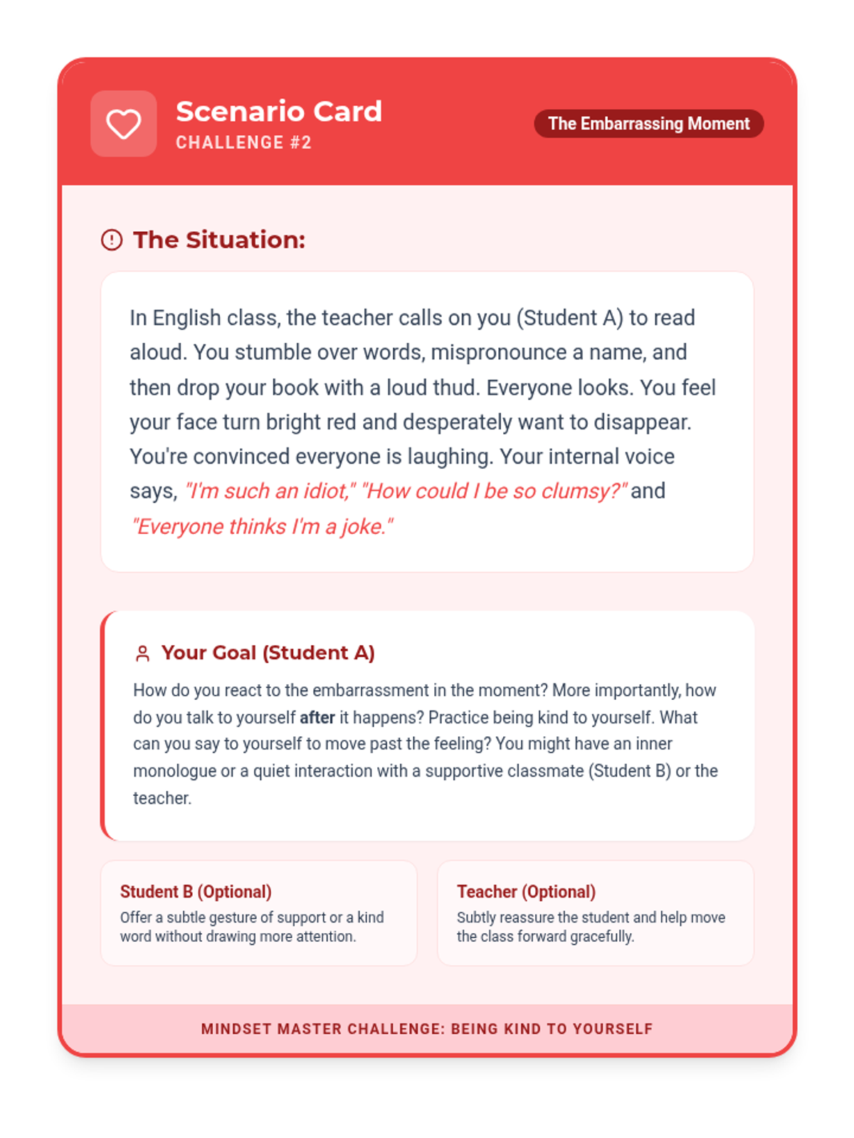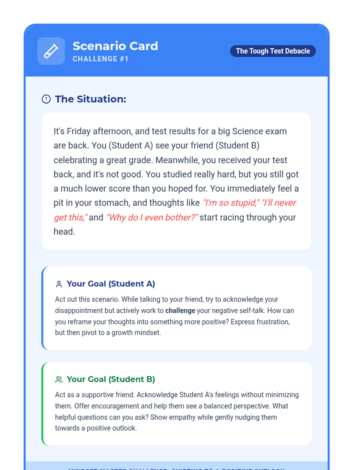 An interactive 30-minute small group session for 8th graders using role-play to practice positive mindset shifts, self-compassion, and following directives. Students engage in realistic scenarios to build resilience and improve social-emotional regulation.