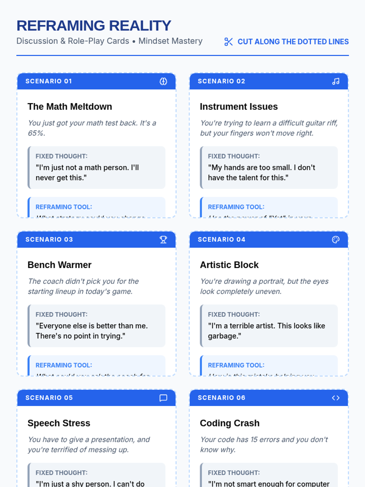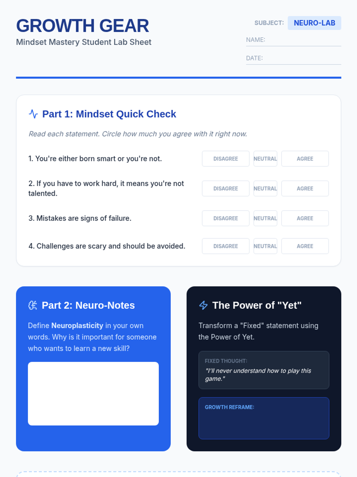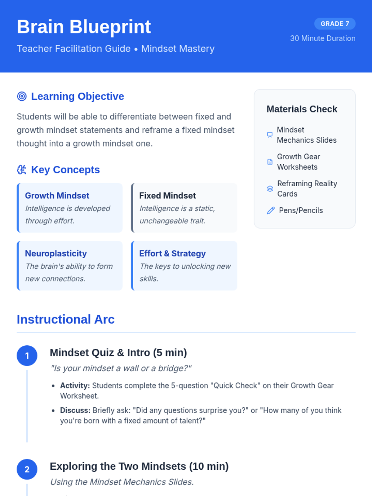A 30-minute lesson for 7th grade students to understand the difference between fixed and growth mindsets, learn about neuroplasticity, and practice reframing their internal dialogue.