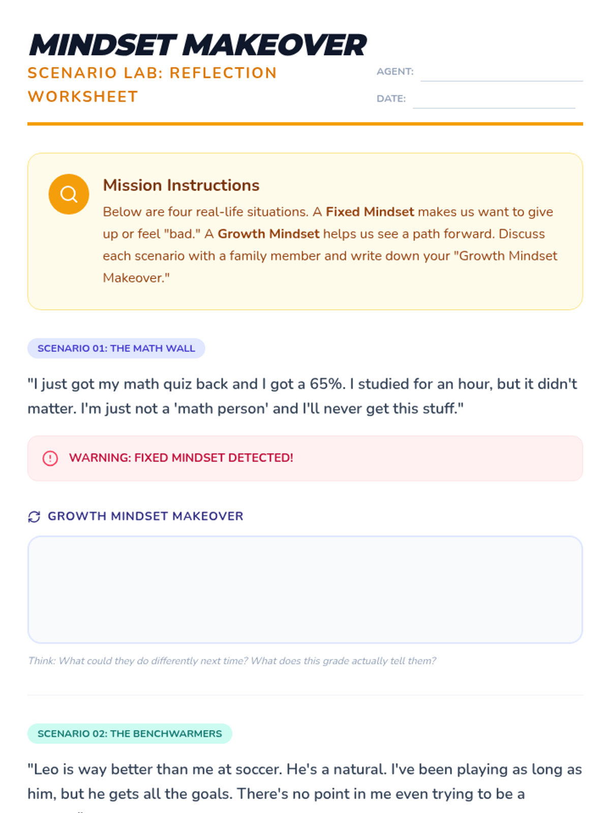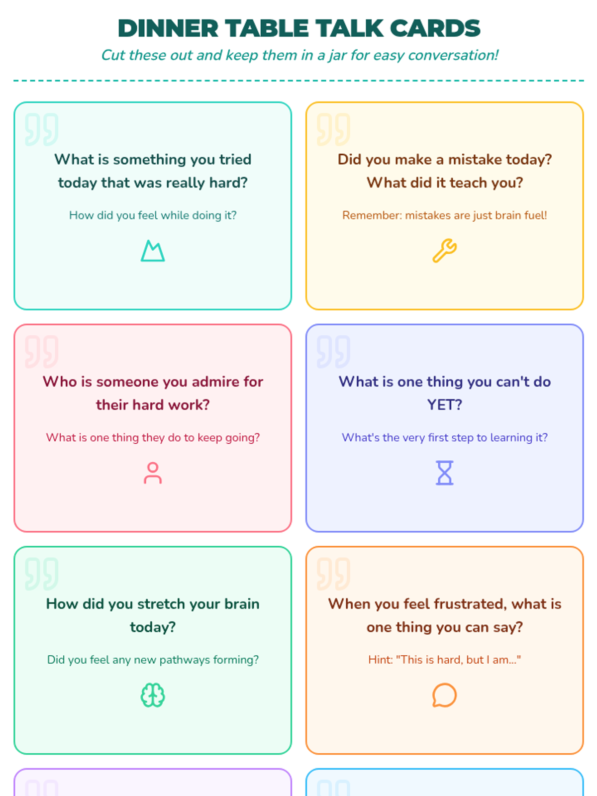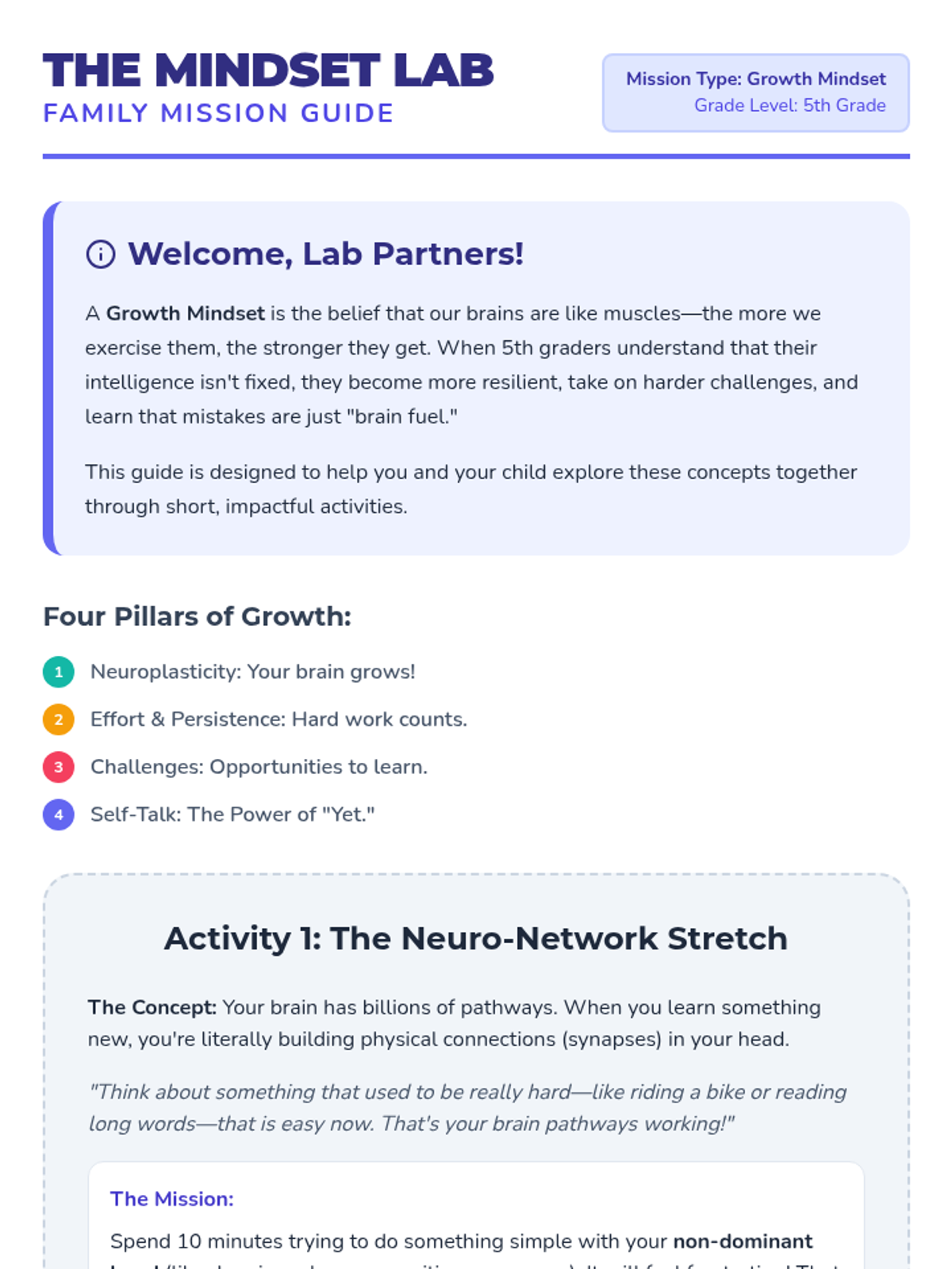 A comprehensive at-home kit for 5th graders and their families to develop a growth mindset through neuroplasticity education, reflection, and daily discussion.