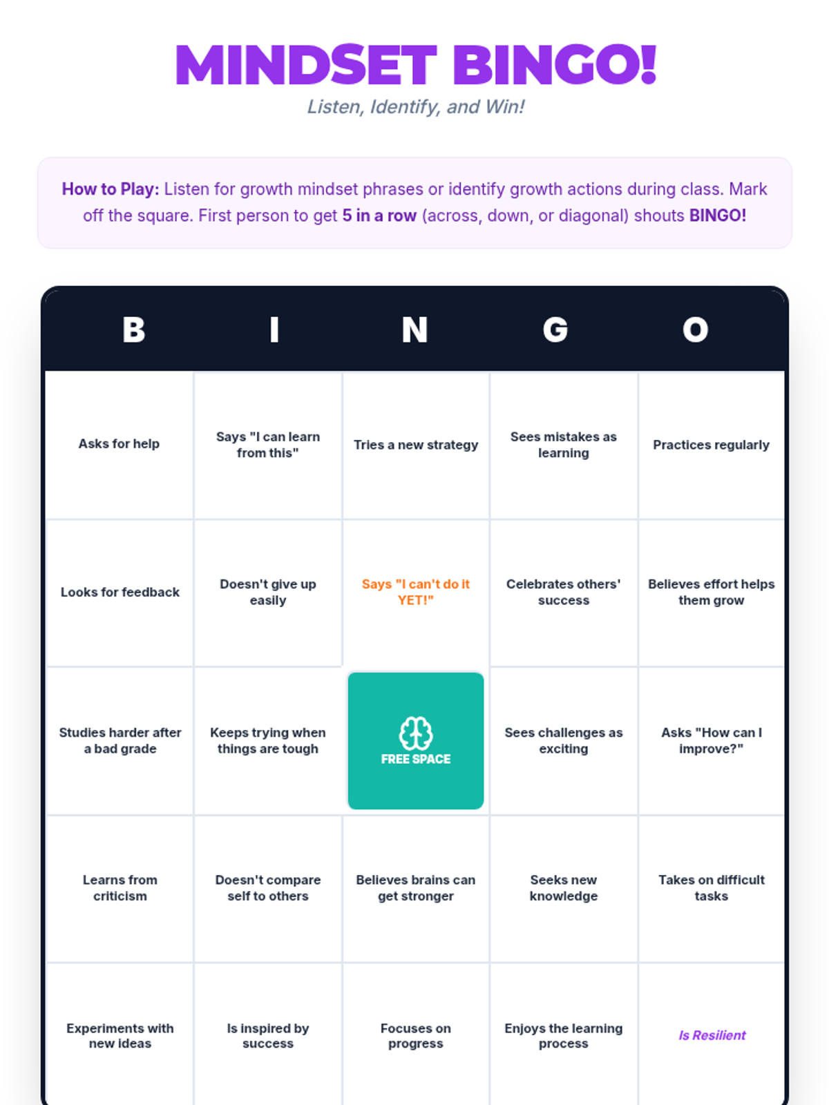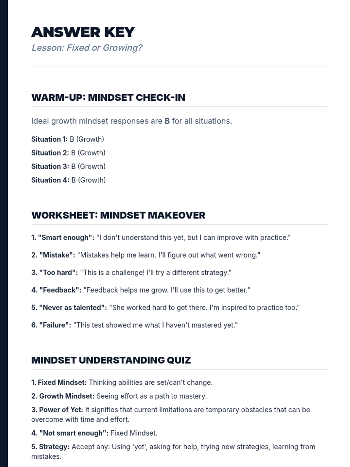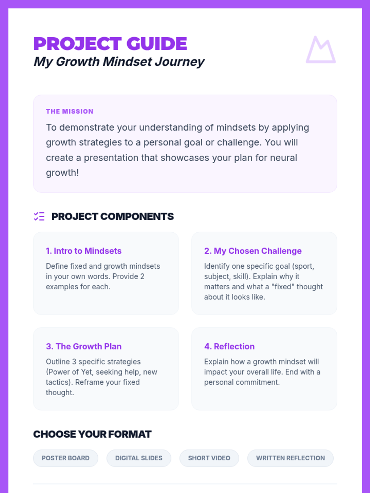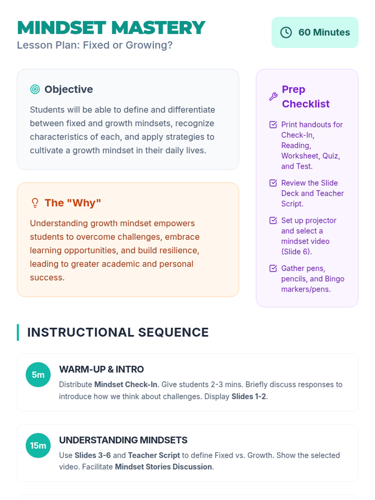 A 1-hour introductory lesson for middle schoolers on fixed vs. growth mindsets, focusing on the power of 'yet' and reframing challenges as opportunities for neural growth.