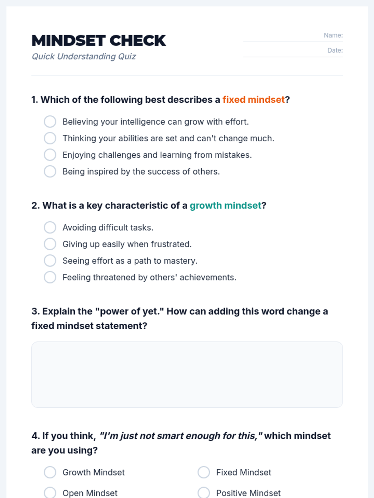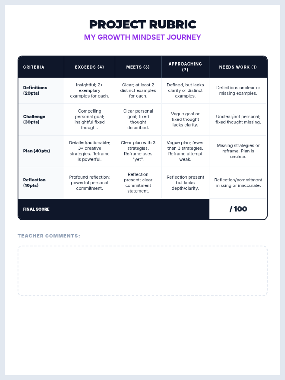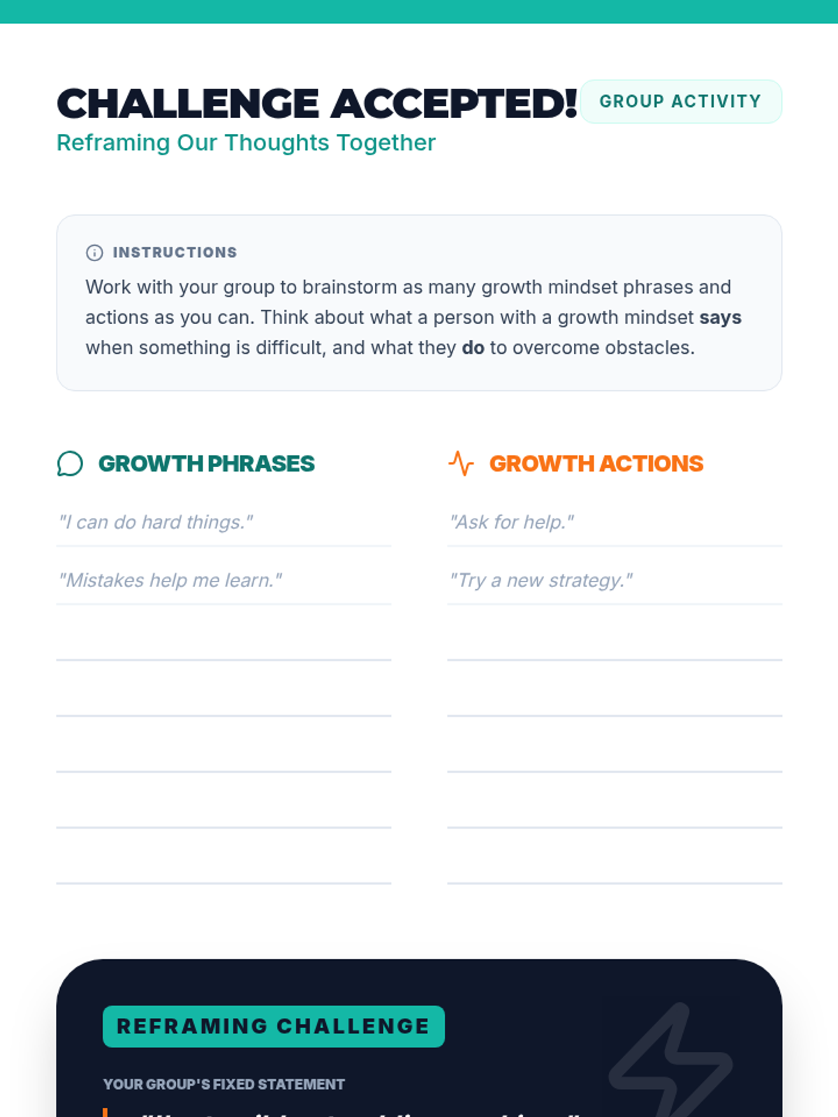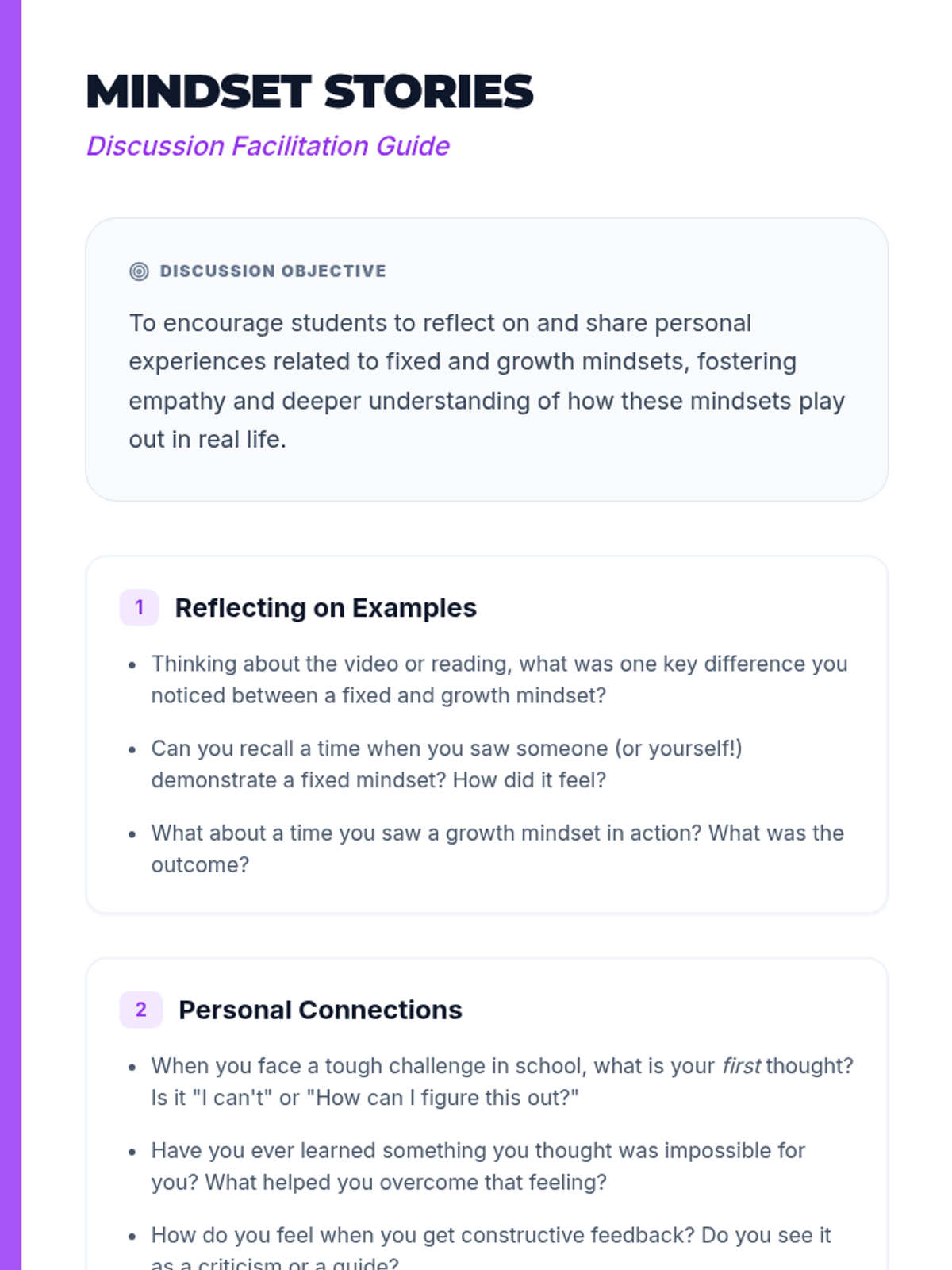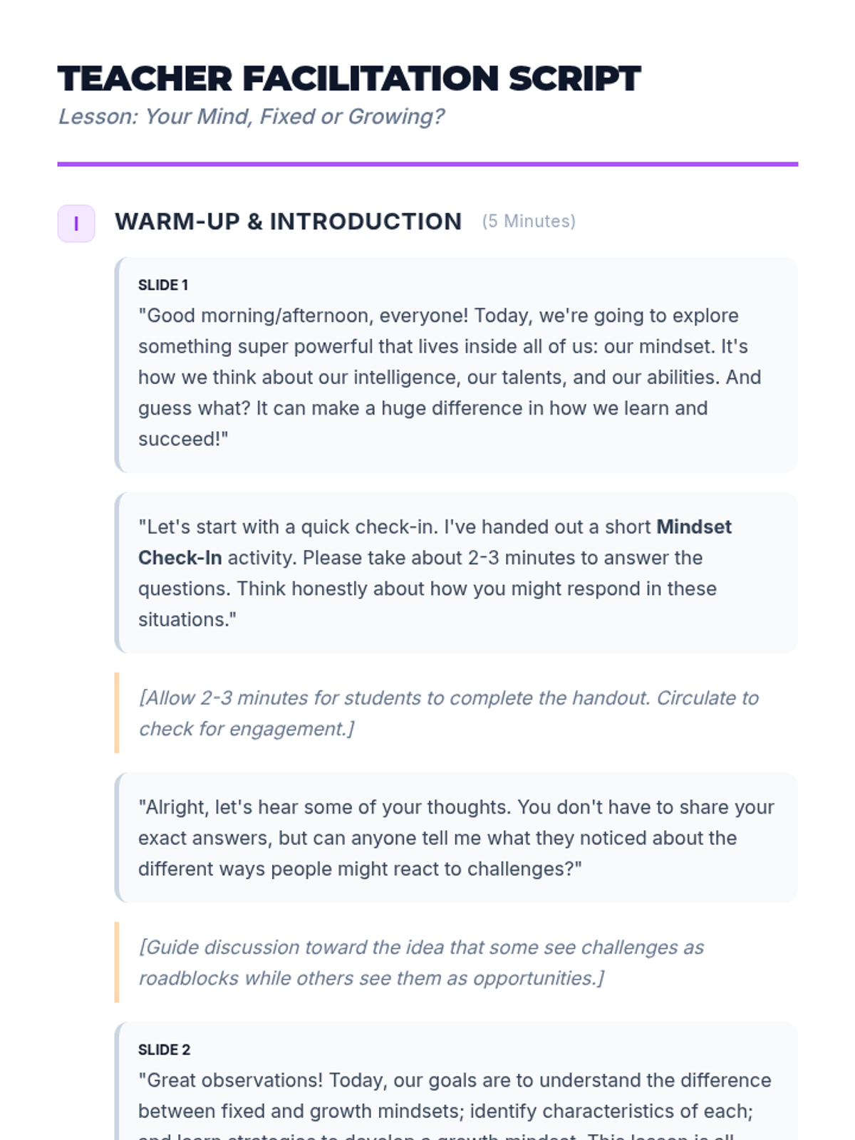 A 1-hour introductory lesson for middle schoolers on fixed vs. growth mindsets, focusing on the power of 'yet' and reframing challenges as opportunities for neural growth.