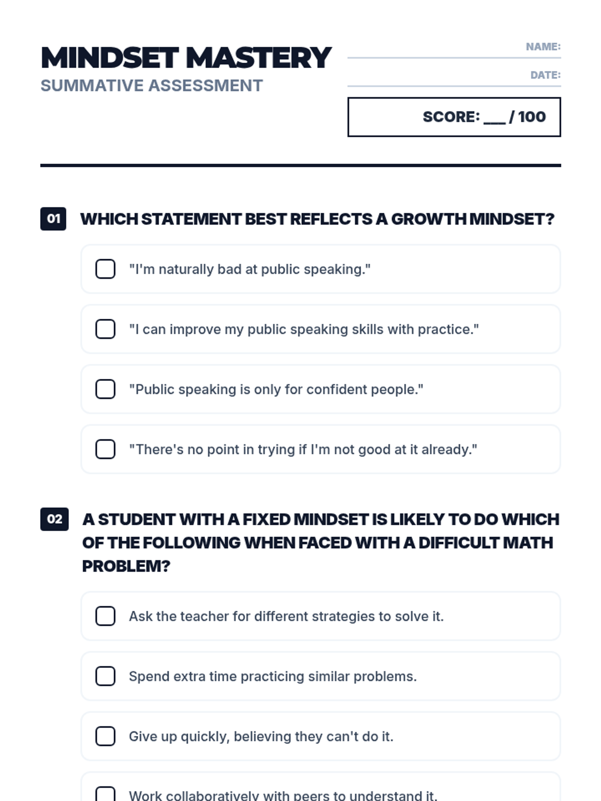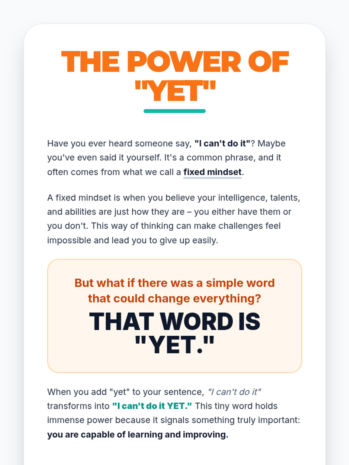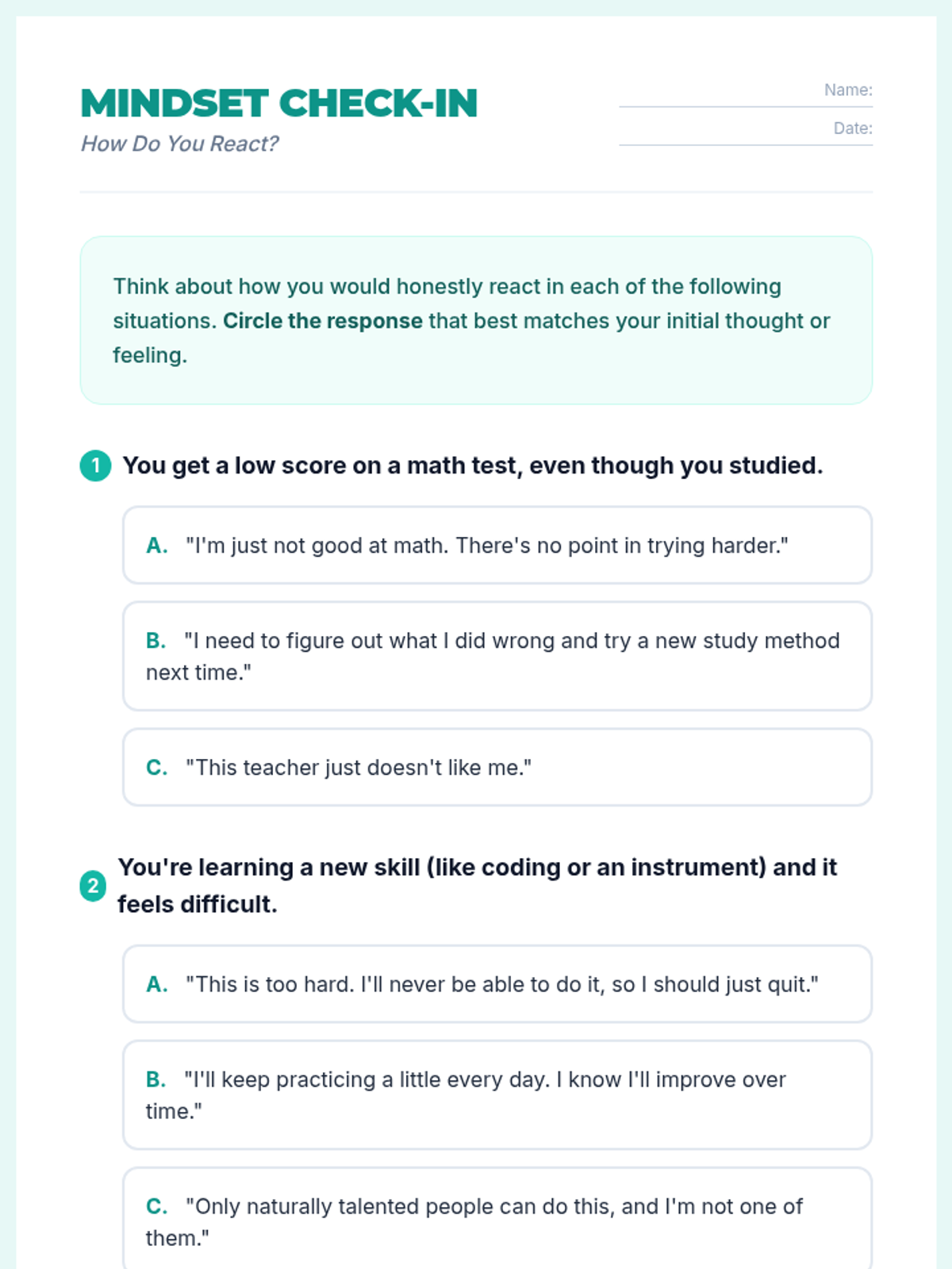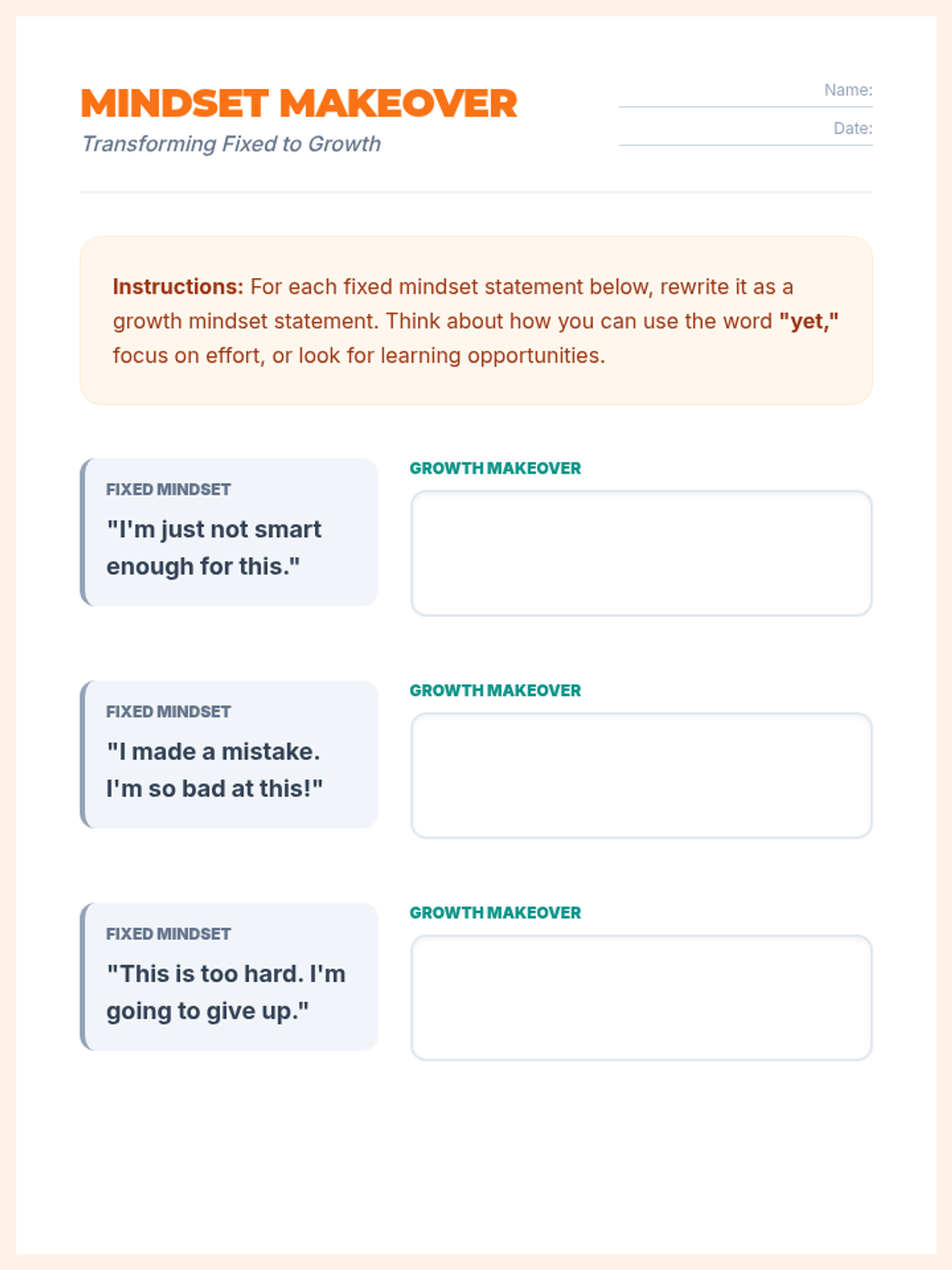 A 1-hour introductory lesson for middle schoolers on fixed vs. growth mindsets, focusing on the power of 'yet' and reframing challenges as opportunities for neural growth.