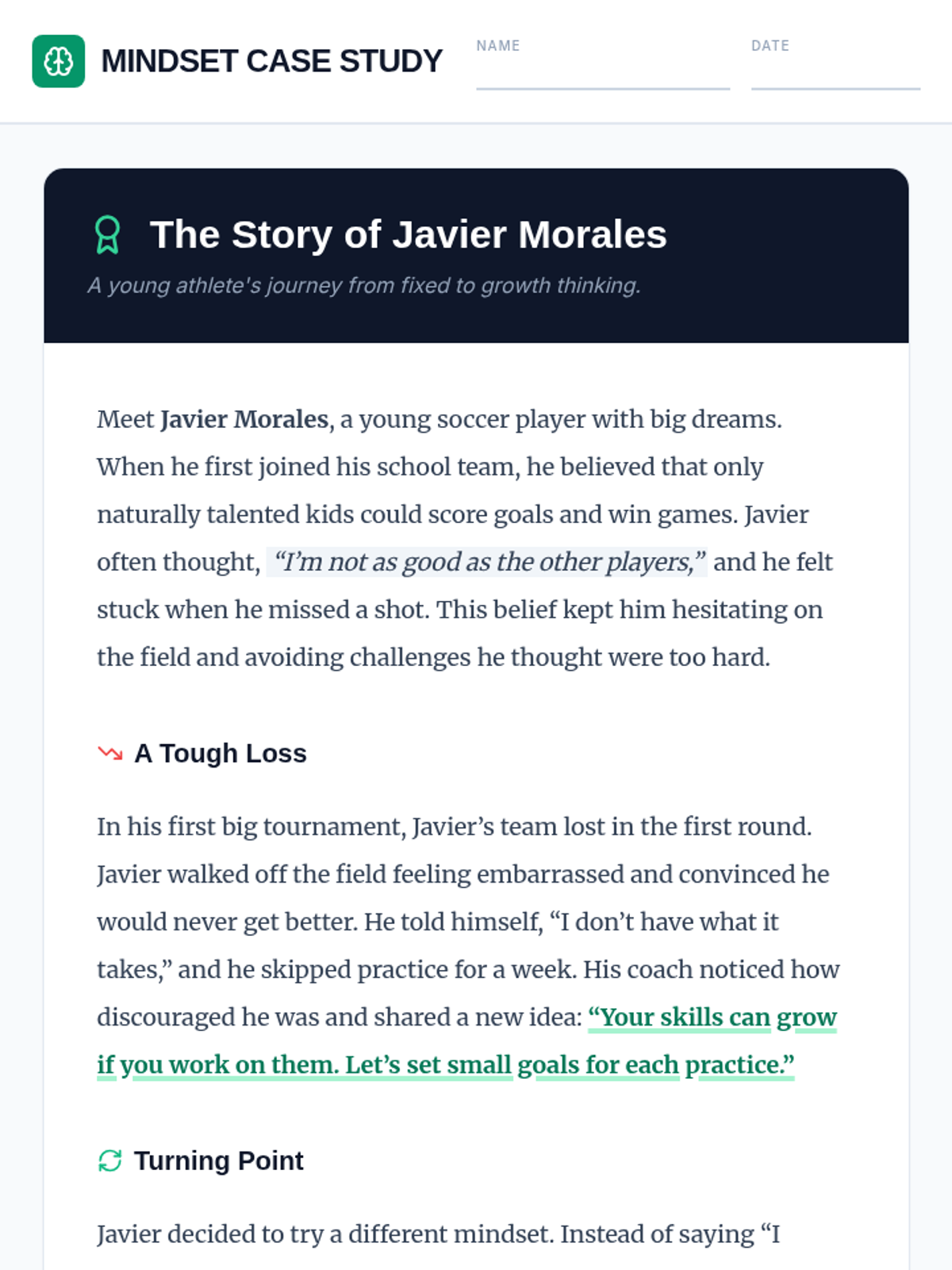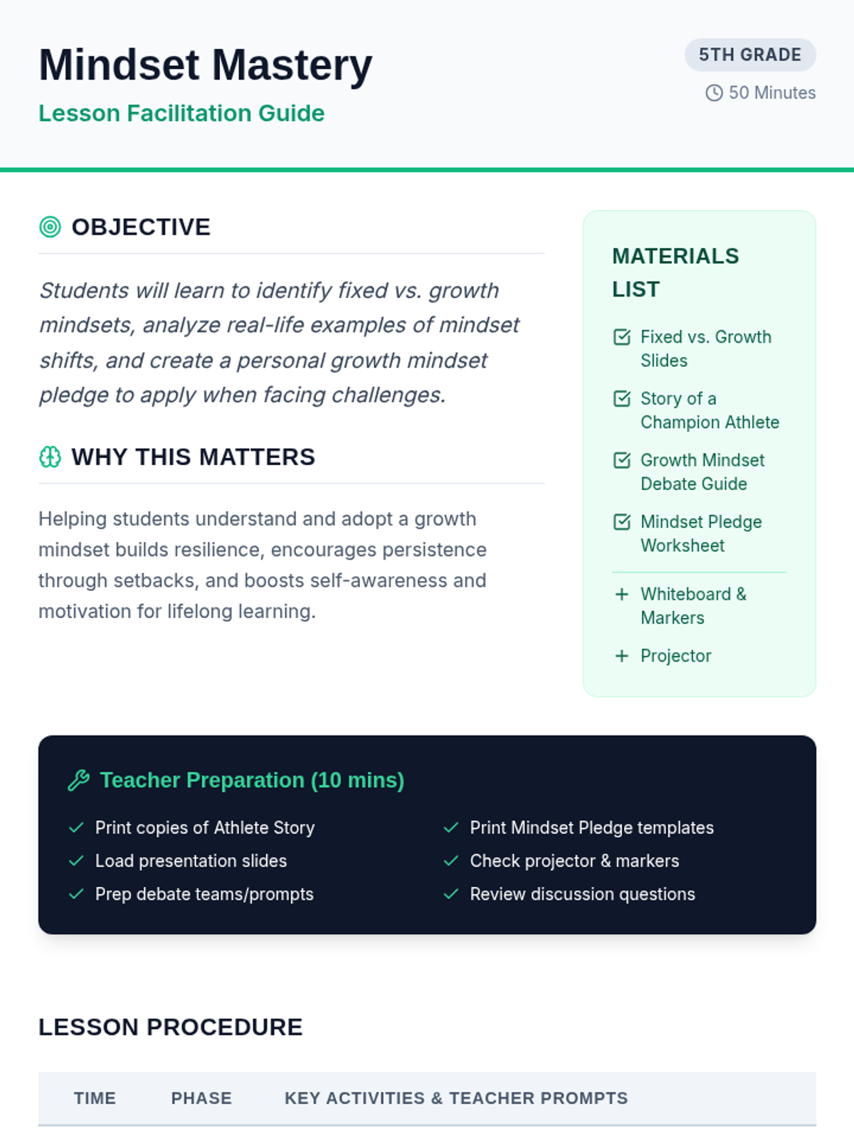 This 50-minute, 5th-grade classroom lesson explores fixed vs. growth mindset through real-life examples, stories, and interactive reflections. Students will learn to recognize their own mindsets and practice strategies to develop resilience, curiosity, and self-awareness.