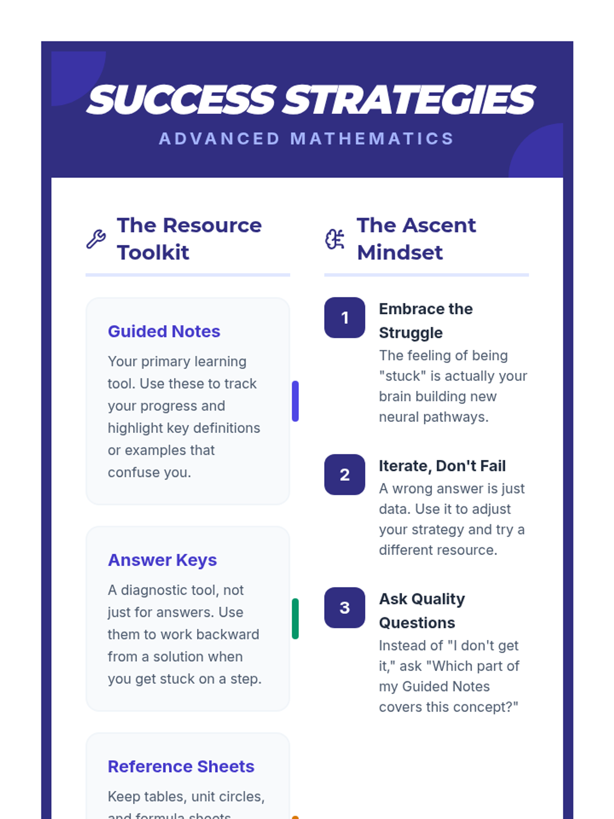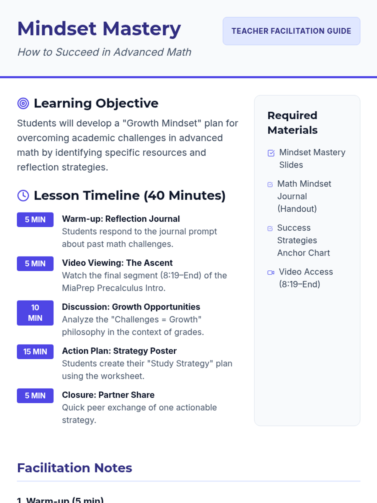 A lesson focused on developing a growth mindset for advanced math students, featuring a video-based discussion and the creation of personalized study strategy plans.