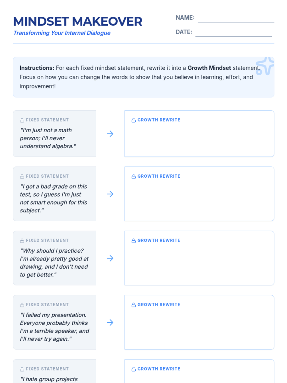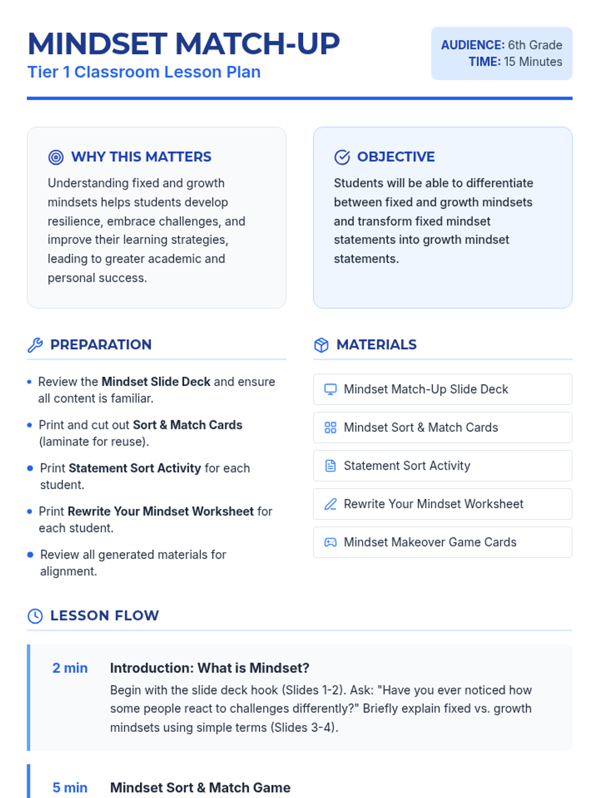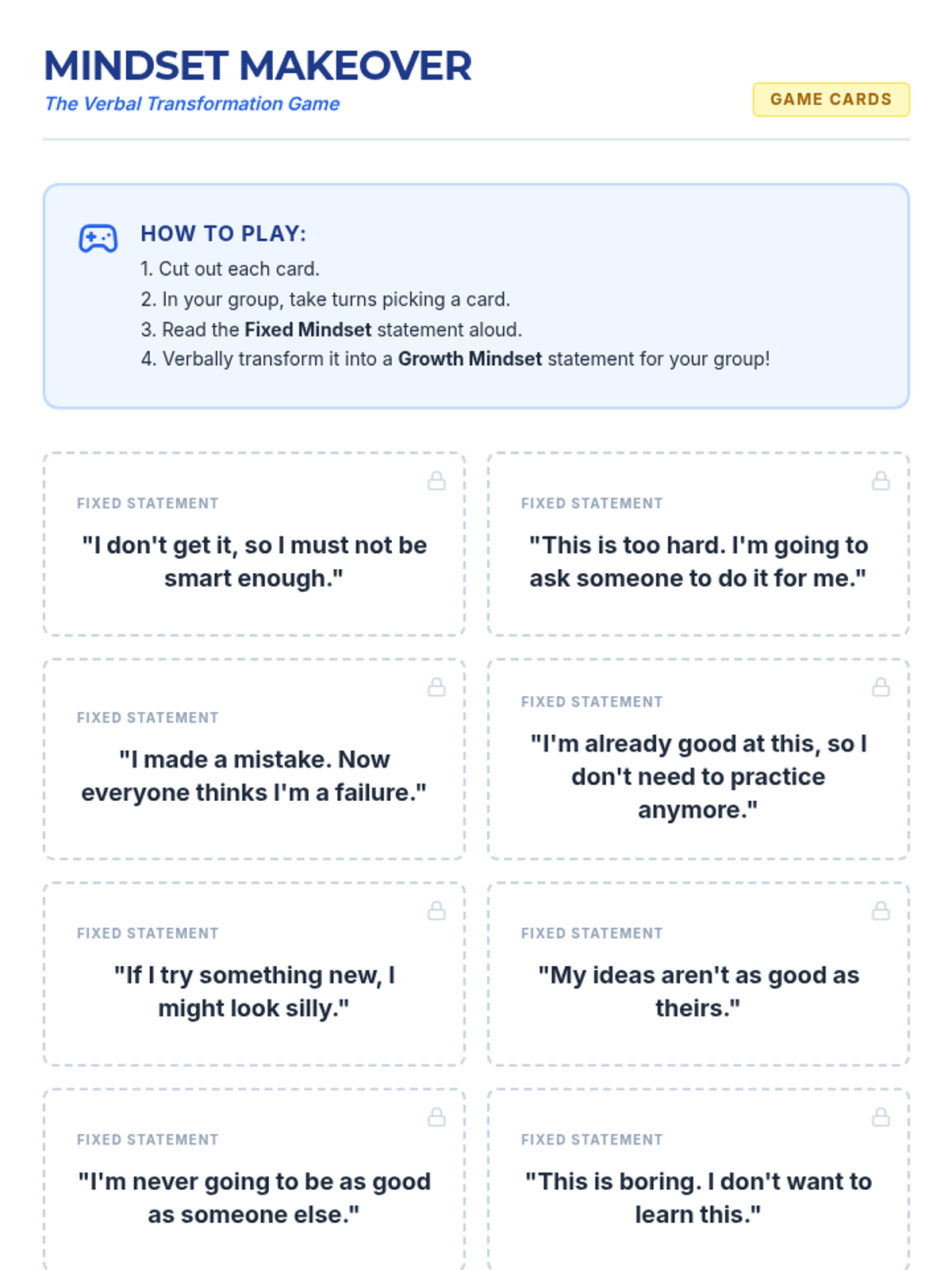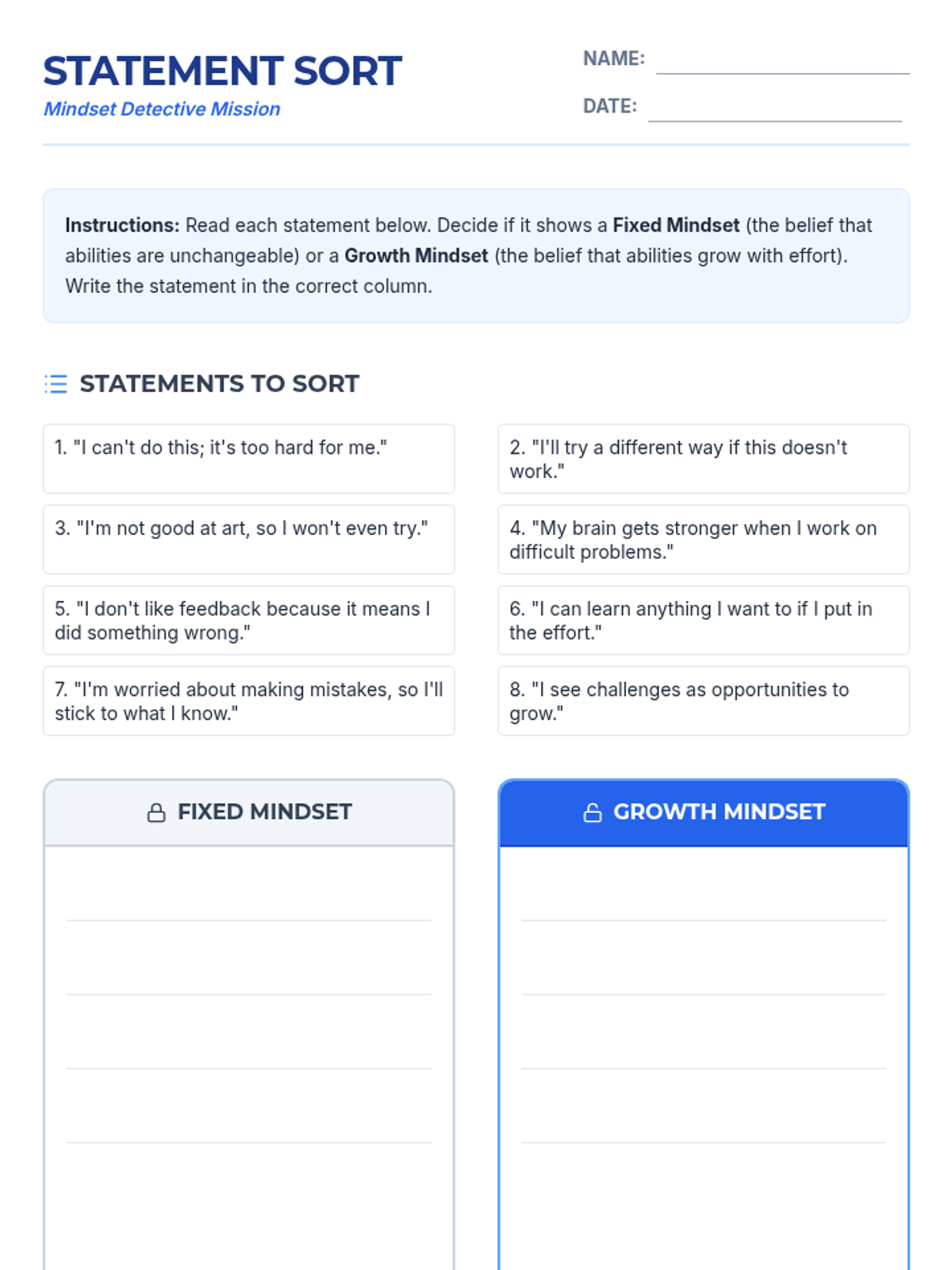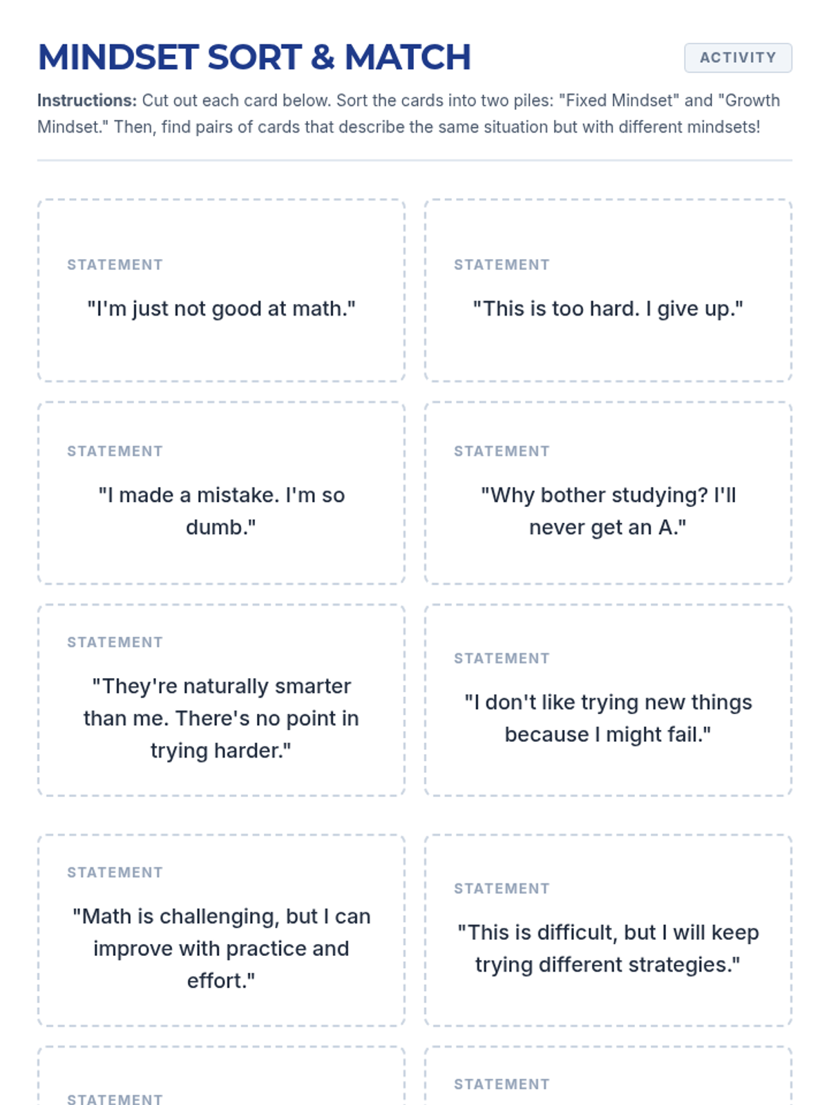 A 15-minute introductory lesson for 6th graders to distinguish between fixed and growth mindsets and practice transforming their thinking through interactive sorting and rewriting activities.