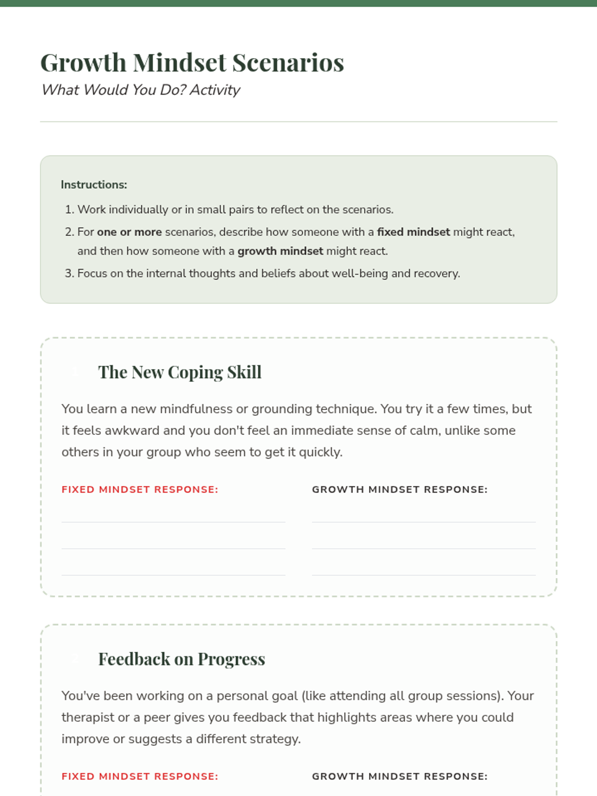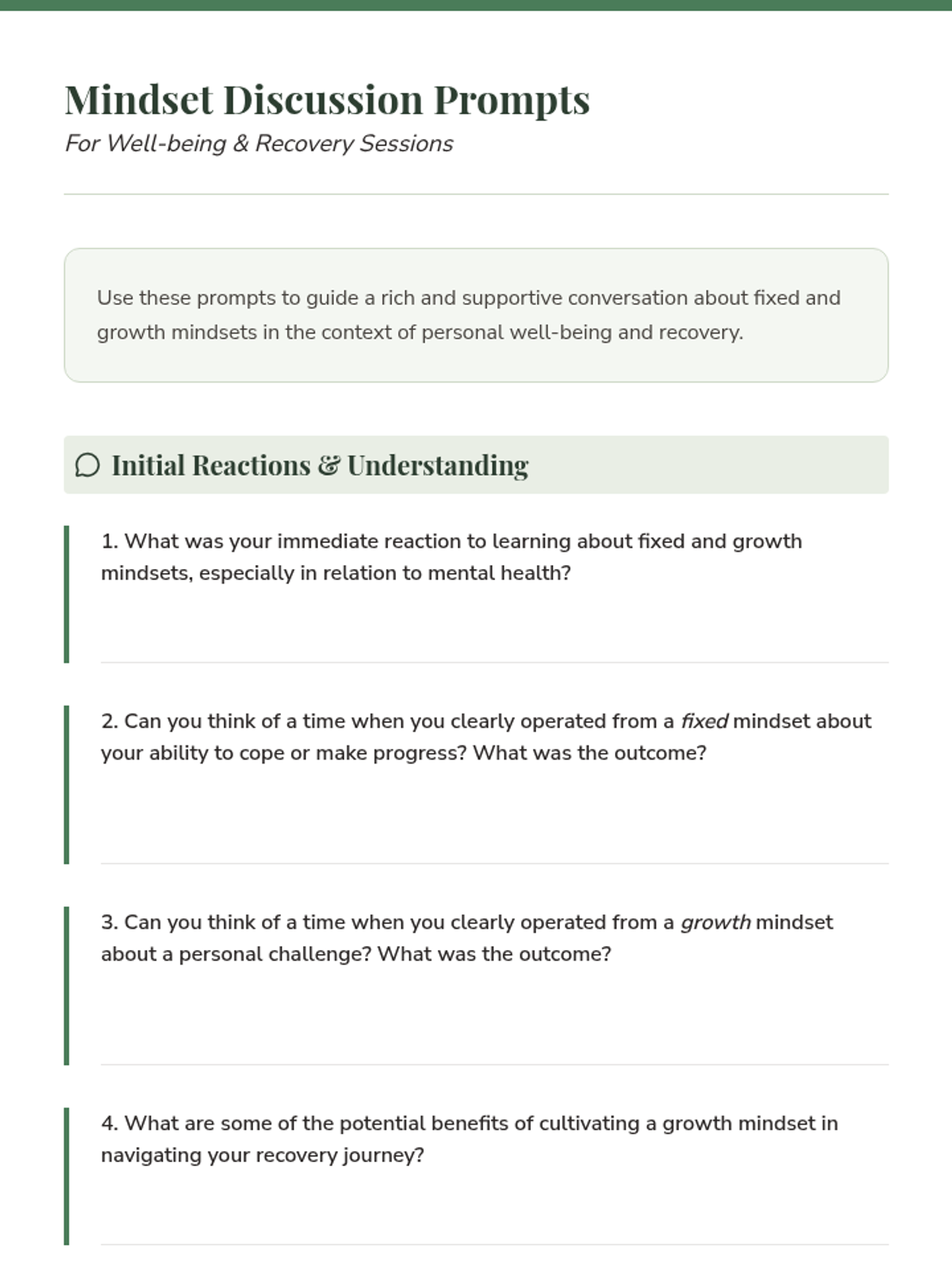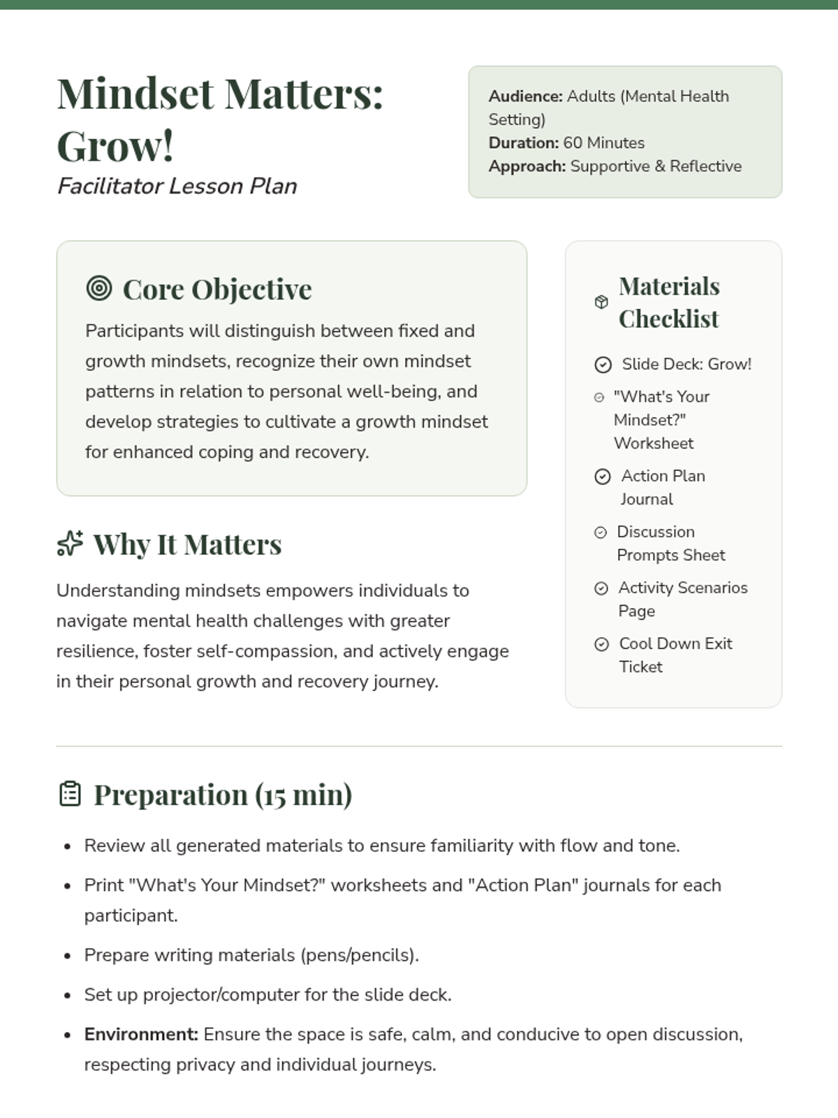This lesson helps adults understand the difference between growth and fixed mindsets, recognize their own mindset patterns, and develop strategies for fostering a growth mindset within a mental health and recovery context.