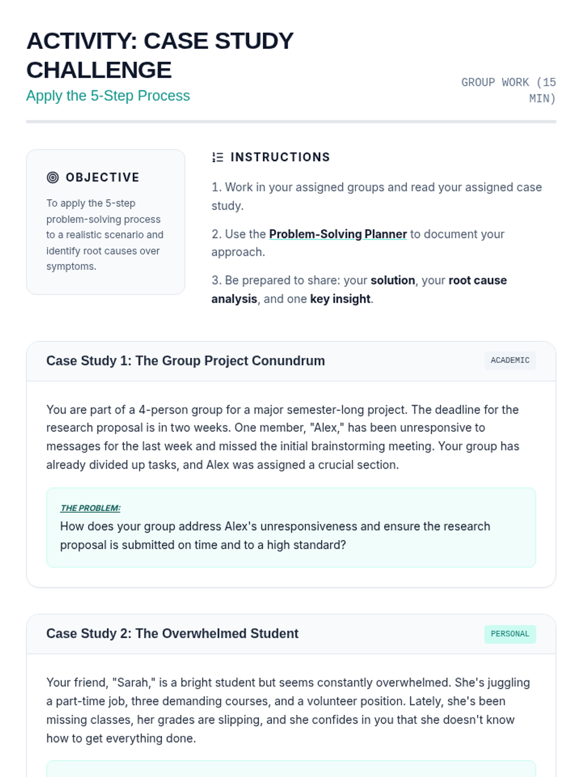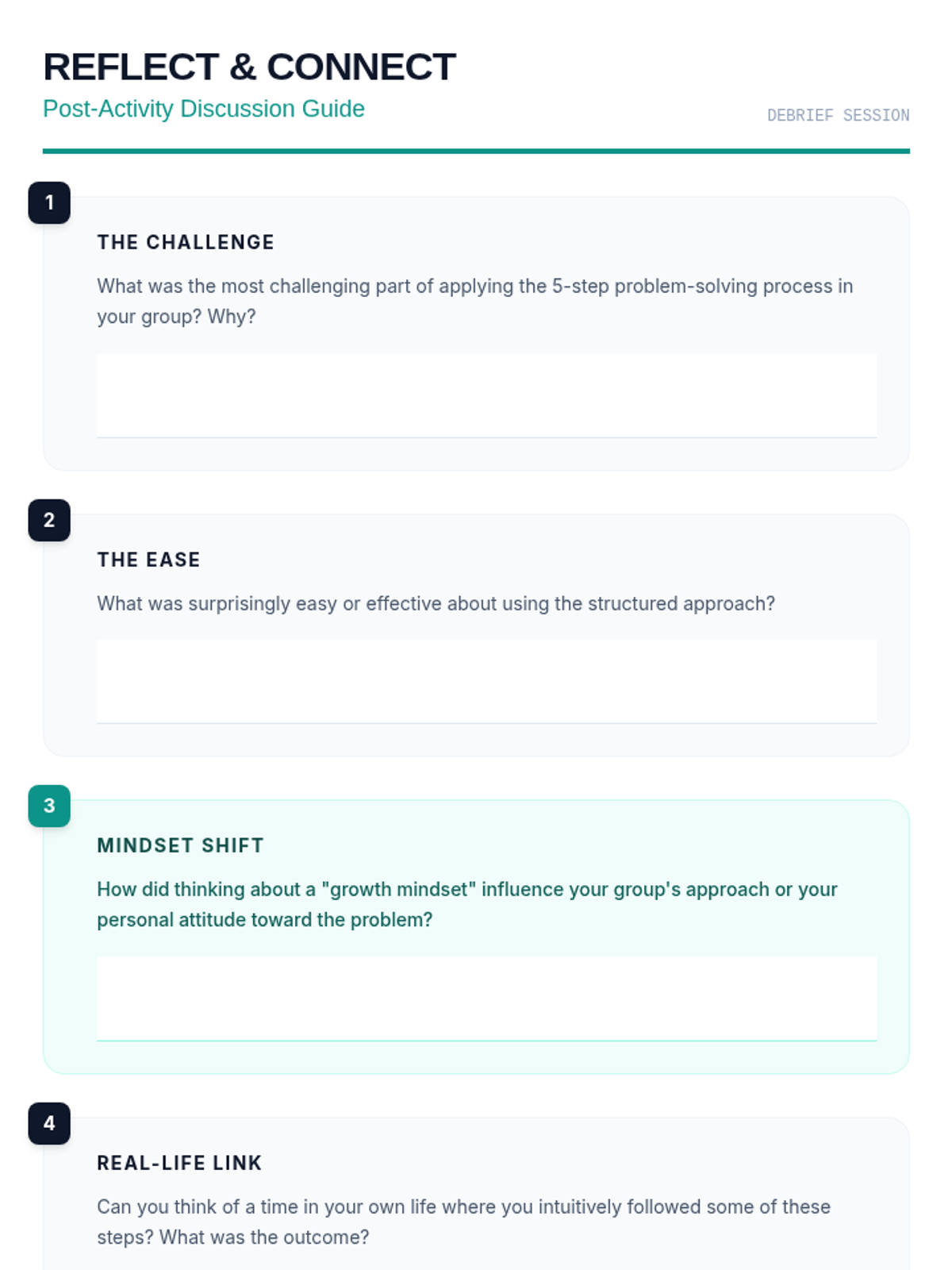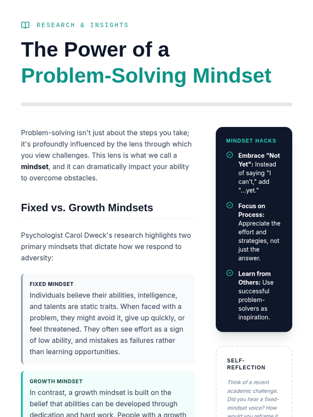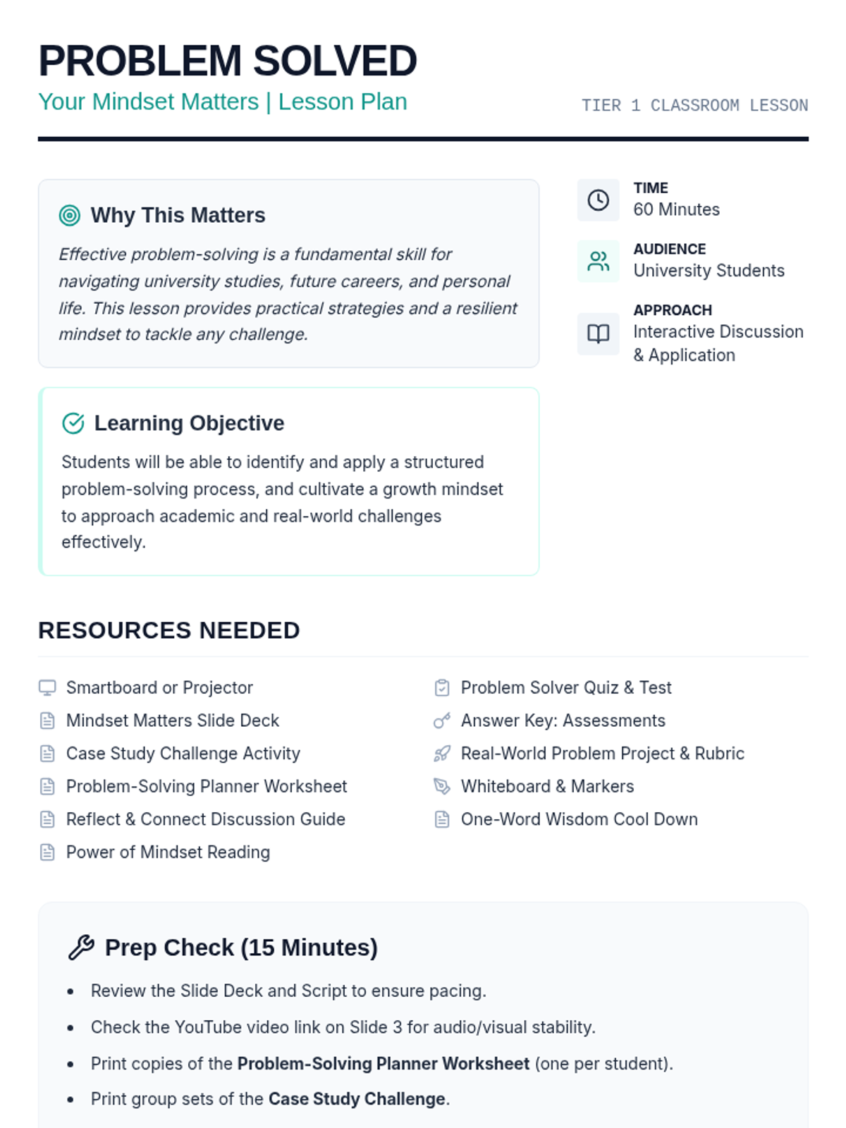 A 1-hour workshop for university students that teaches a structured 5-step problem-solving process while emphasizing the transformative power of a growth mindset. Students engage in practical activities, case studies, and reflections to build resilience and strategic thinking skills.