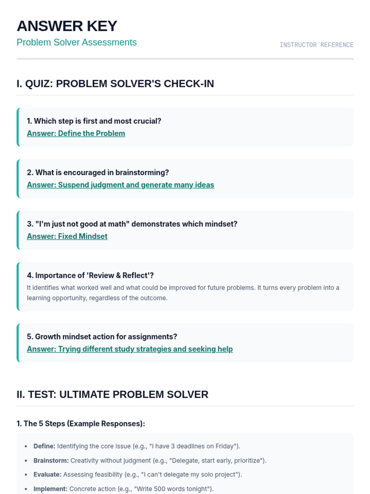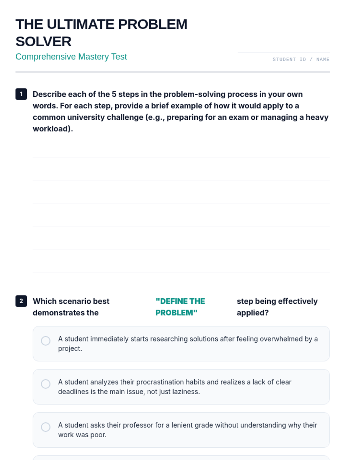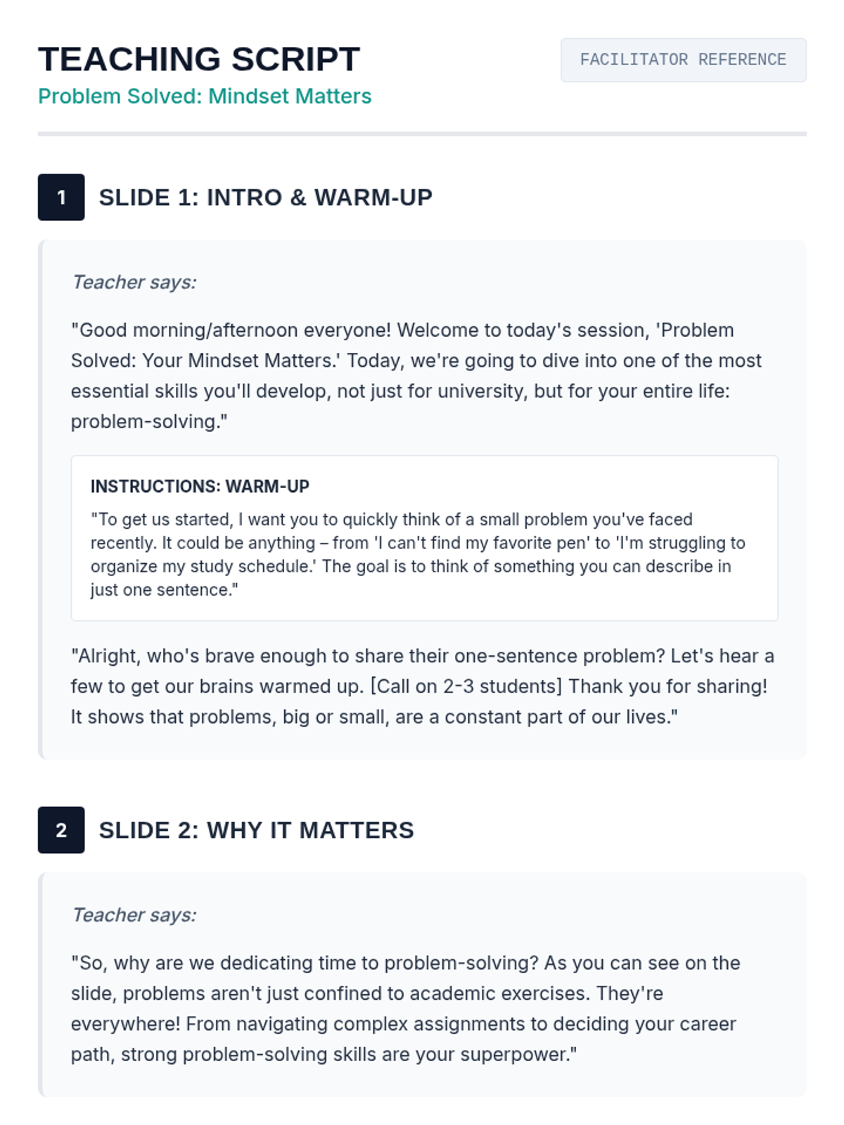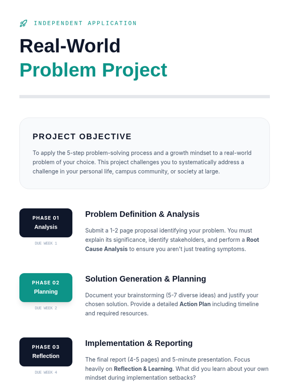 A 1-hour workshop for university students that teaches a structured 5-step problem-solving process while emphasizing the transformative power of a growth mindset. Students engage in practical activities, case studies, and reflections to build resilience and strategic thinking skills.
