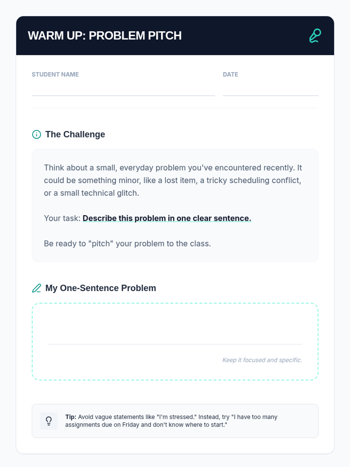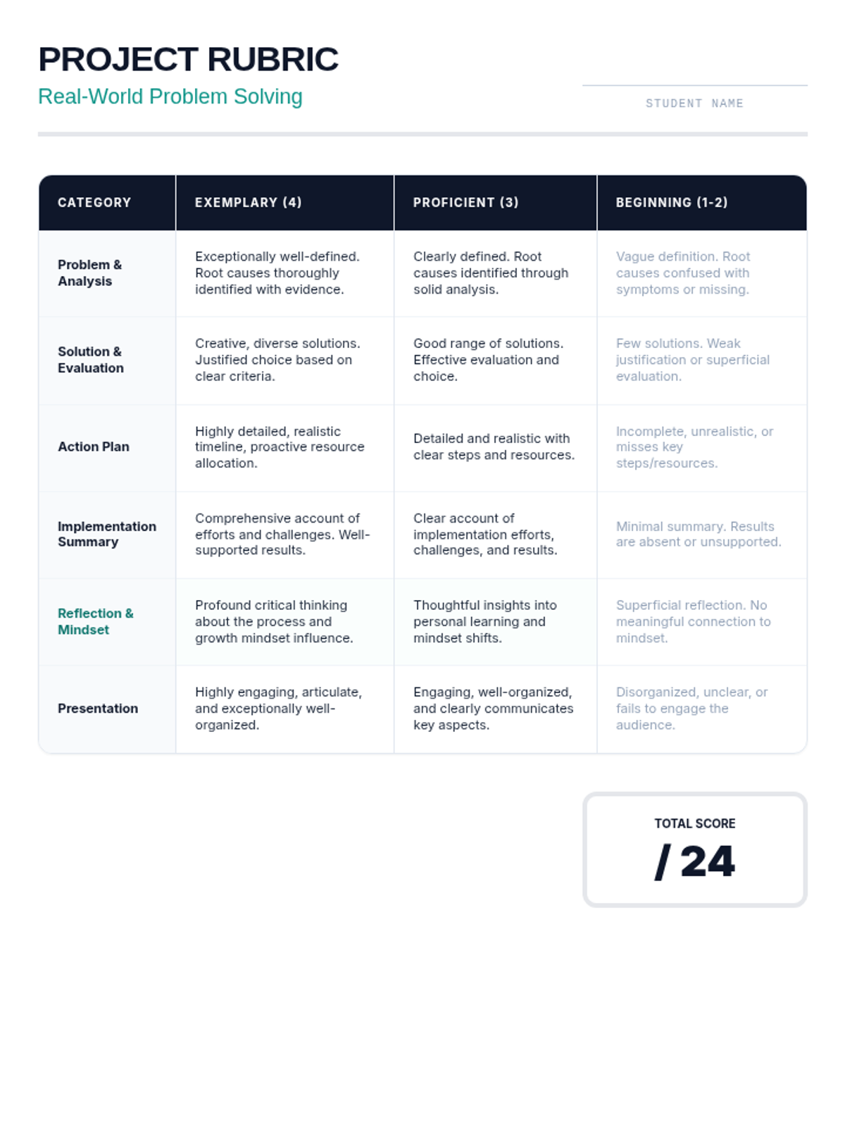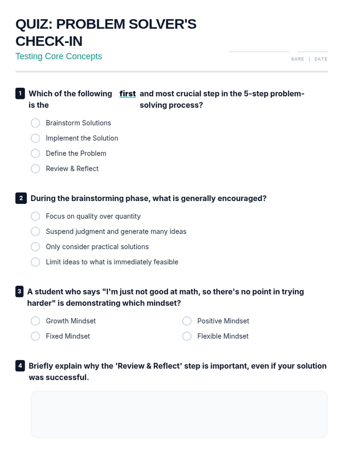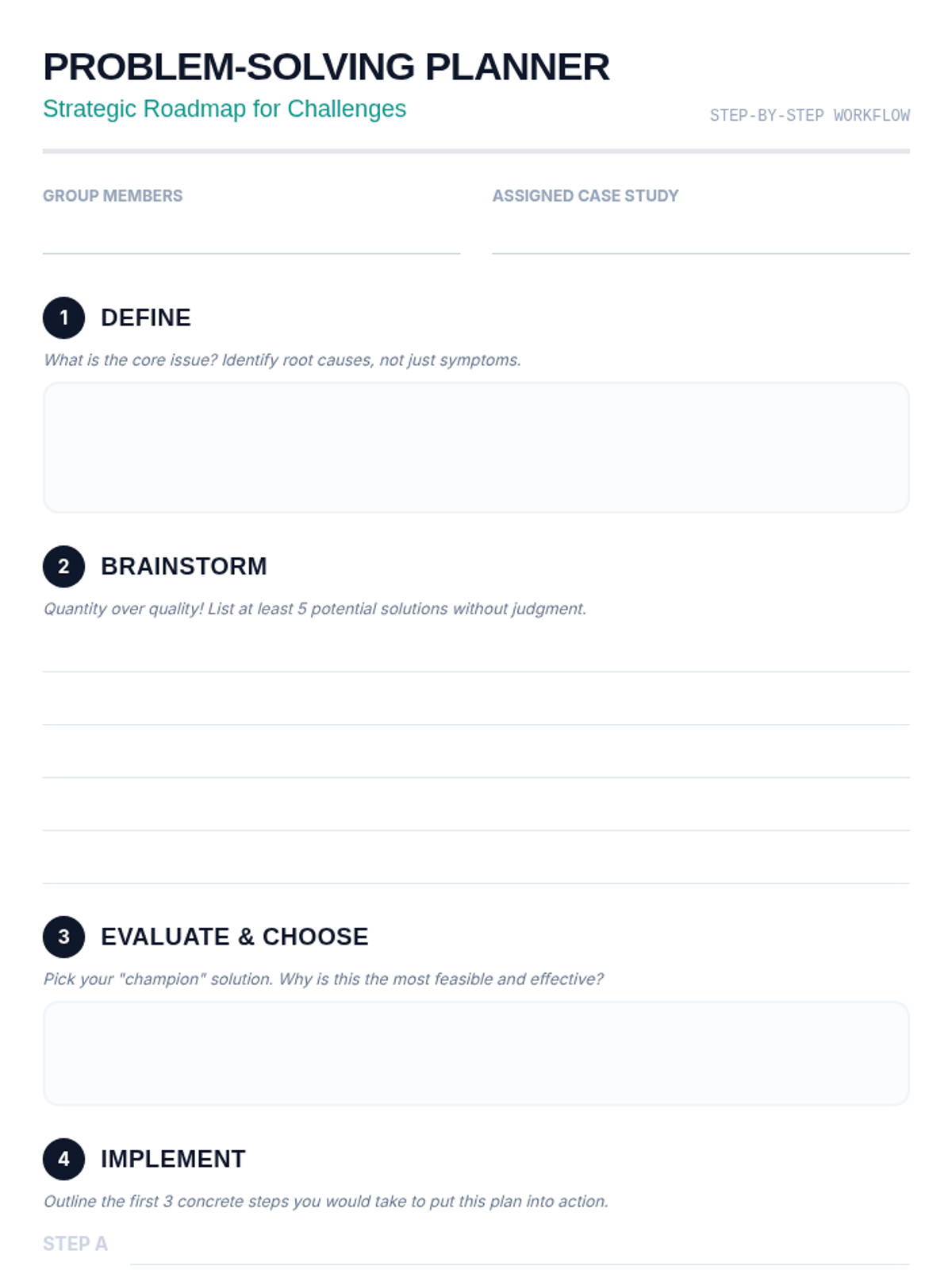 A 1-hour workshop for university students that teaches a structured 5-step problem-solving process while emphasizing the transformative power of a growth mindset. Students engage in practical activities, case studies, and reflections to build resilience and strategic thinking skills.