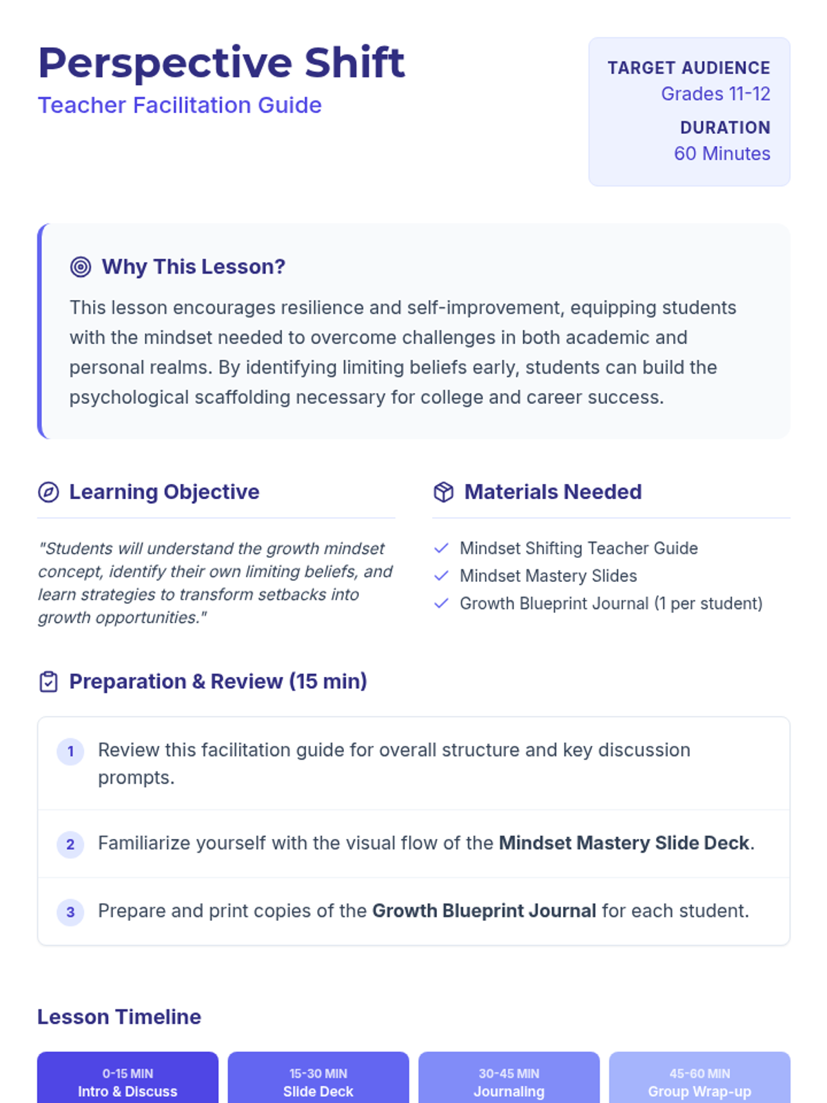 A comprehensive lesson for grades 11-12 focusing on identifying limiting beliefs and developing a growth mindset through reflection and practical strategies.