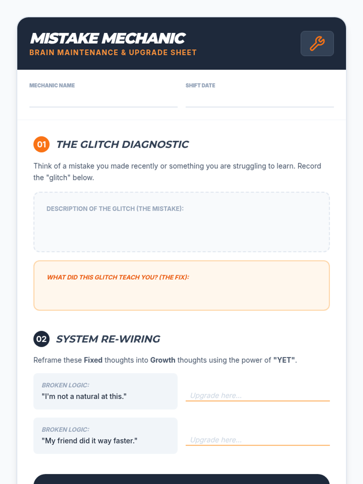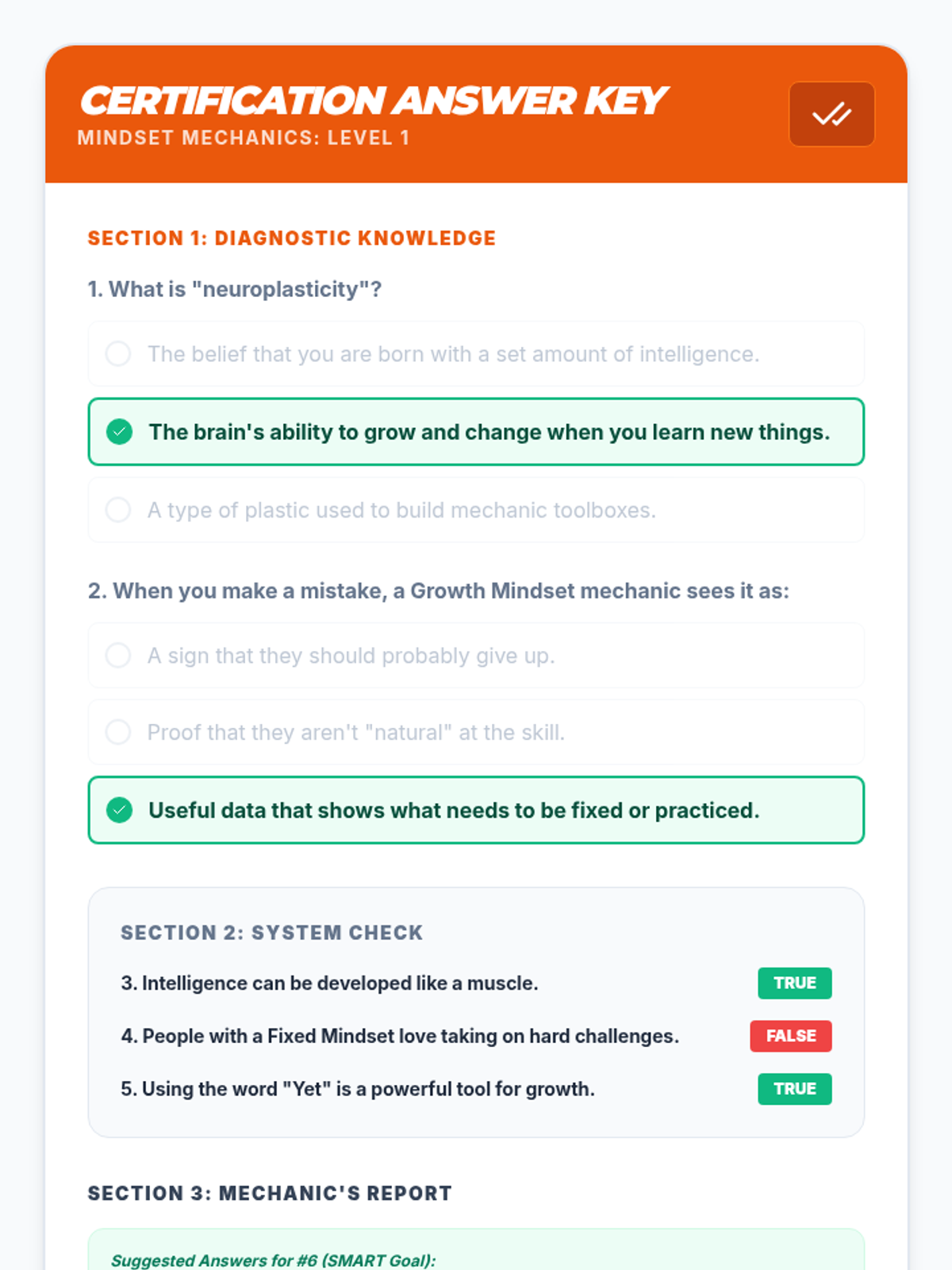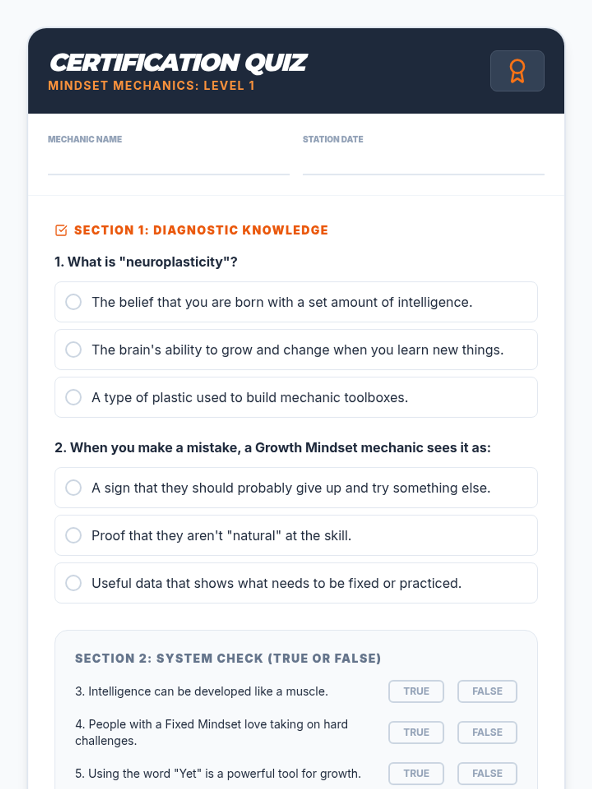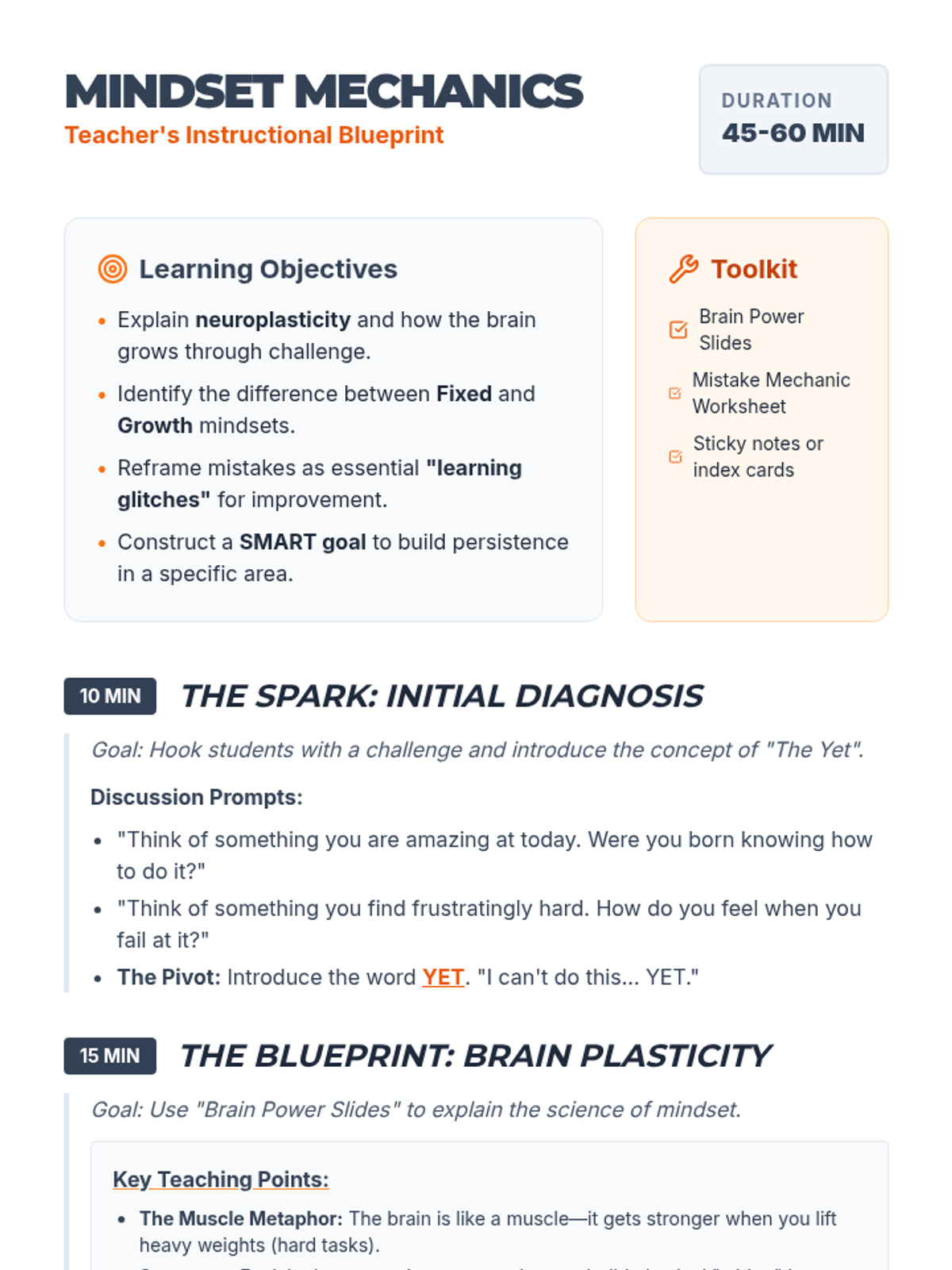 A comprehensive mini-lesson focusing on growth mindset principles, including neuroplasticity, persistence, and learning from mistakes using a workshop-inspired 'Mindset Mechanics' theme.
