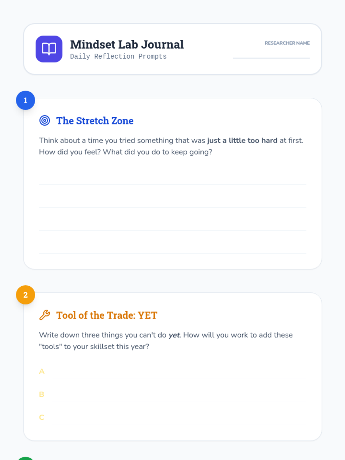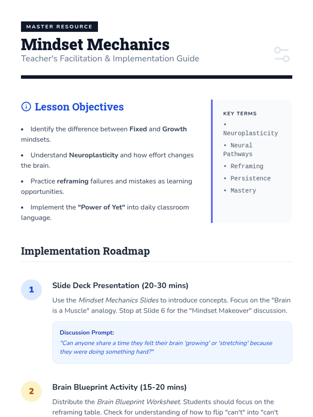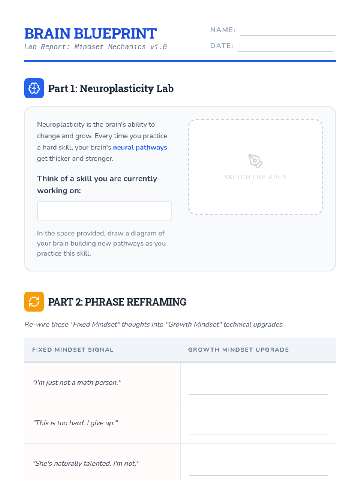 A comprehensive lesson introducing students to growth mindset through the lens of neuroplasticity, reframing mistakes, and language shifts. Students explore how effort shapes the brain like a muscle.