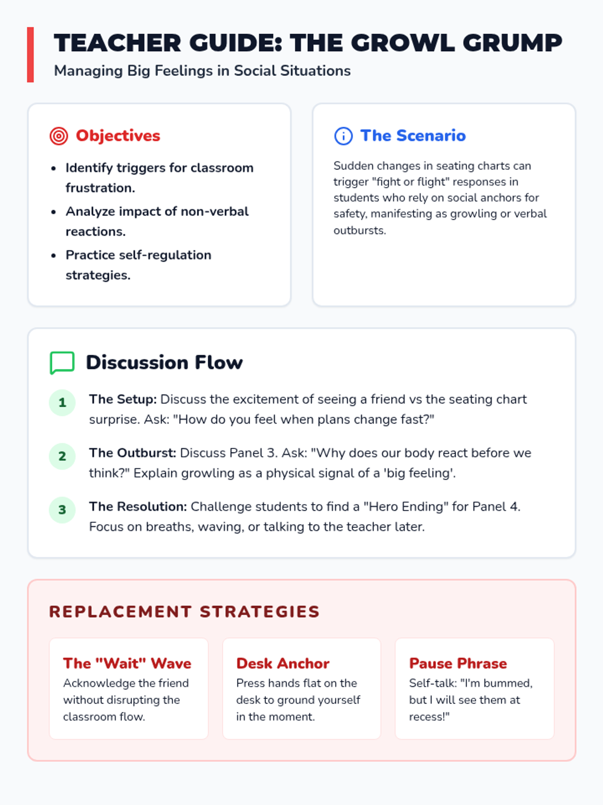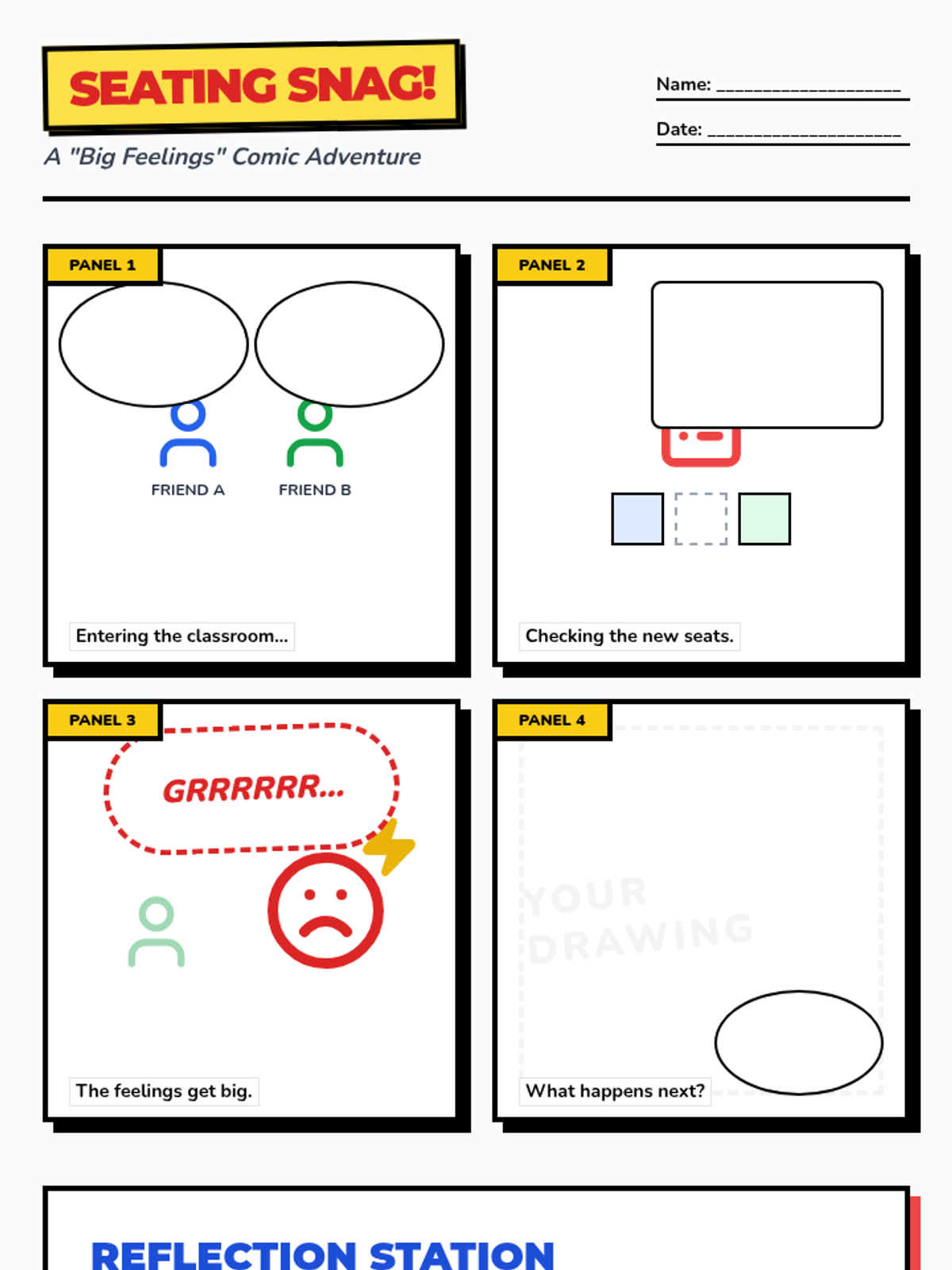 A social-emotional learning lesson focusing on identifying and managing frustration when things don't go as planned in the classroom, using a comic strip scenario.