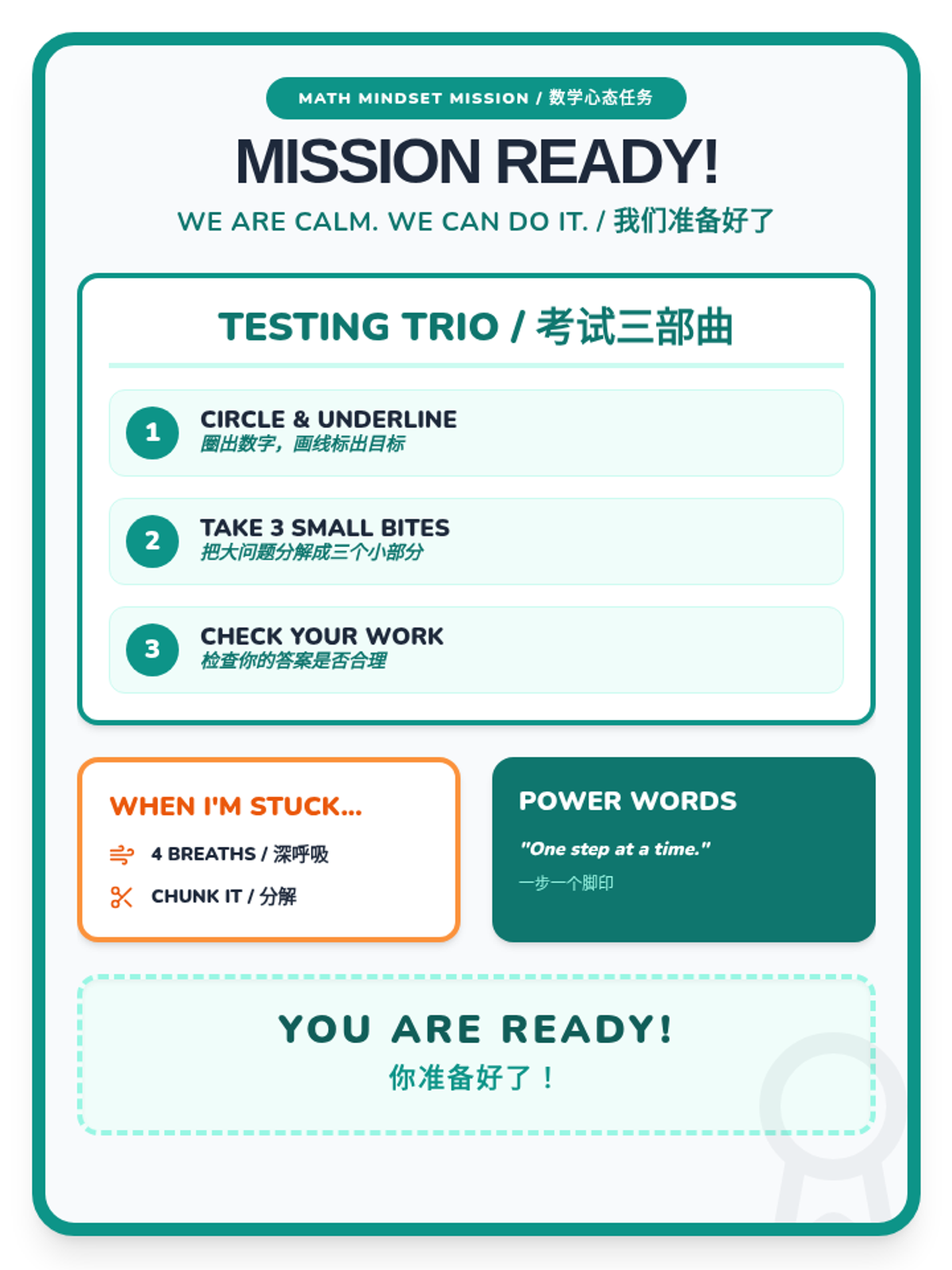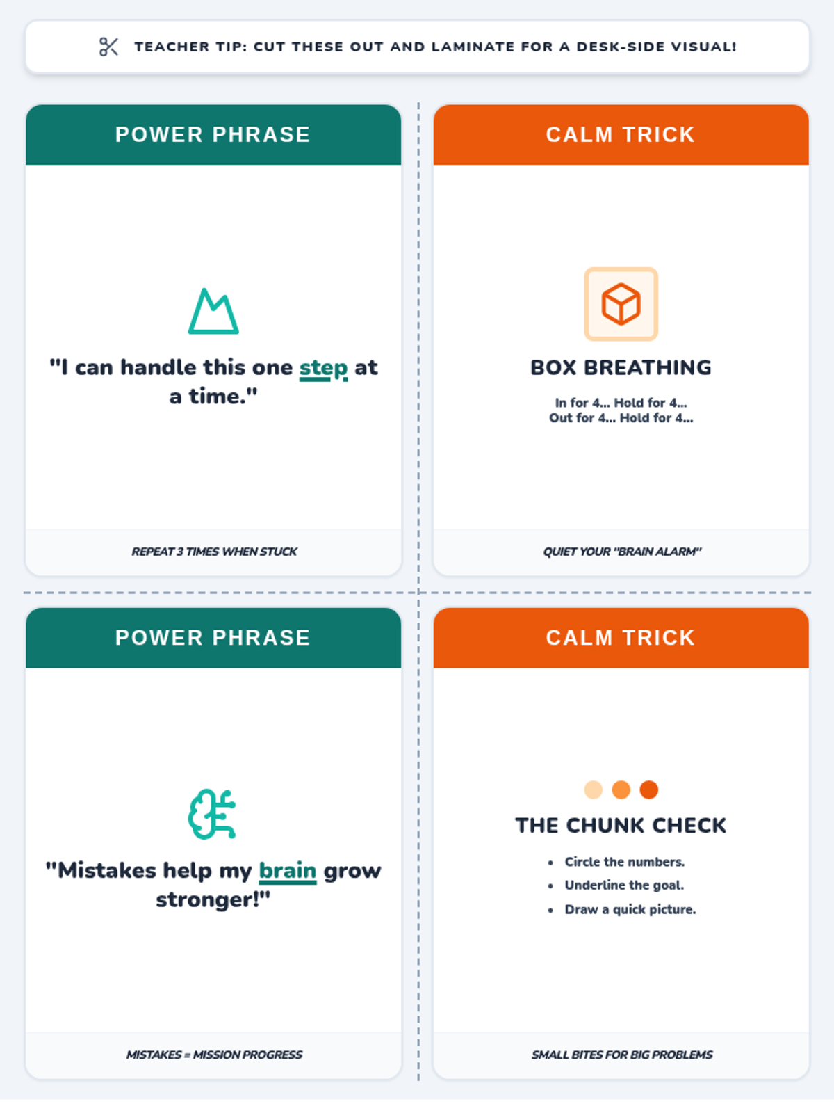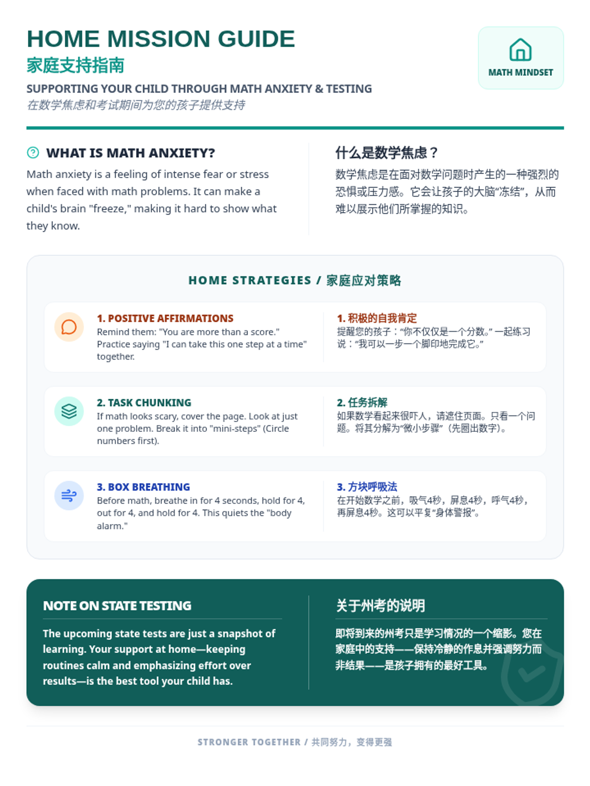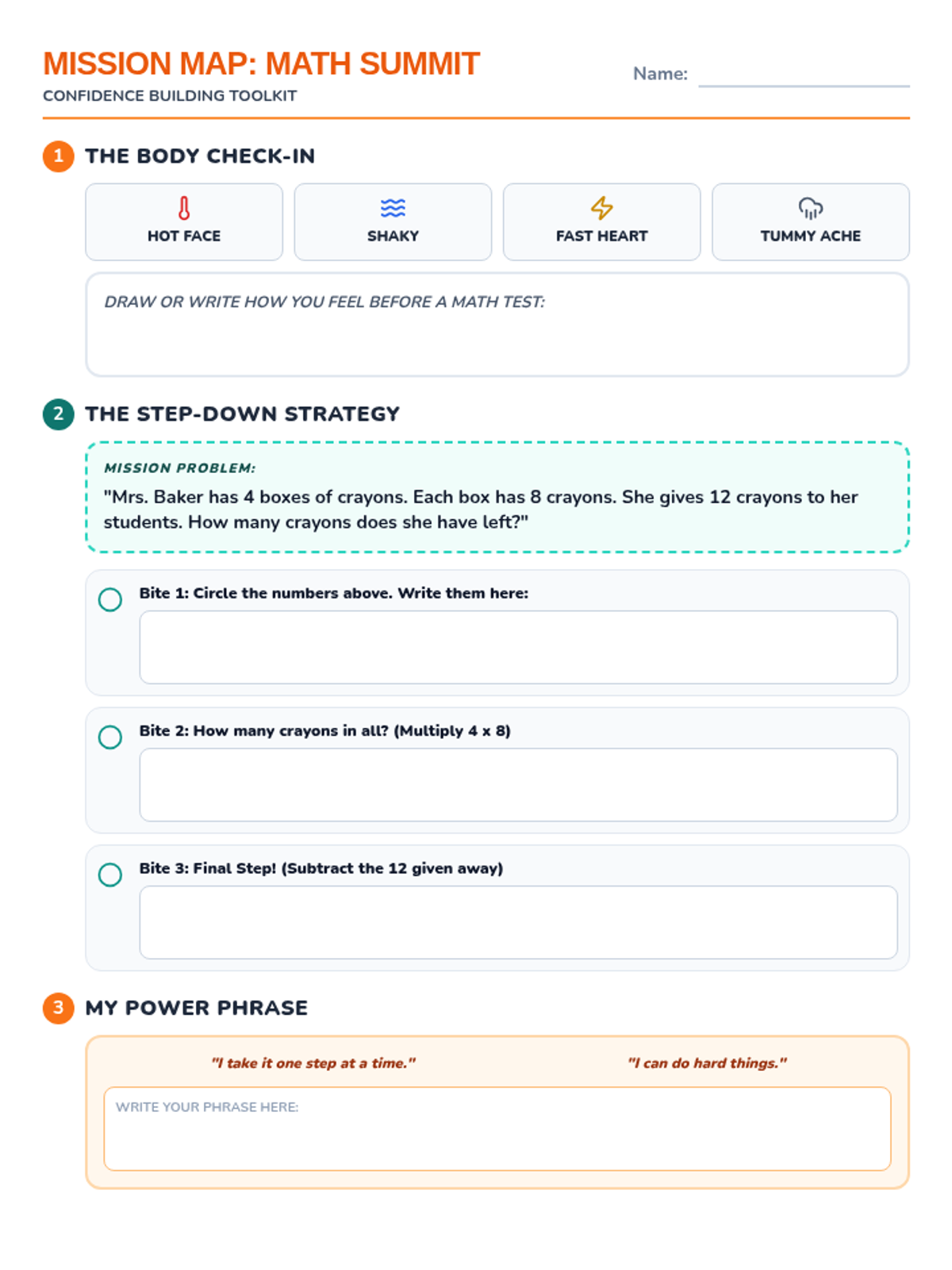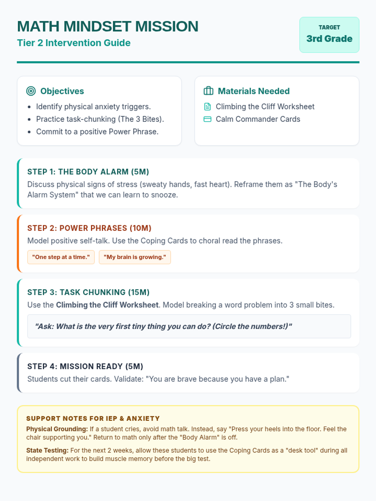 A Tier 2 intervention lesson designed to help 3rd-grade students manage math anxiety through positive affirmations and task-chunking strategies. This lesson provides a structured approach to building confidence and emotional regulation before high-stakes testing.