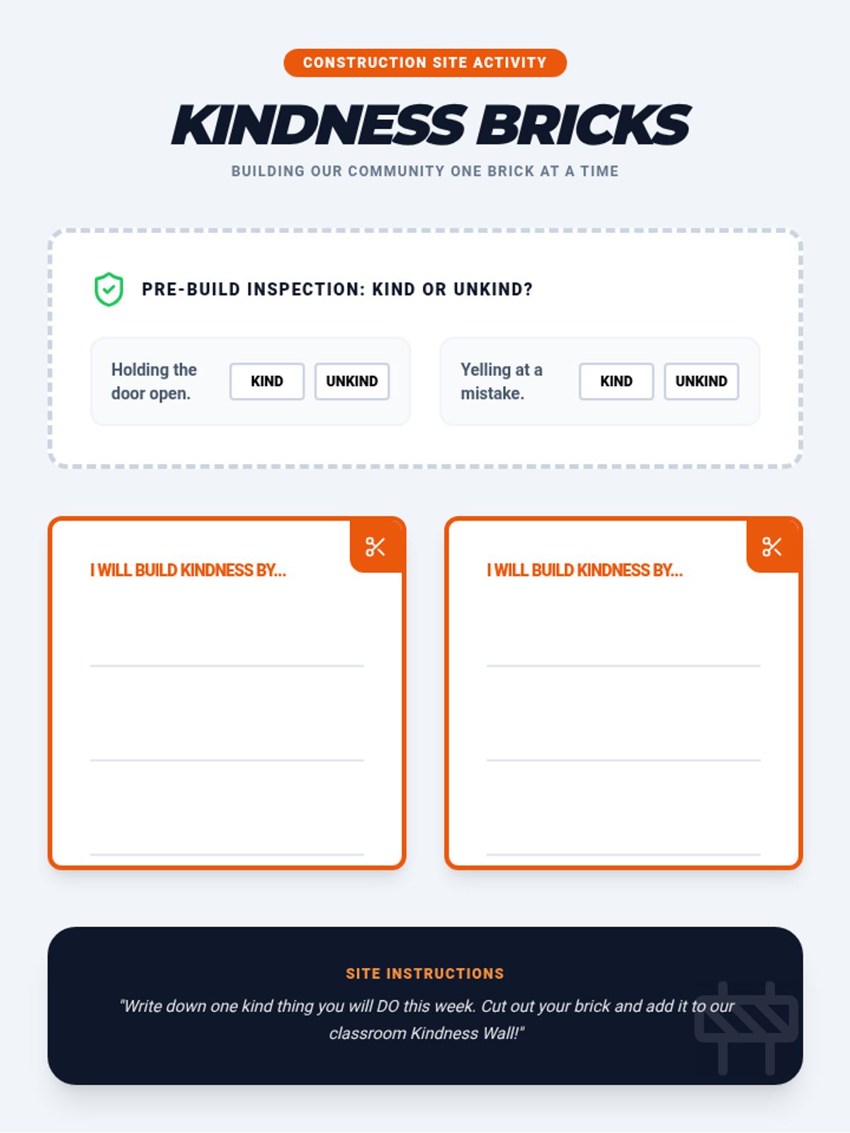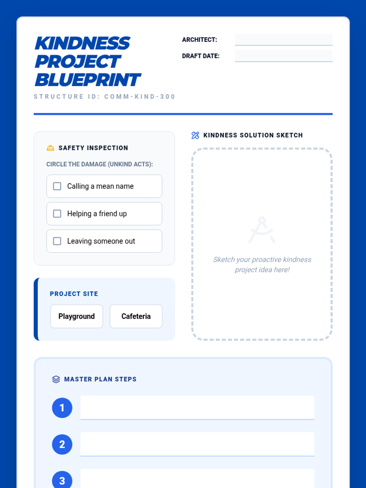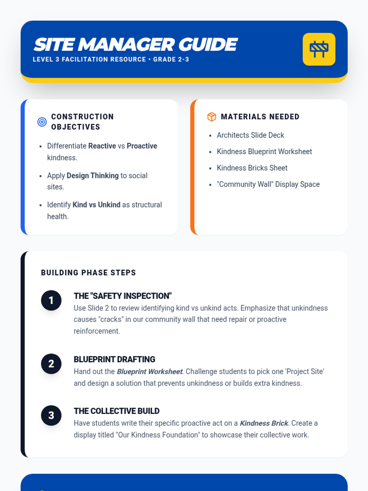 A construction-themed lesson for 2nd-3rd grade students where they transition from identifying kindness to proactively "building" it. Students use blueprints to design solutions for social challenges and participate in a collective building project.