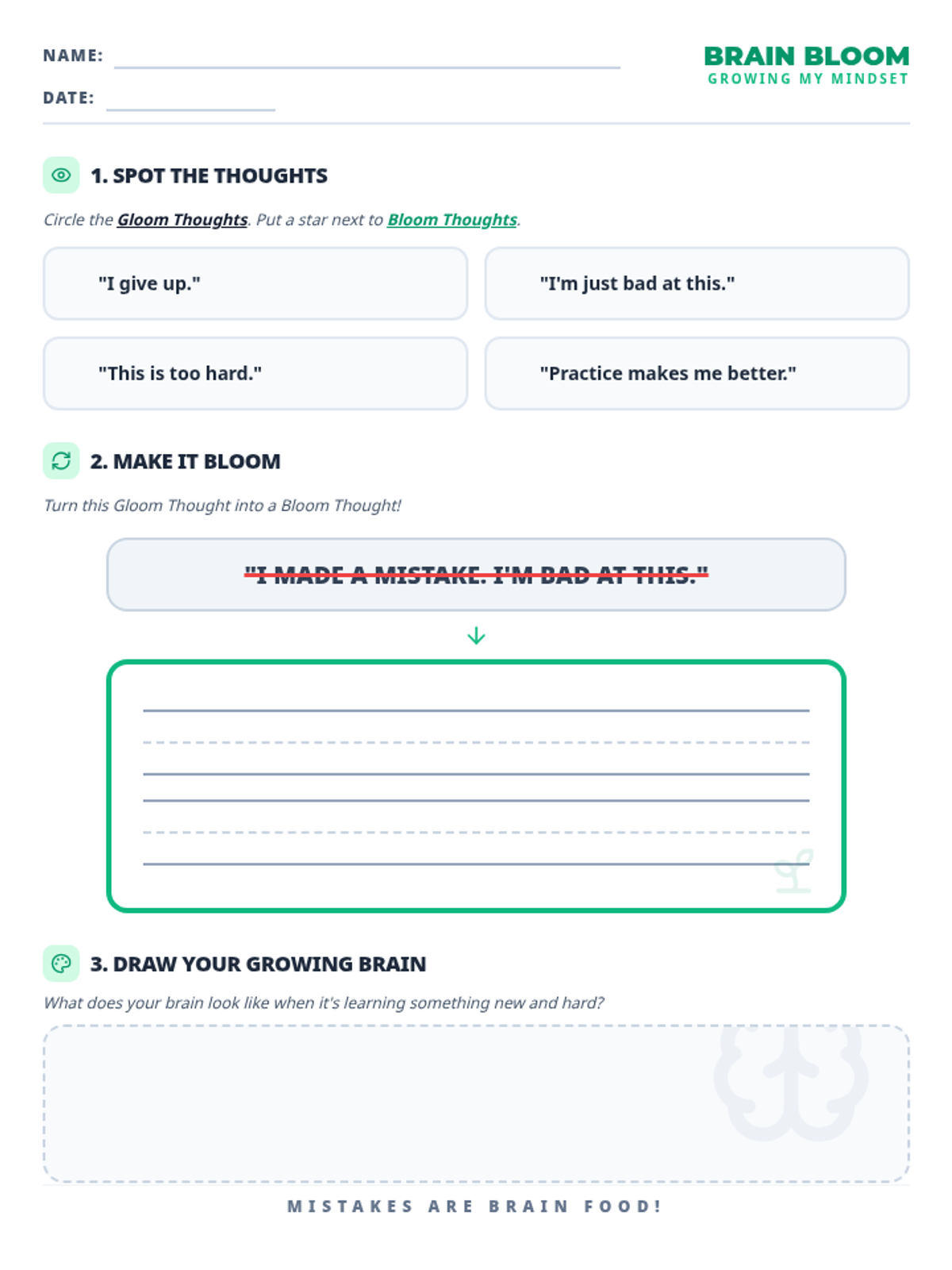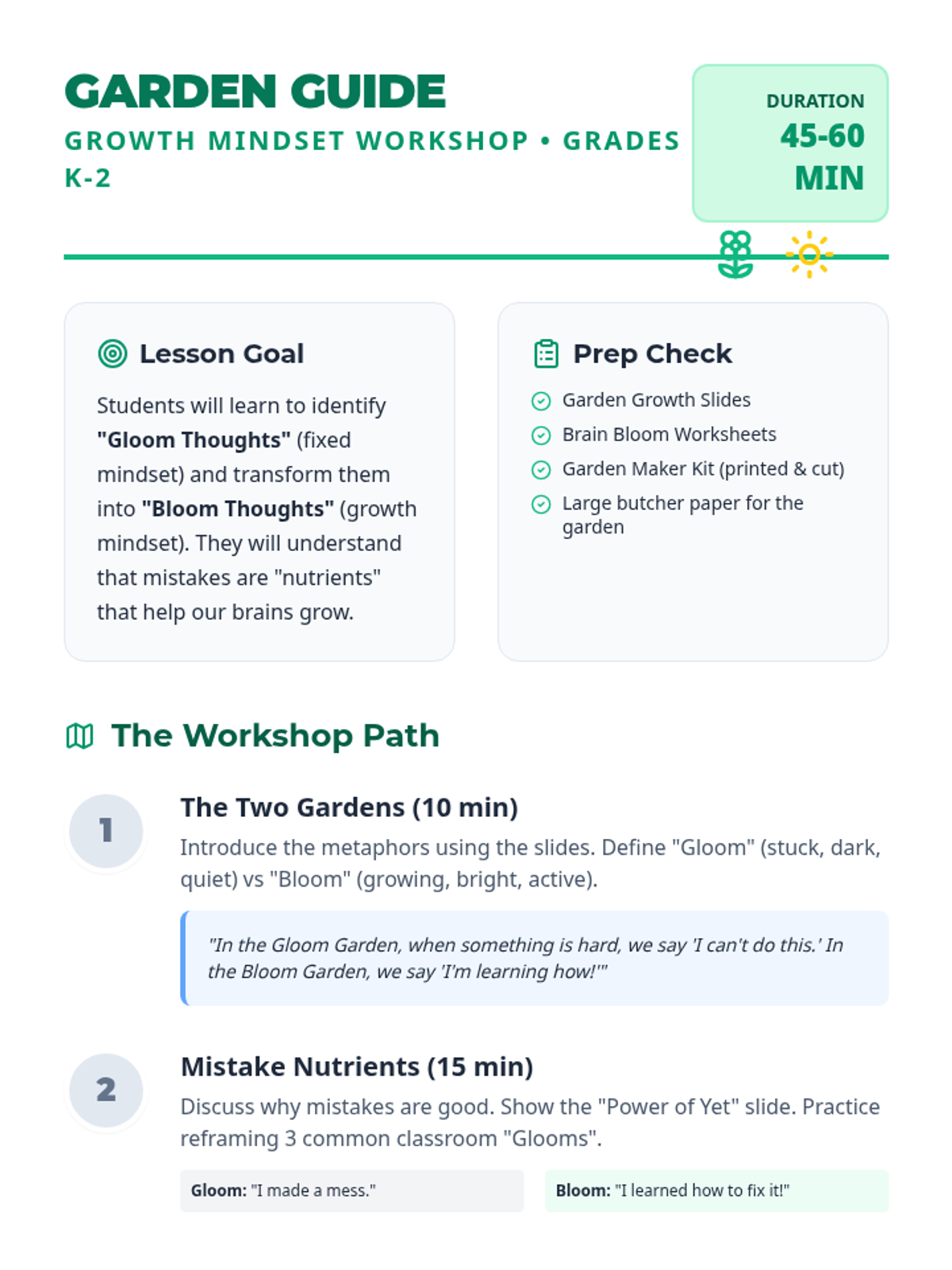 A growth mindset workshop for grades K-2 focused on distinguishing between fixed 'gloom' thoughts and growth 'bloom' thoughts. Students practice reframing mistakes and building a collaborative classroom garden.