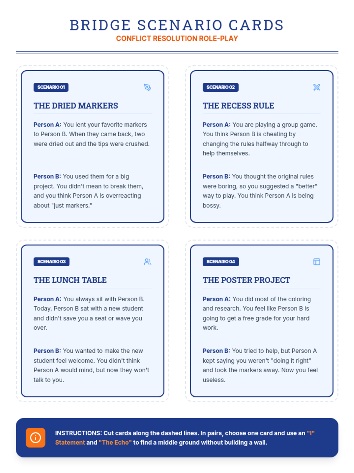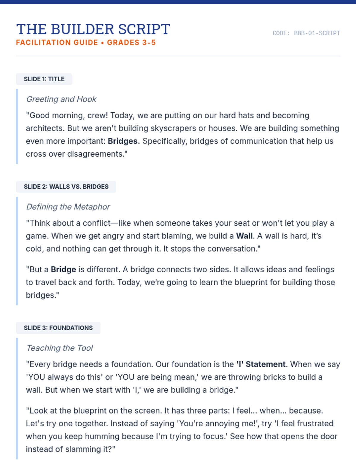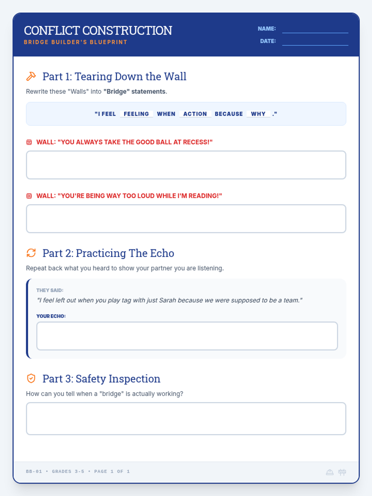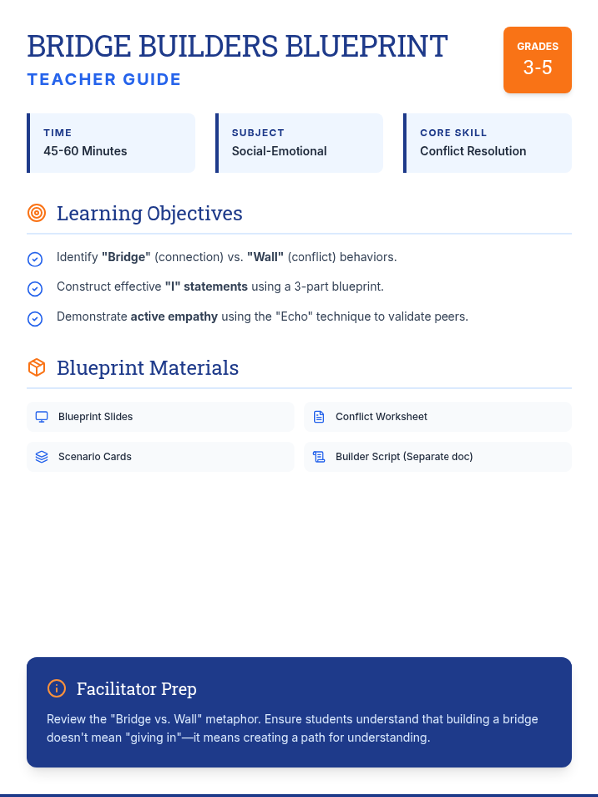 A comprehensive lesson on conflict resolution for grades 3-5, using the metaphor of bridge-building to teach "I" statements, empathy, and compromise.
