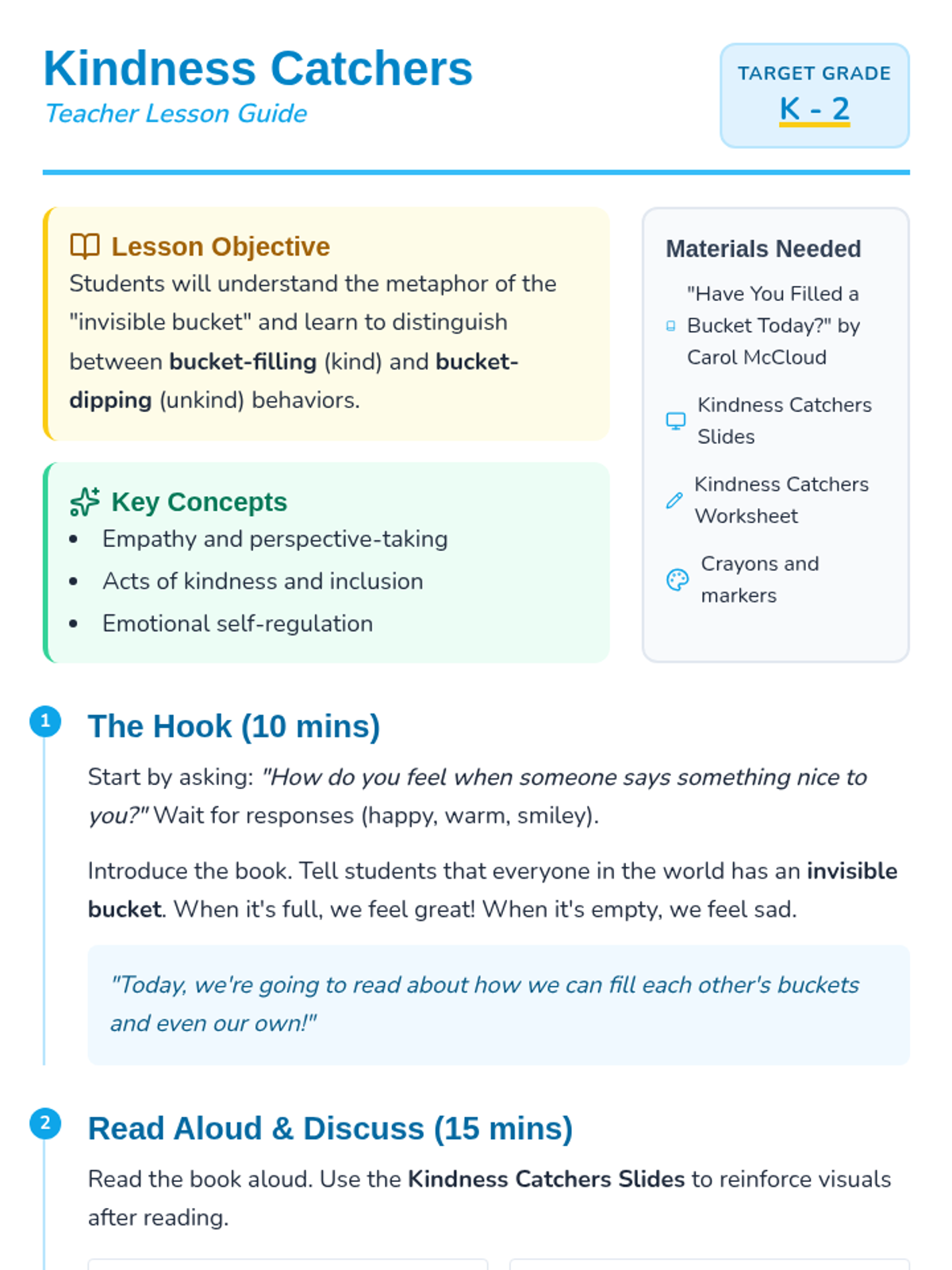A social-emotional learning lesson for K-2 students based on the book 'Have You Filled a Bucket Today?' by Carol McCloud, focusing on kindness and empathy.