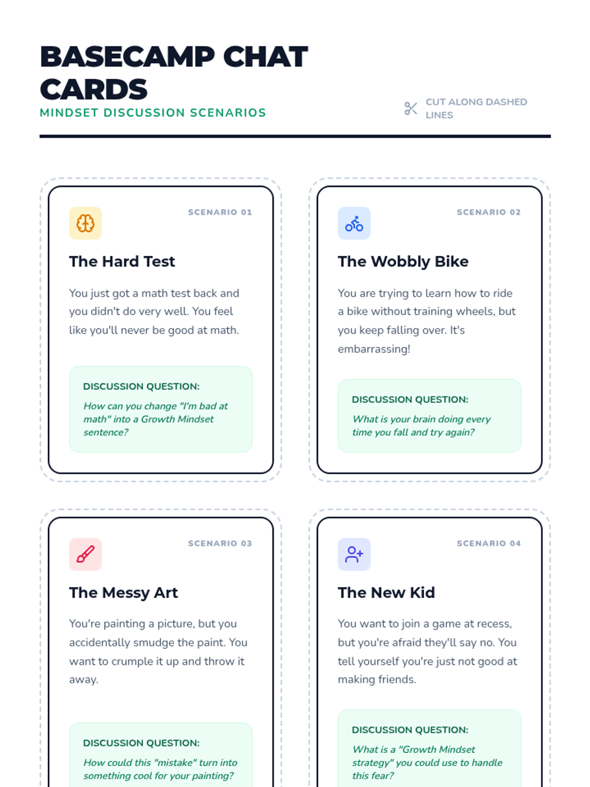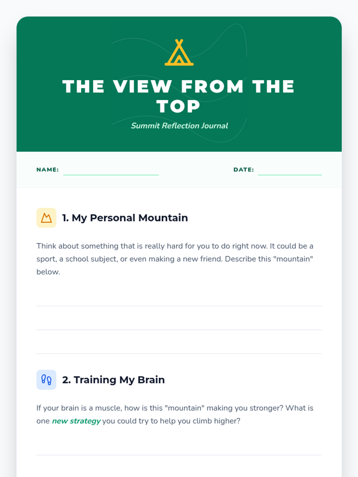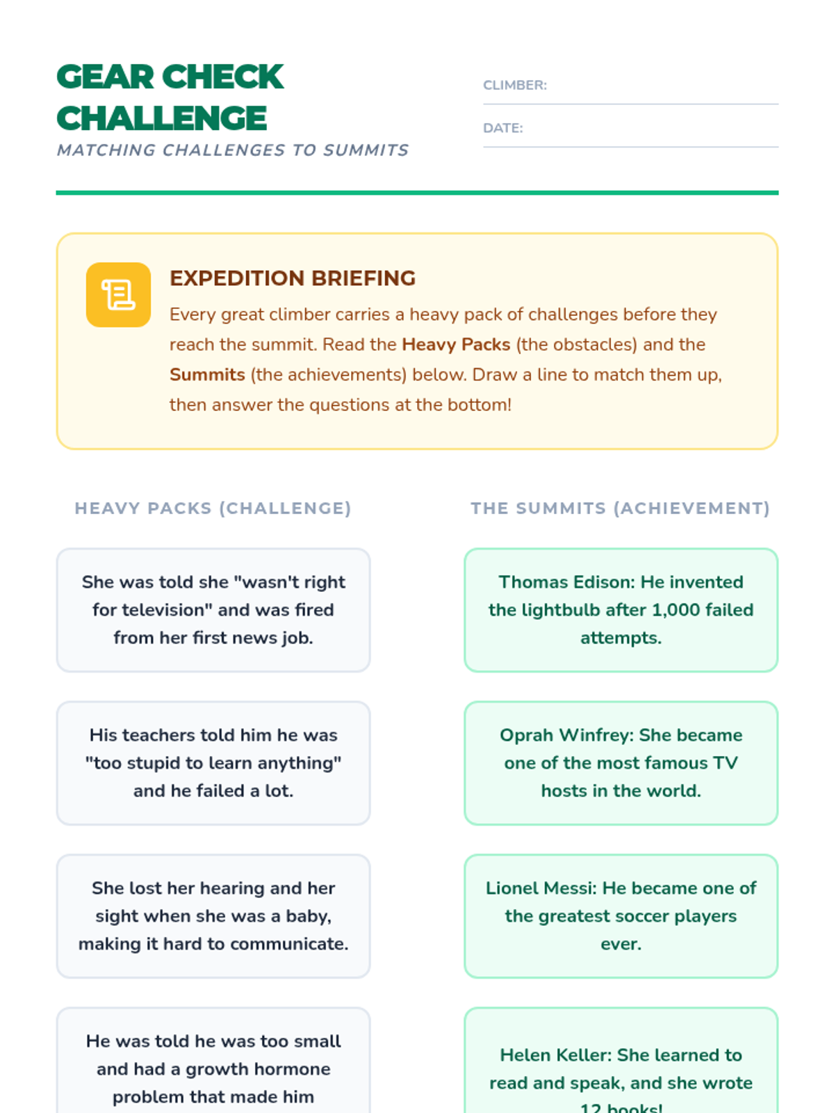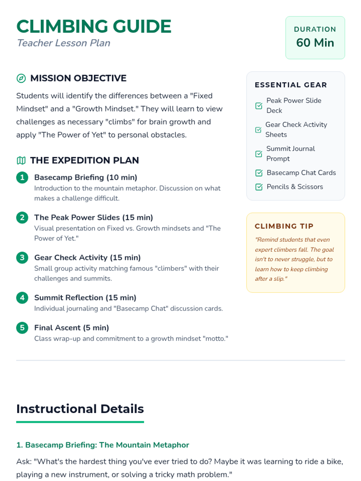 A comprehensive lesson introducing 3rd-5th graders to growth mindset through the metaphor of climbing a mountain, featuring resilience strategies and stories of perseverance.
