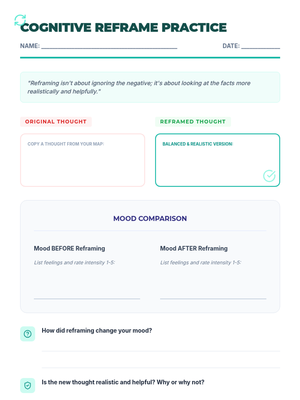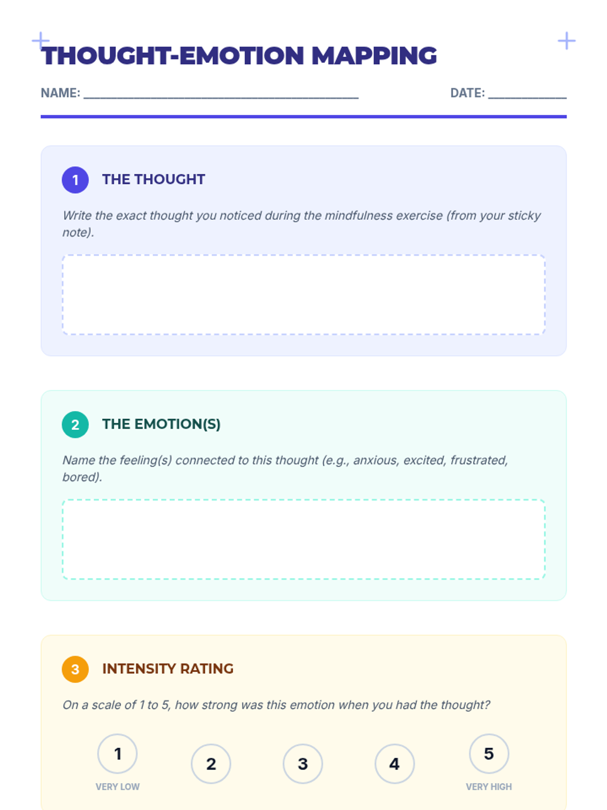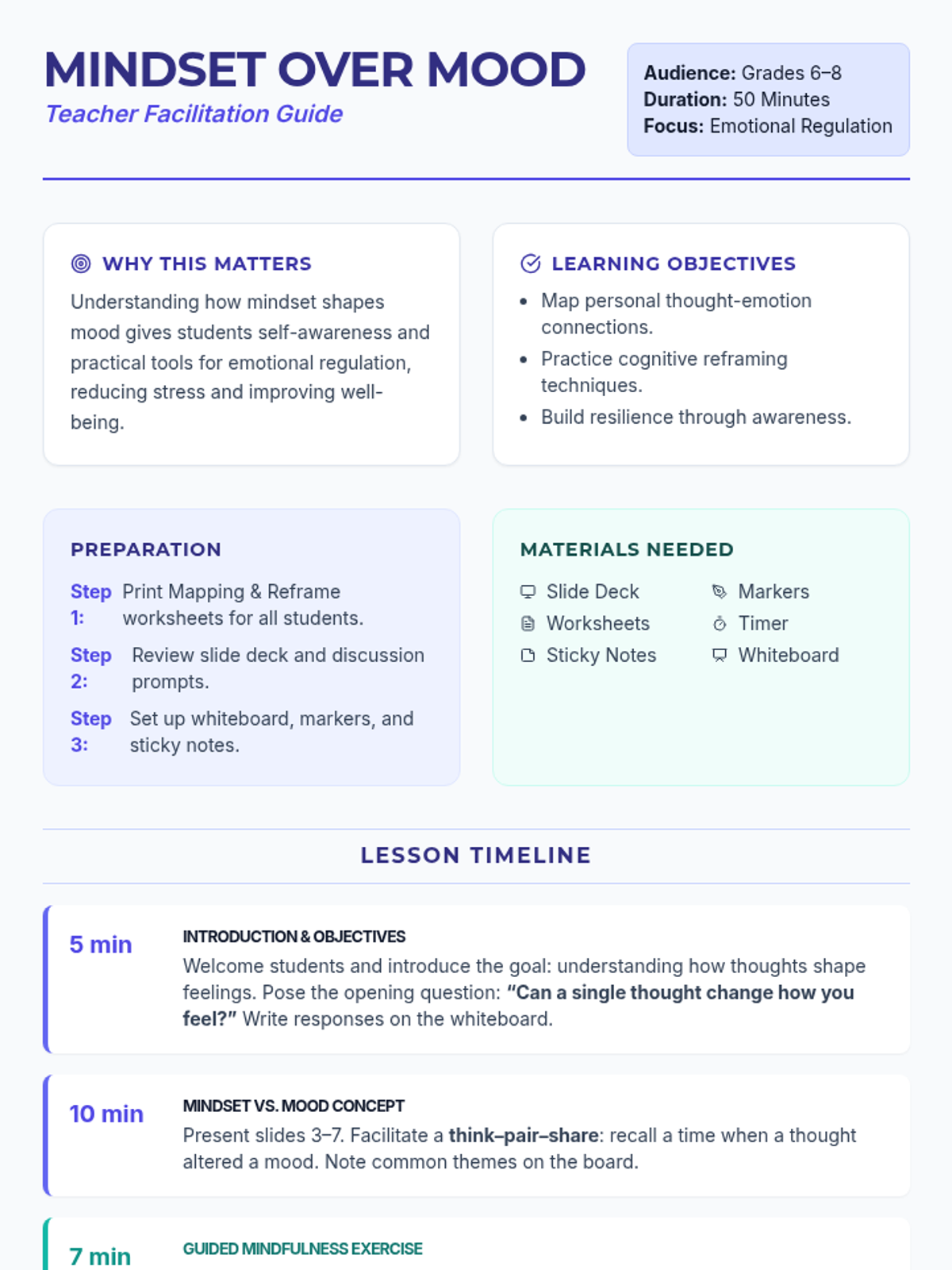 A 50-minute lesson for middle schoolers exploring the connection between thoughts and emotions, featuring mindfulness exercises and cognitive reframing techniques.