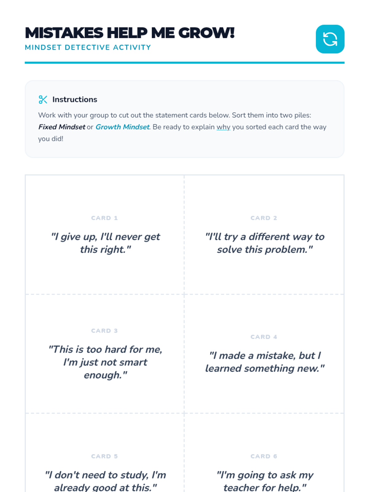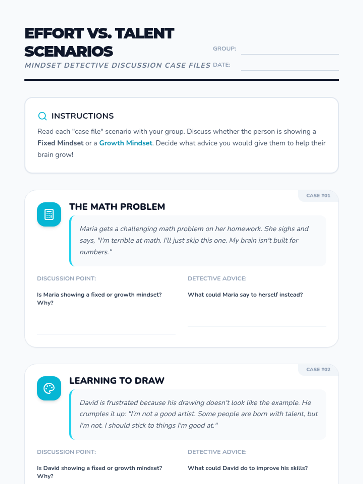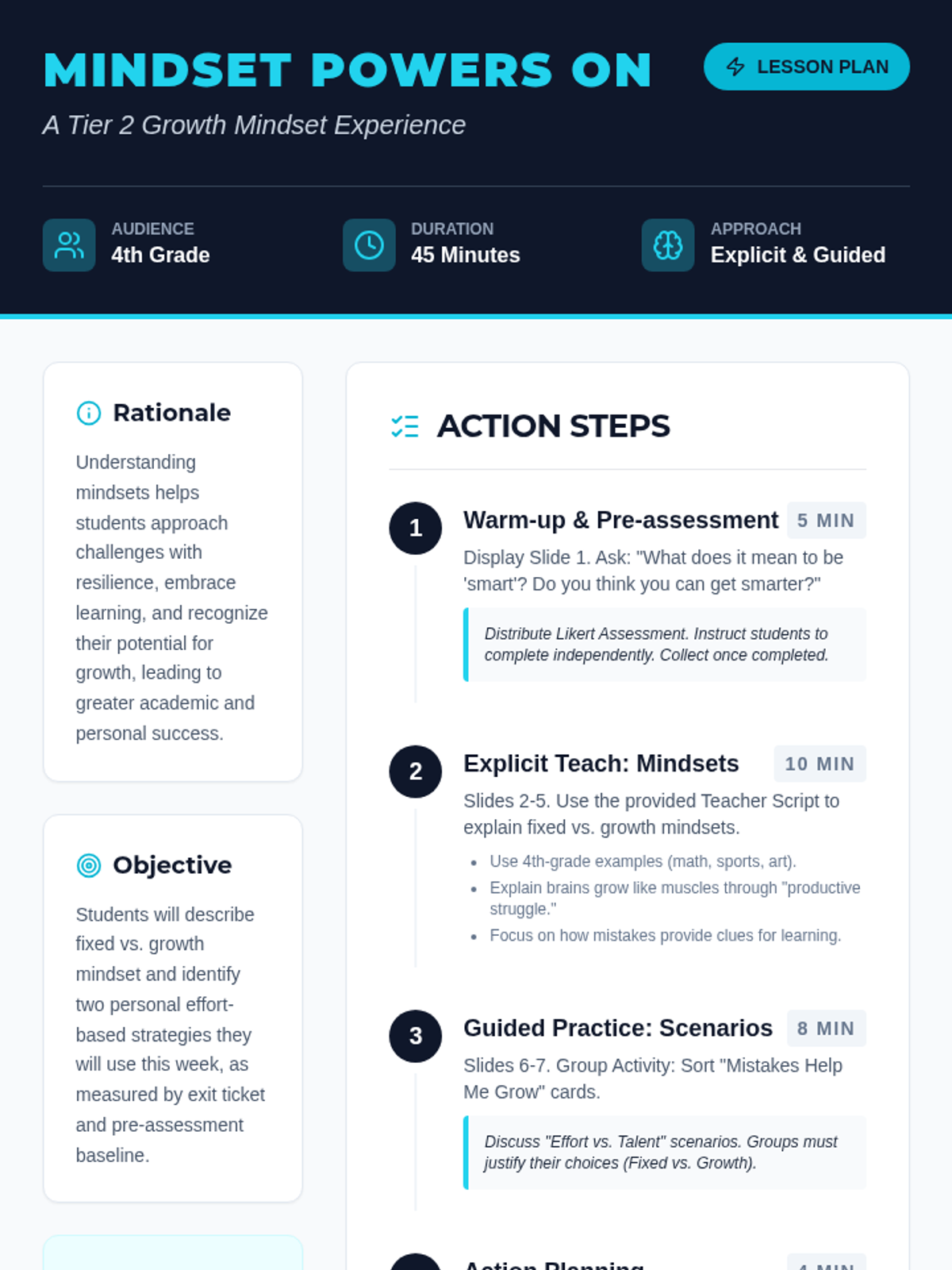 A comprehensive 45-minute lesson for 4th graders exploring the difference between fixed and growth mindsets through interactive scenarios, card sorting, and personal strategy planning.