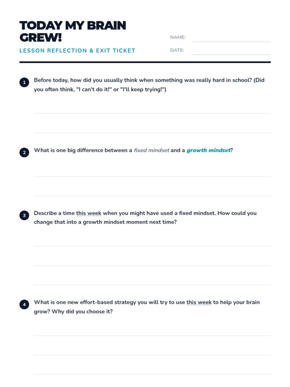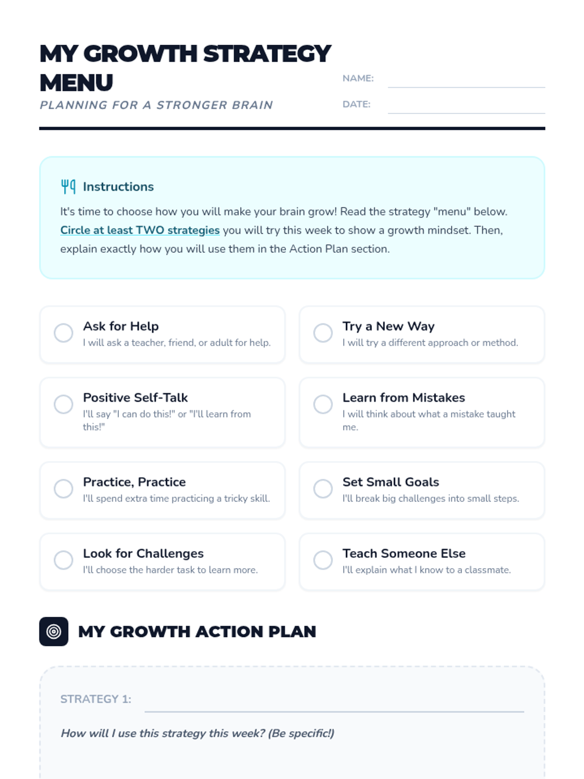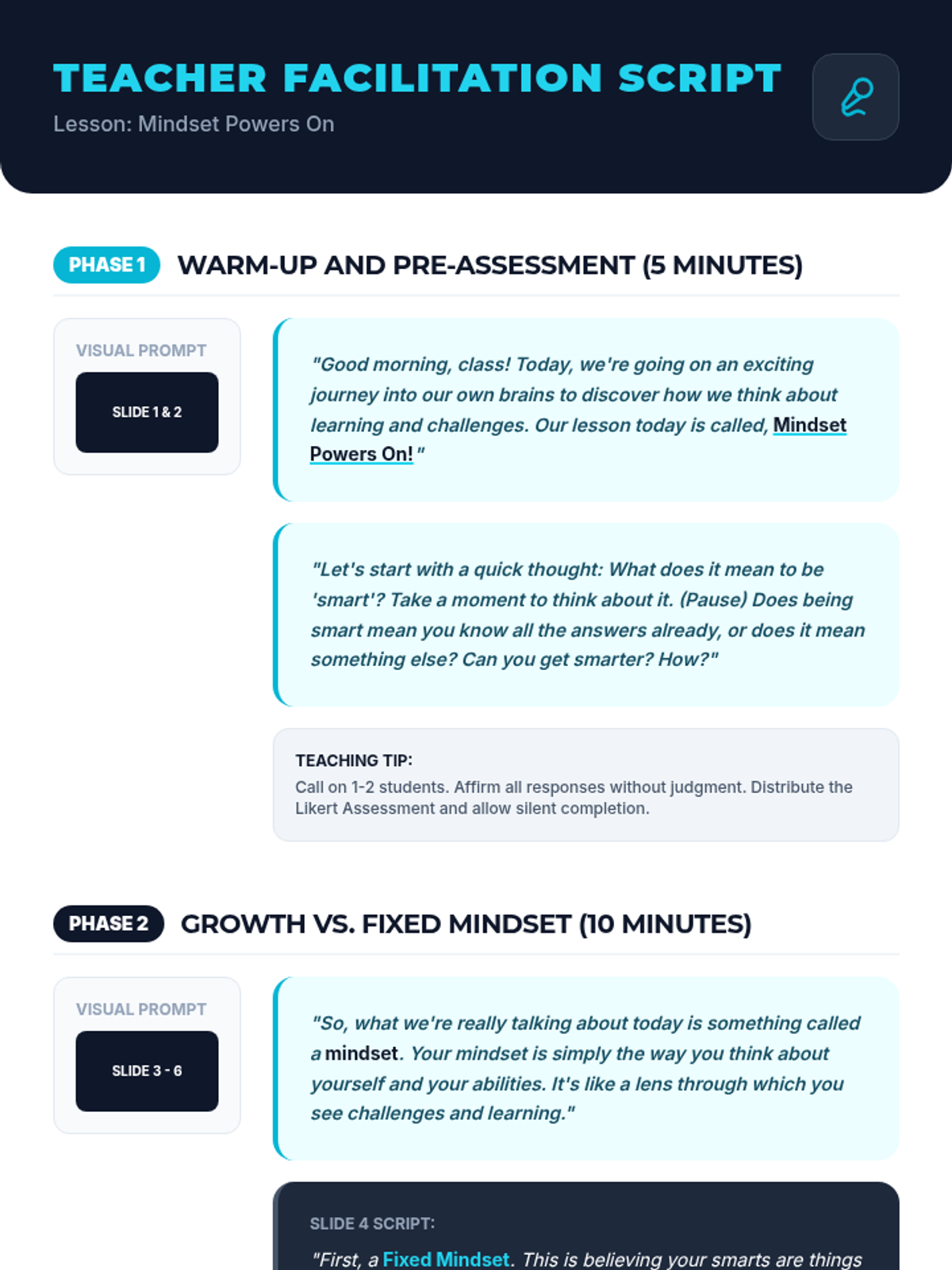 A comprehensive 45-minute lesson for 4th graders exploring the difference between fixed and growth mindsets through interactive scenarios, card sorting, and personal strategy planning.