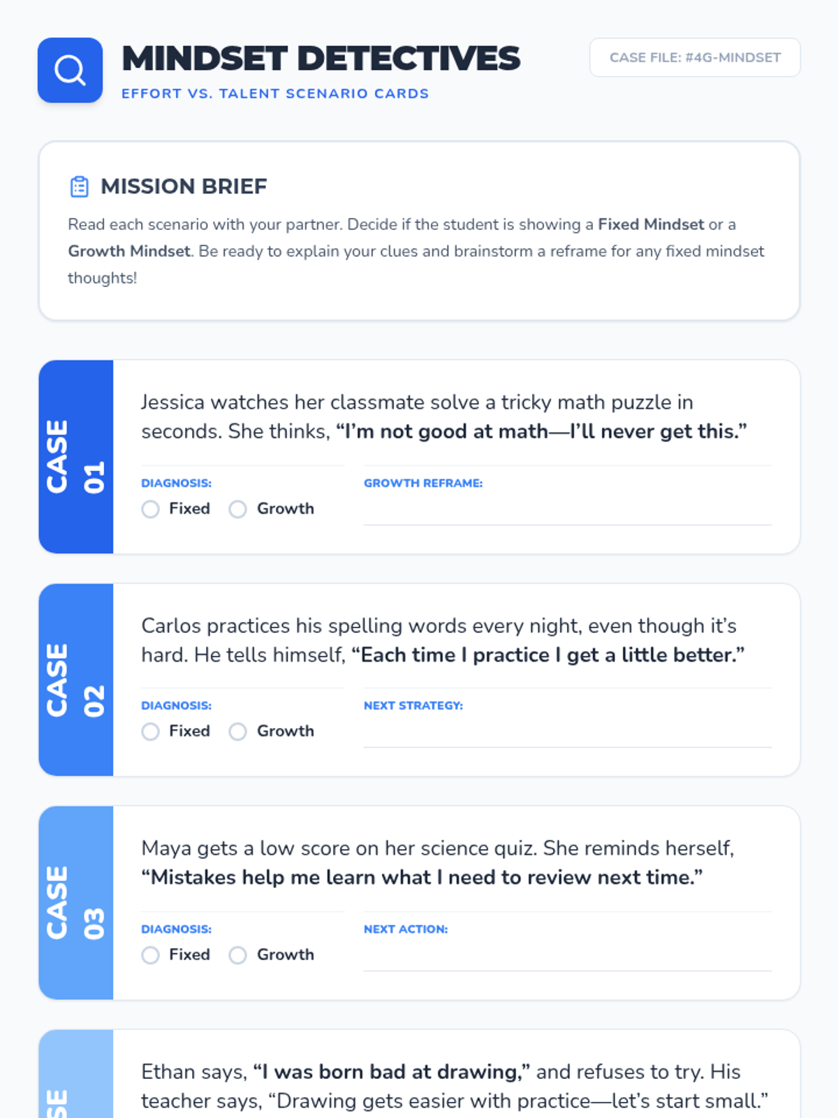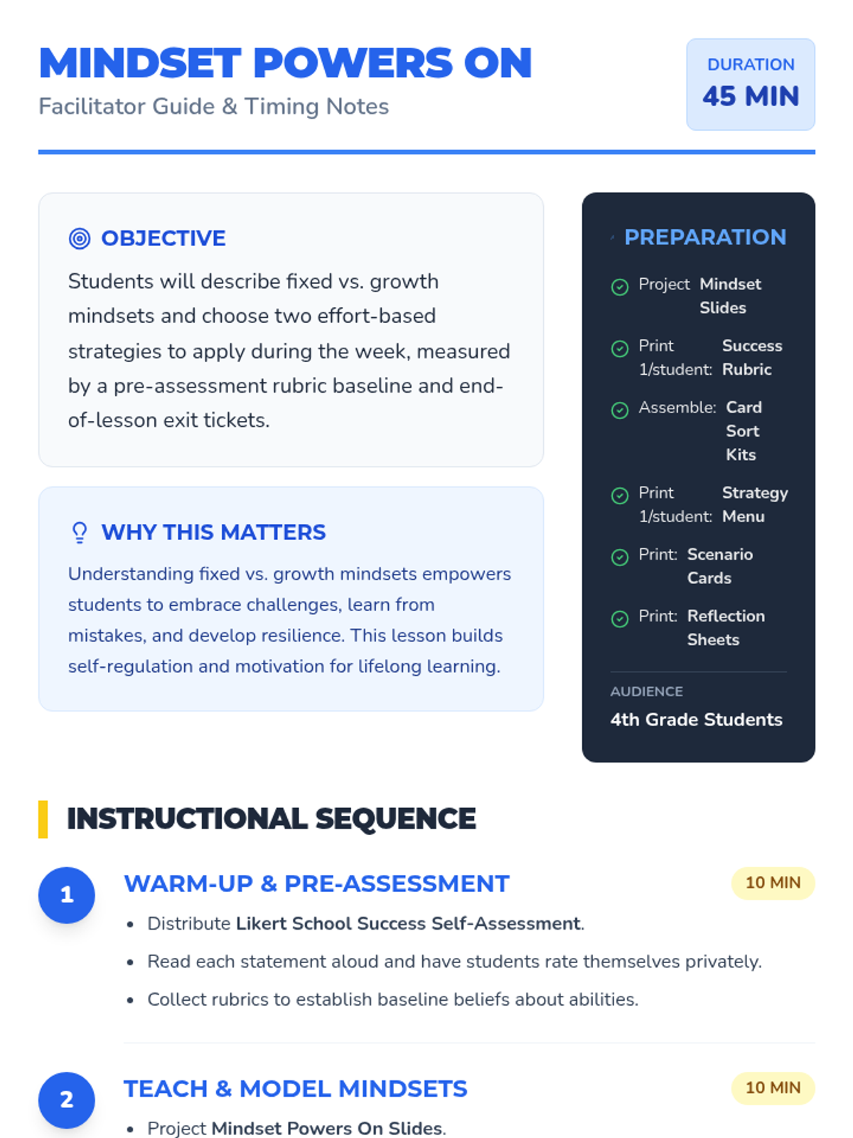 In this engaging 4th grade lesson, students learn to distinguish between fixed and growth mindsets and plan personal effort-based strategies to boost learning all week. This lesson is vital for building resilience and self-regulation skills in young learners.
