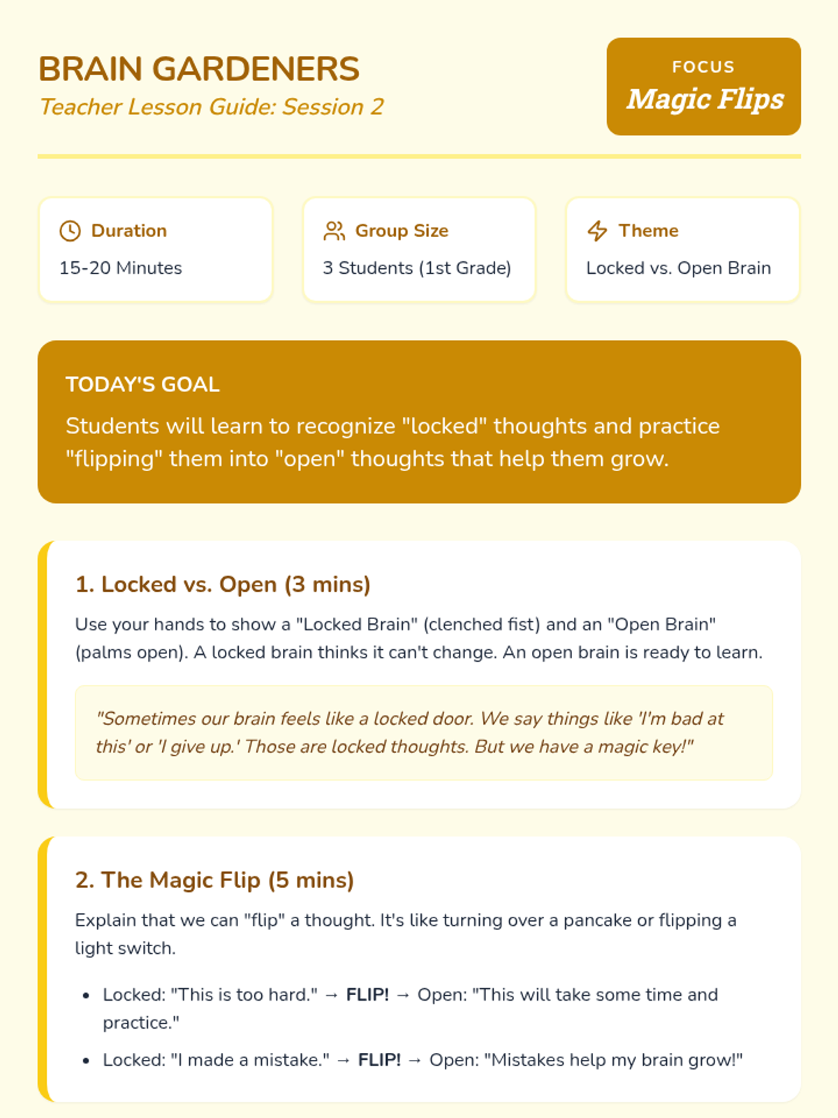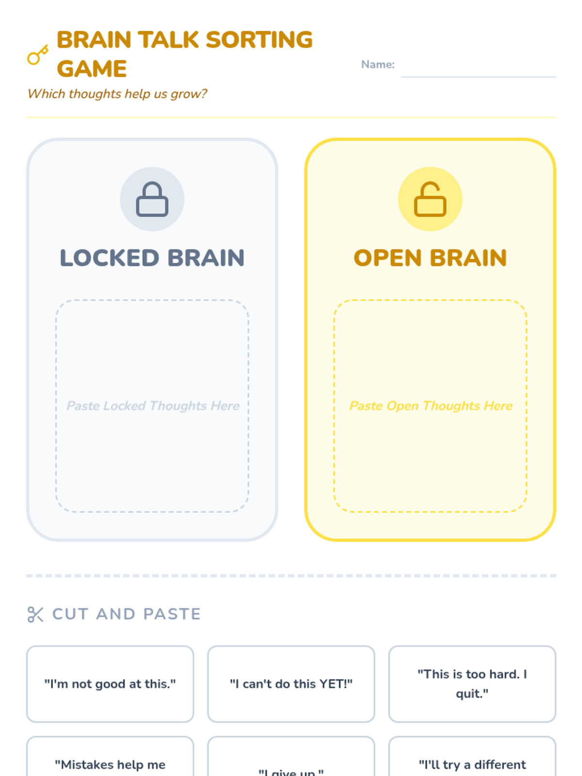 Focusing on identifying 'Fixed' vs 'Growth' thoughts and practicing how to flip negative internal talk into positive, encouraging mindset shifts.