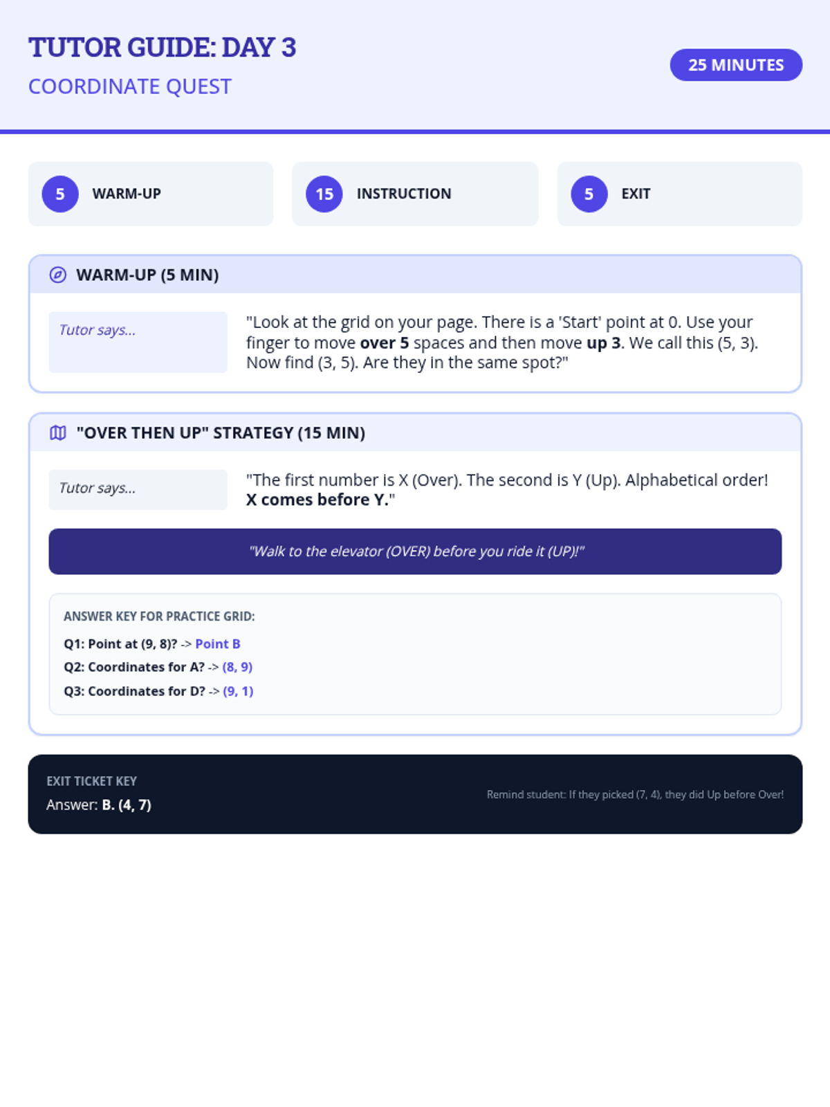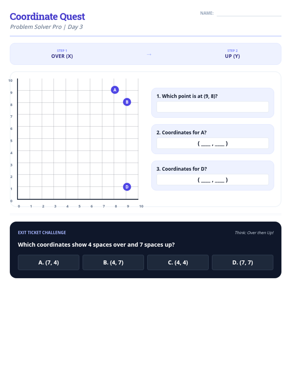 Introduces and reinforces the use of coordinate planes, focusing on identifying (x, y) coordinates using the 'over then up' strategy.