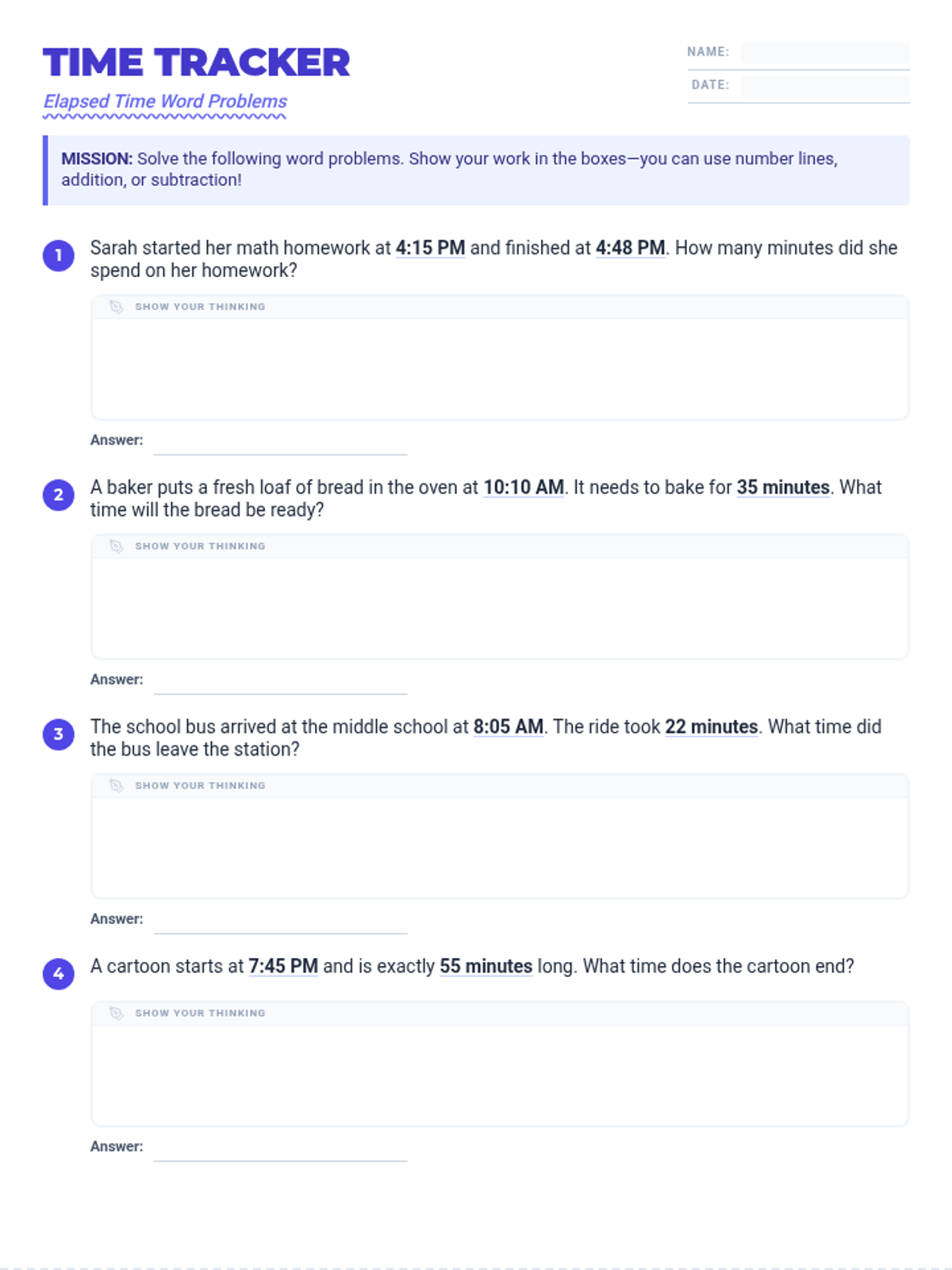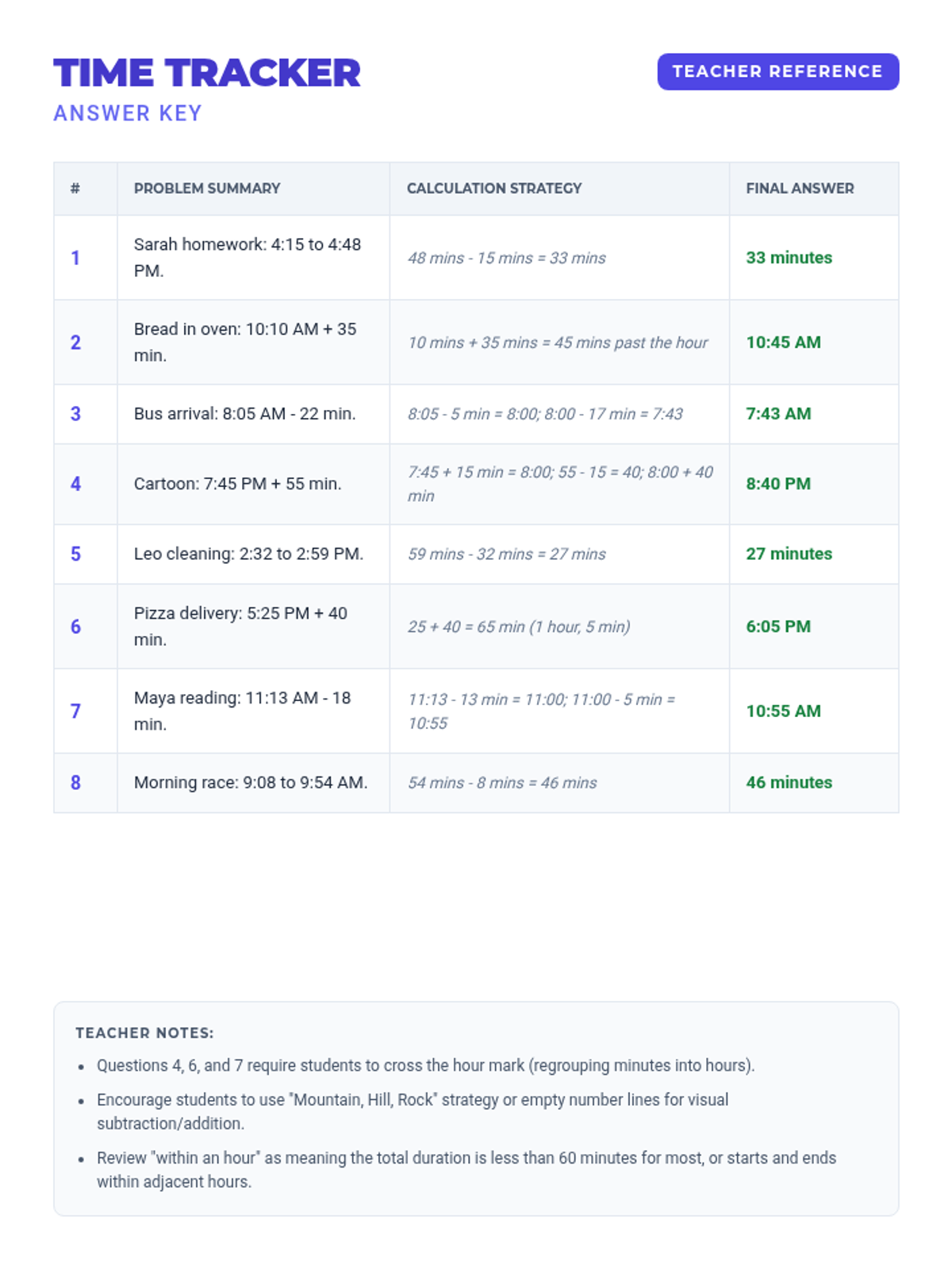 A practice-focused lesson on calculating elapsed time within a single hour, including word problems that cover finding start times, end times, and durations.